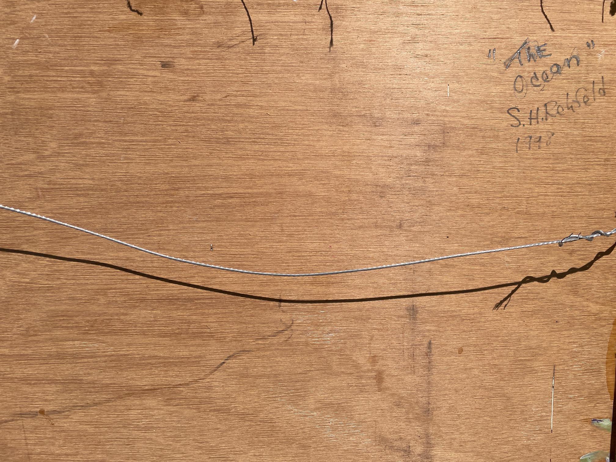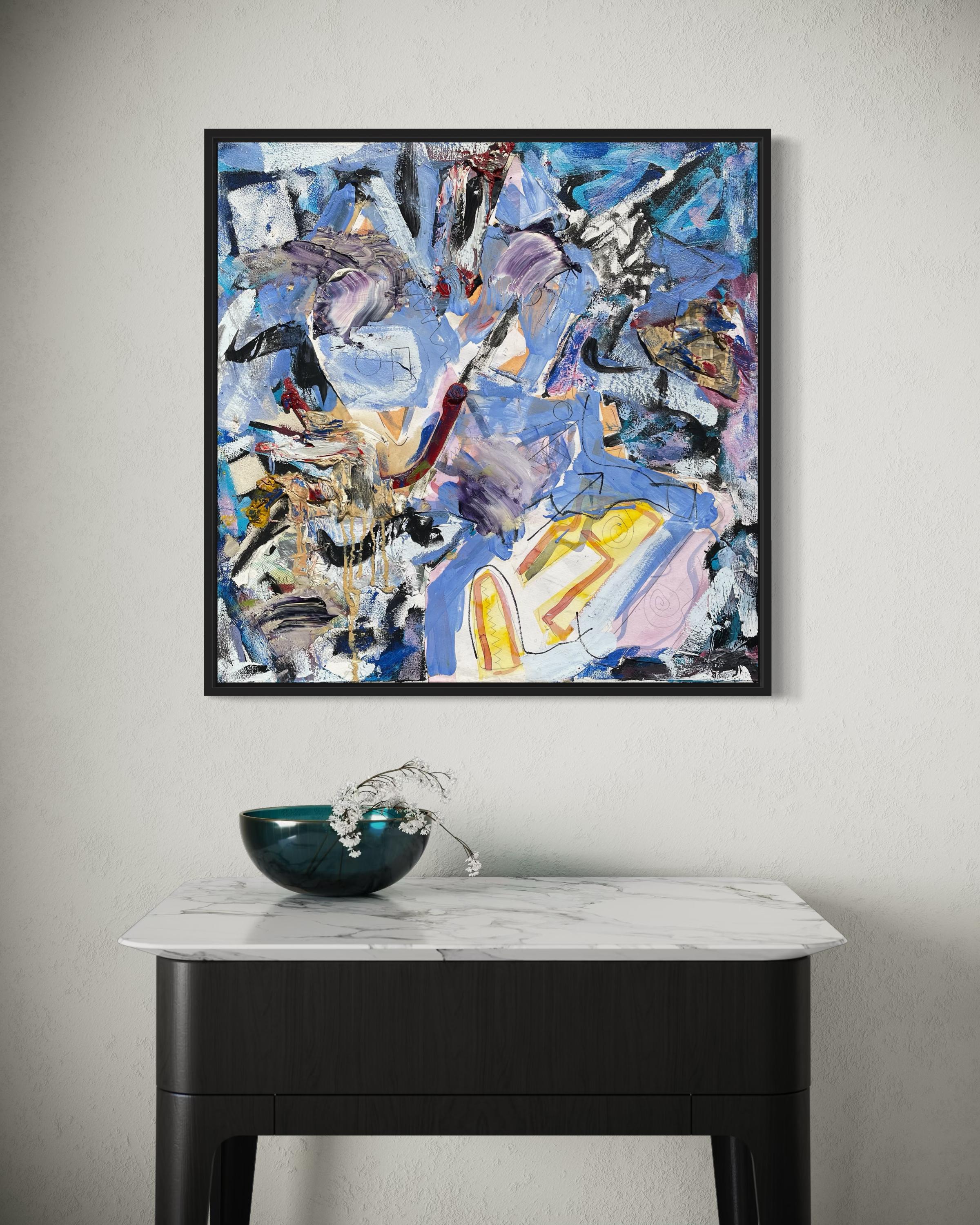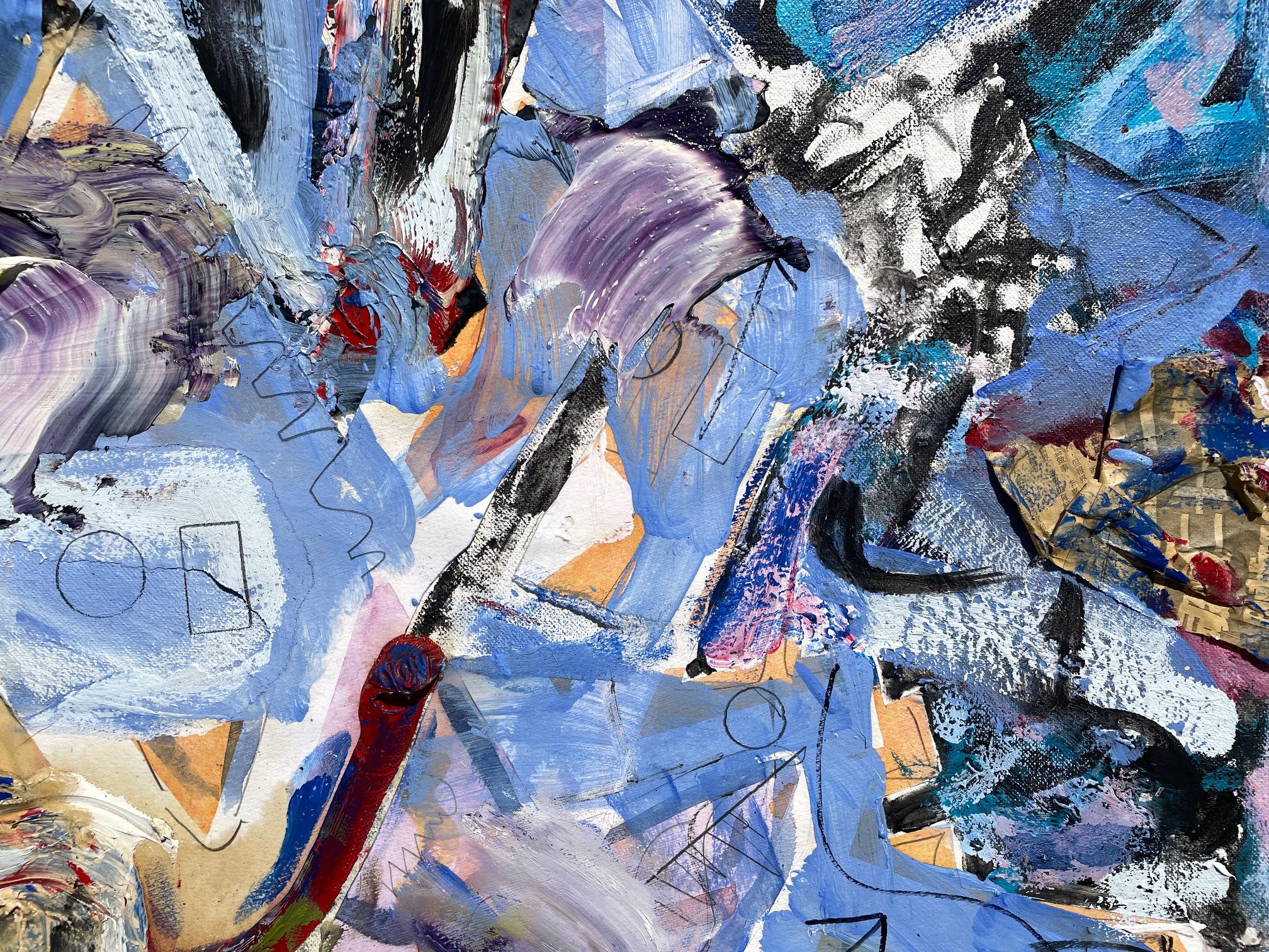 “The Ocean” is an early mixed-media work by Steven H. Rehfeld, created in 1998 and full of the raw, expressive energy that defines his practice. Layers of blue, lavender, white, and deep indigo collide with gestural marks, textured surfaces, and unexpected flashes of yellow and red. The result is a composition that feels both turbulent and luminous, echoing the movement and unpredictability of the sea. Rehfeld blends oil, collage, and vigorous line work to build a surface that rewards slow looking. Thick strokes meet delicate graphite marks, while areas of scraped paint and dripping textures add depth and atmosphere.