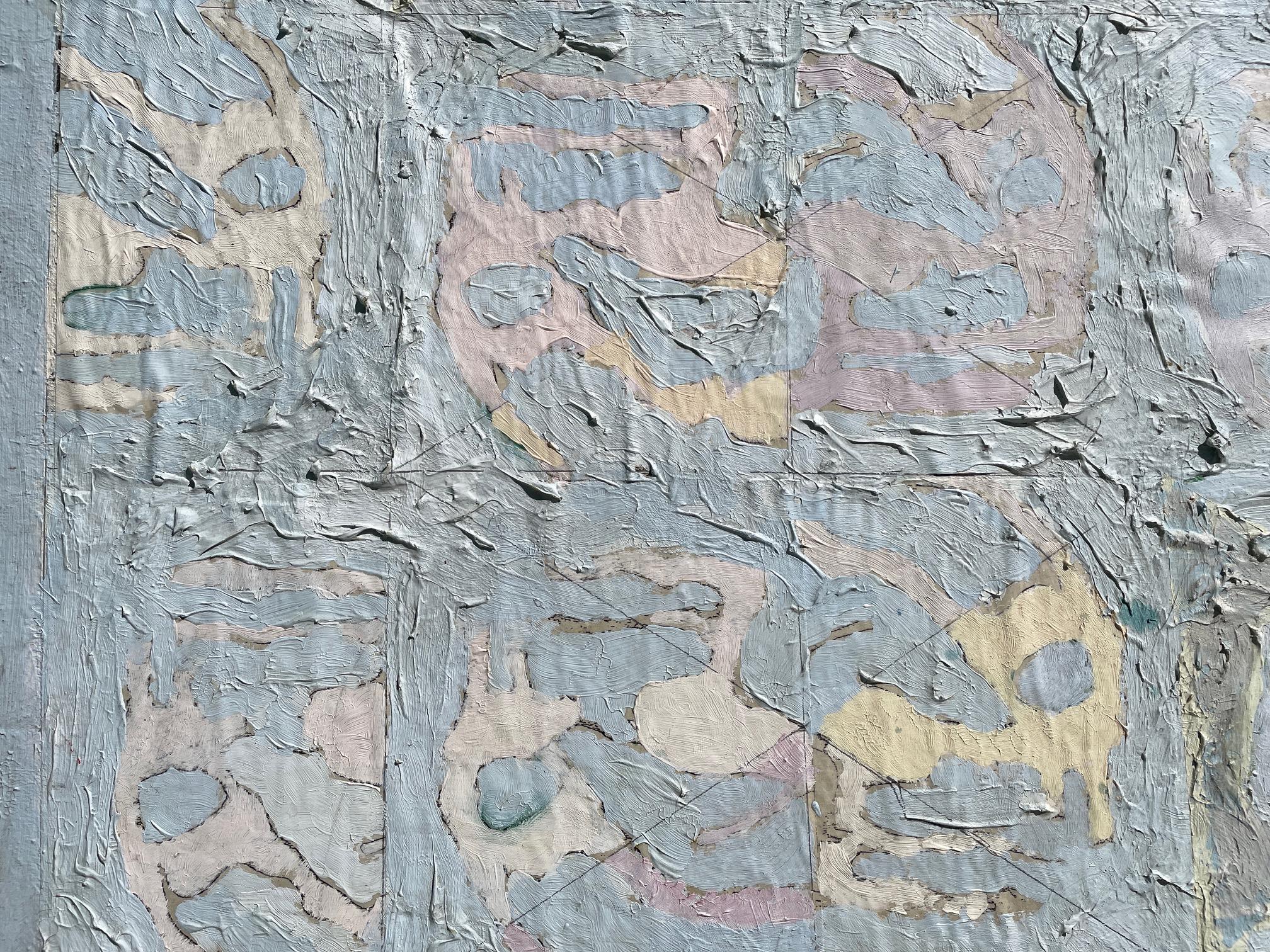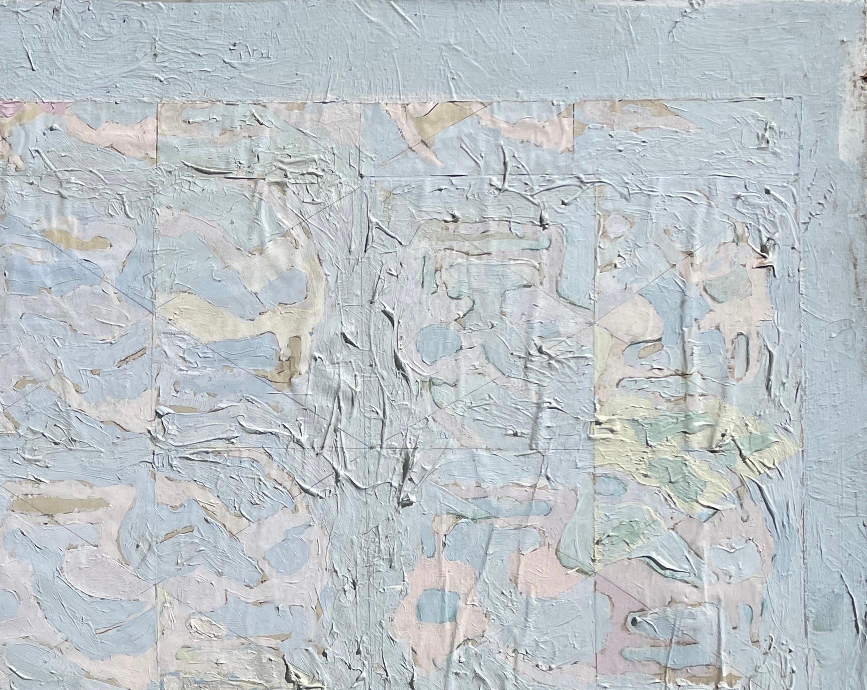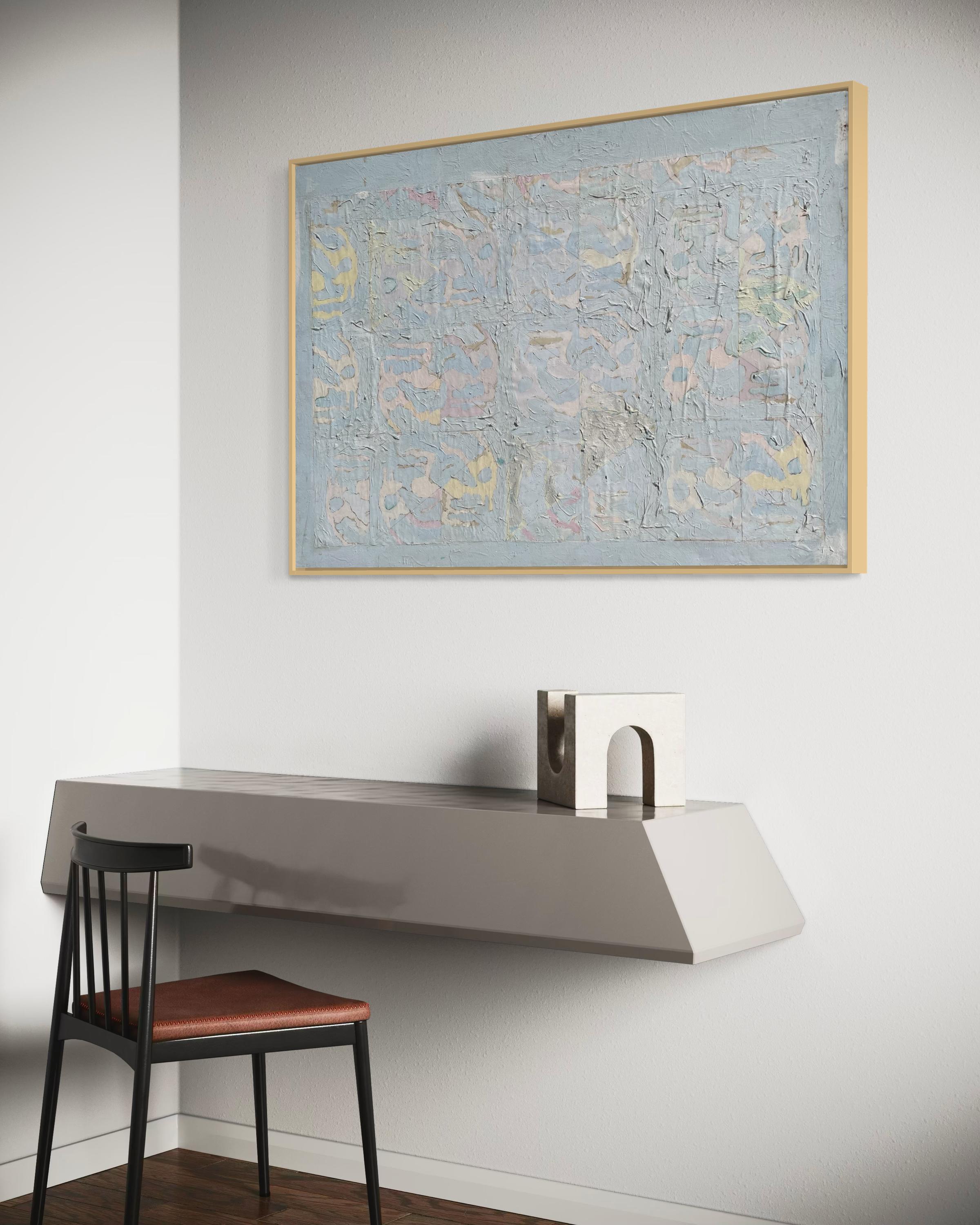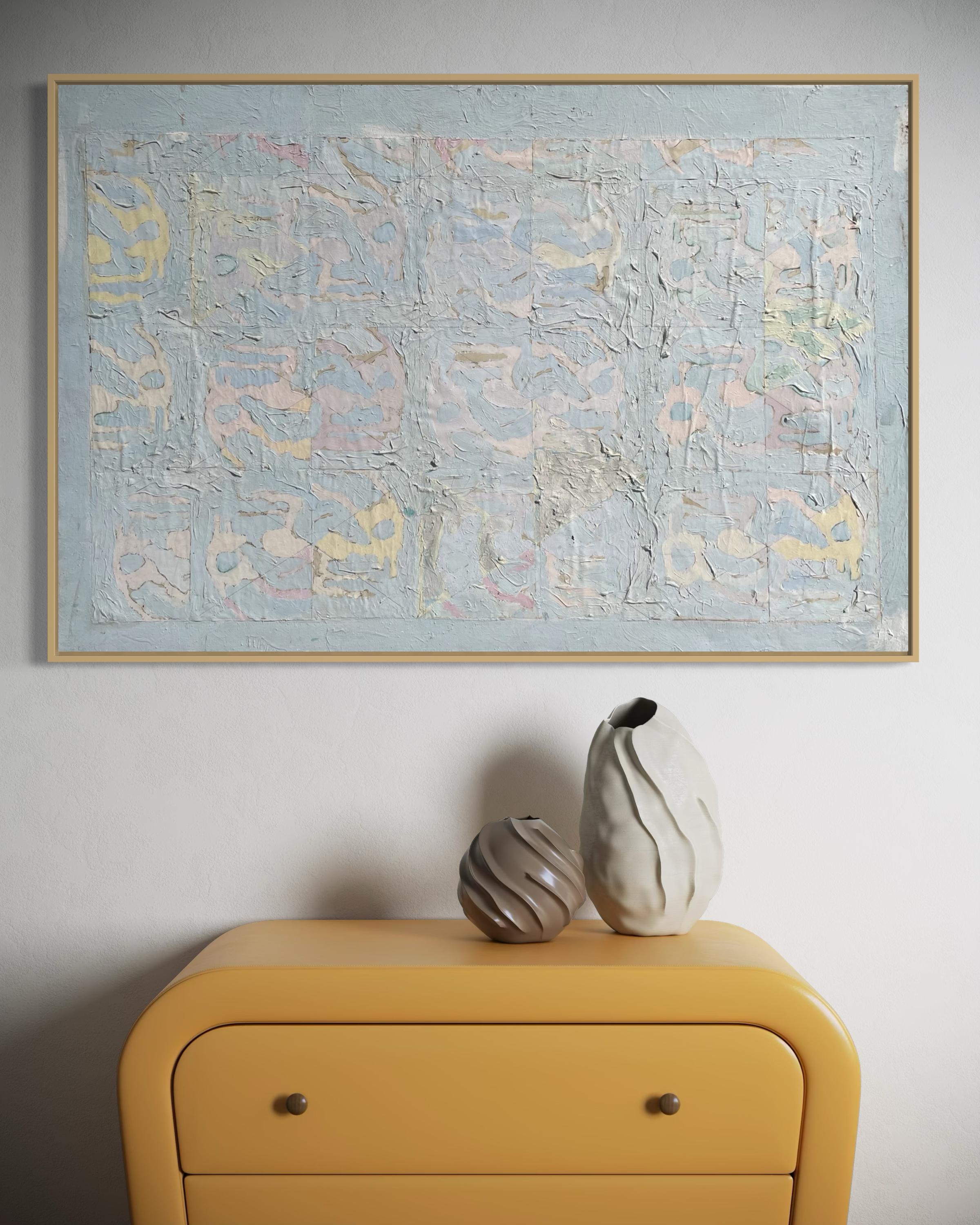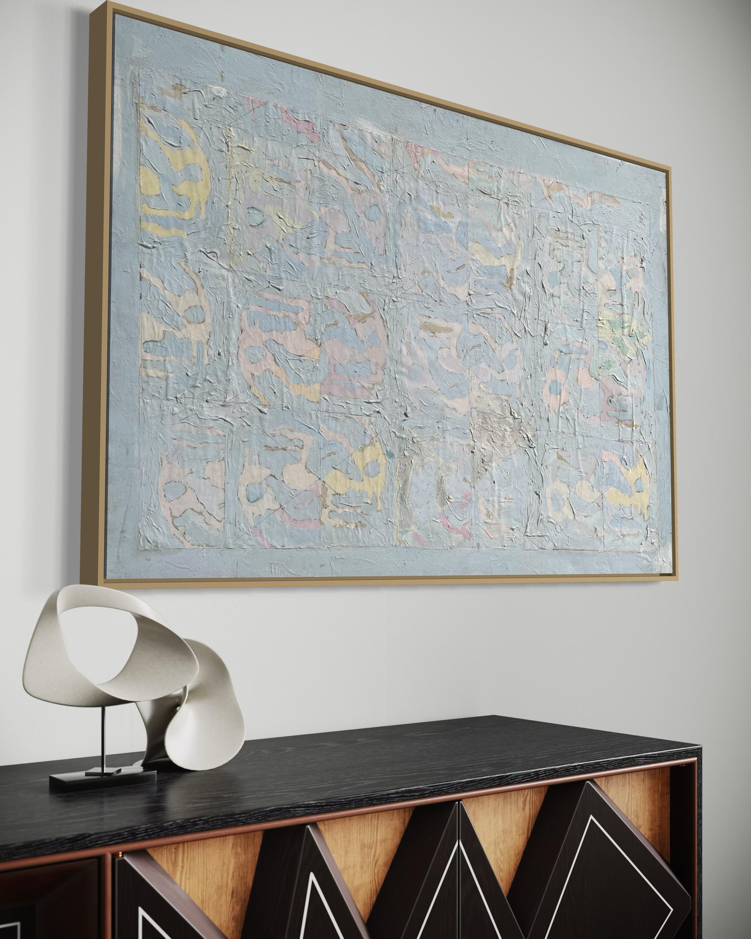 This early mixed-media ppiece by Rehfeld showcases his experimental approach during the late 1970s, when he was exploring texture, repetition, and subtle tonal shifts. Built from layered materials and soft pastel hues, the surface carries a quiet rhythm that feels both structured and weathered, almost like a faded textile or an eroded architectural fragment. The piece has a serene, atmospheric quality, making it an elegant choice for collectors who appreciate minimalist palettes, rich texture, and historical studio work from Rehfeld’s formative period.