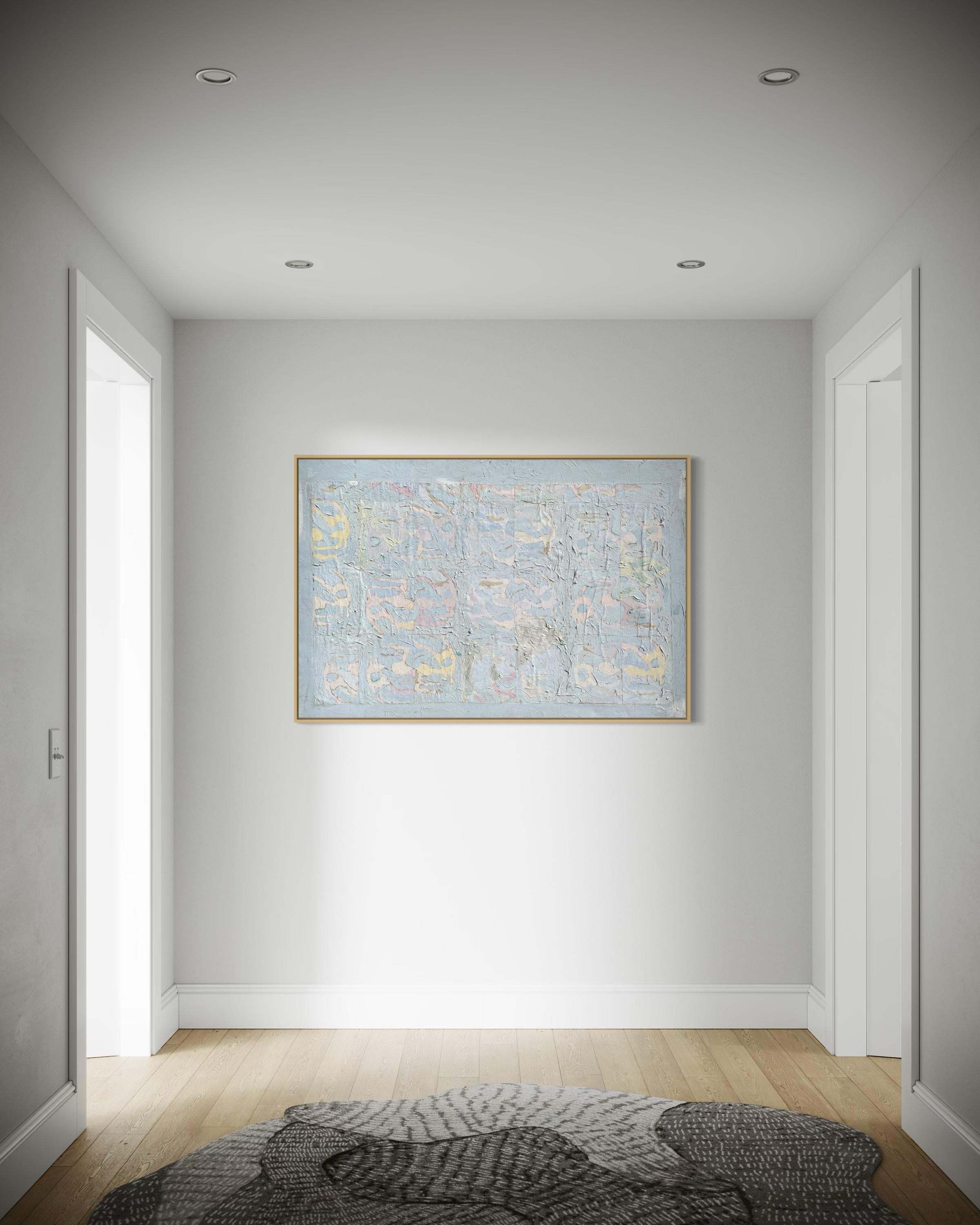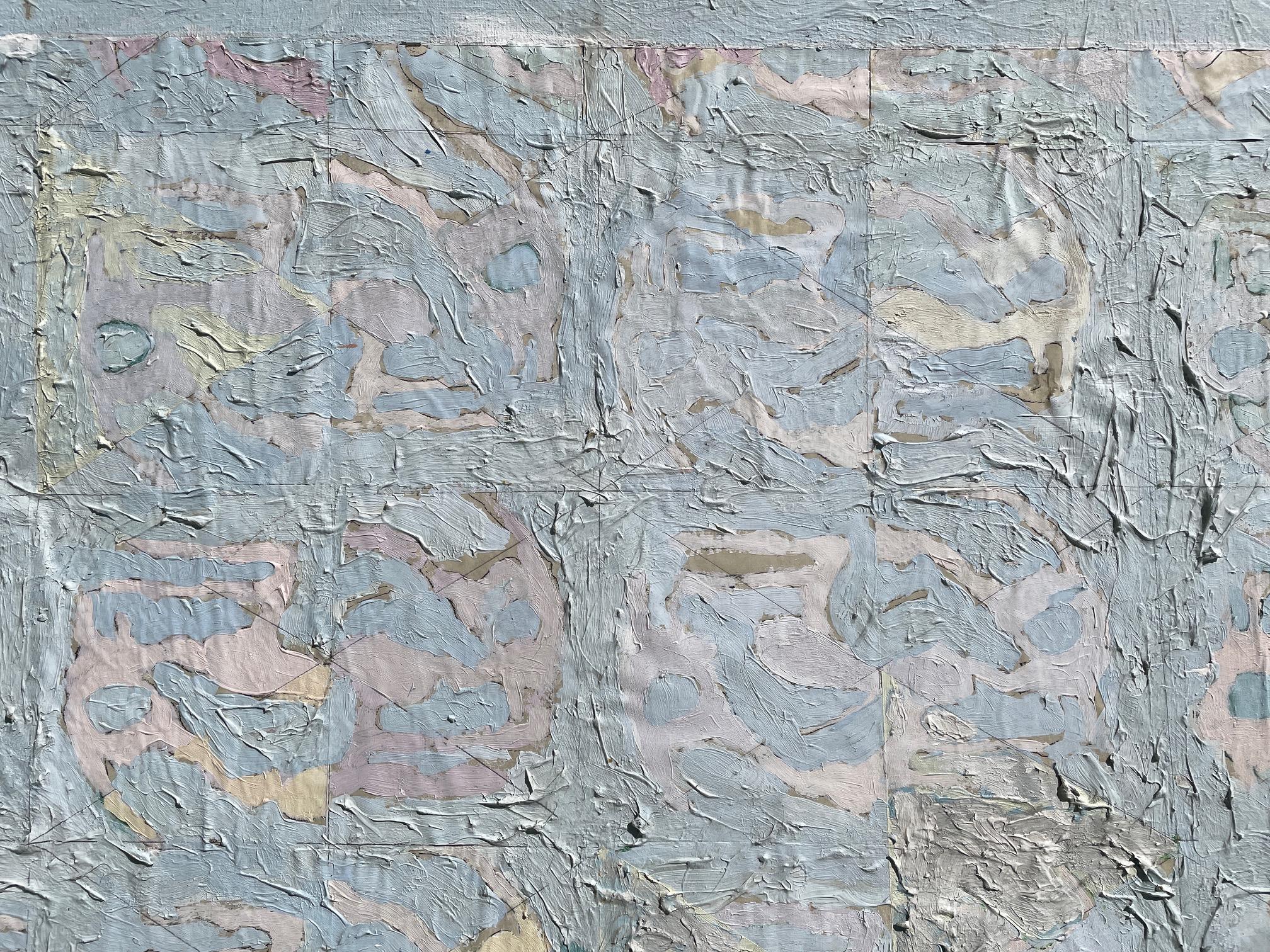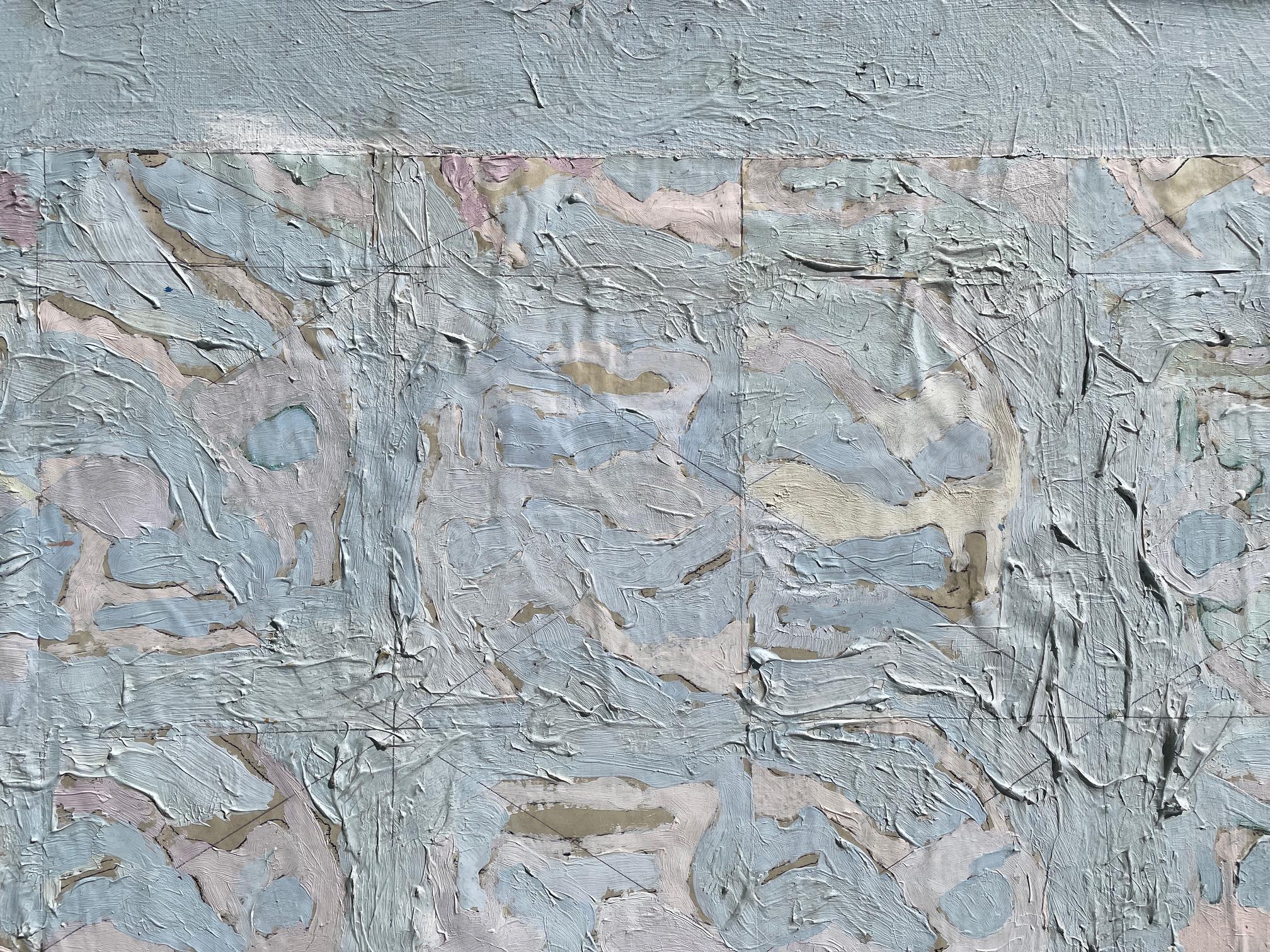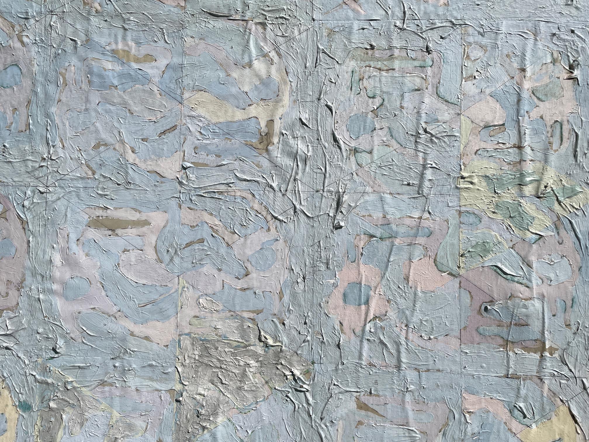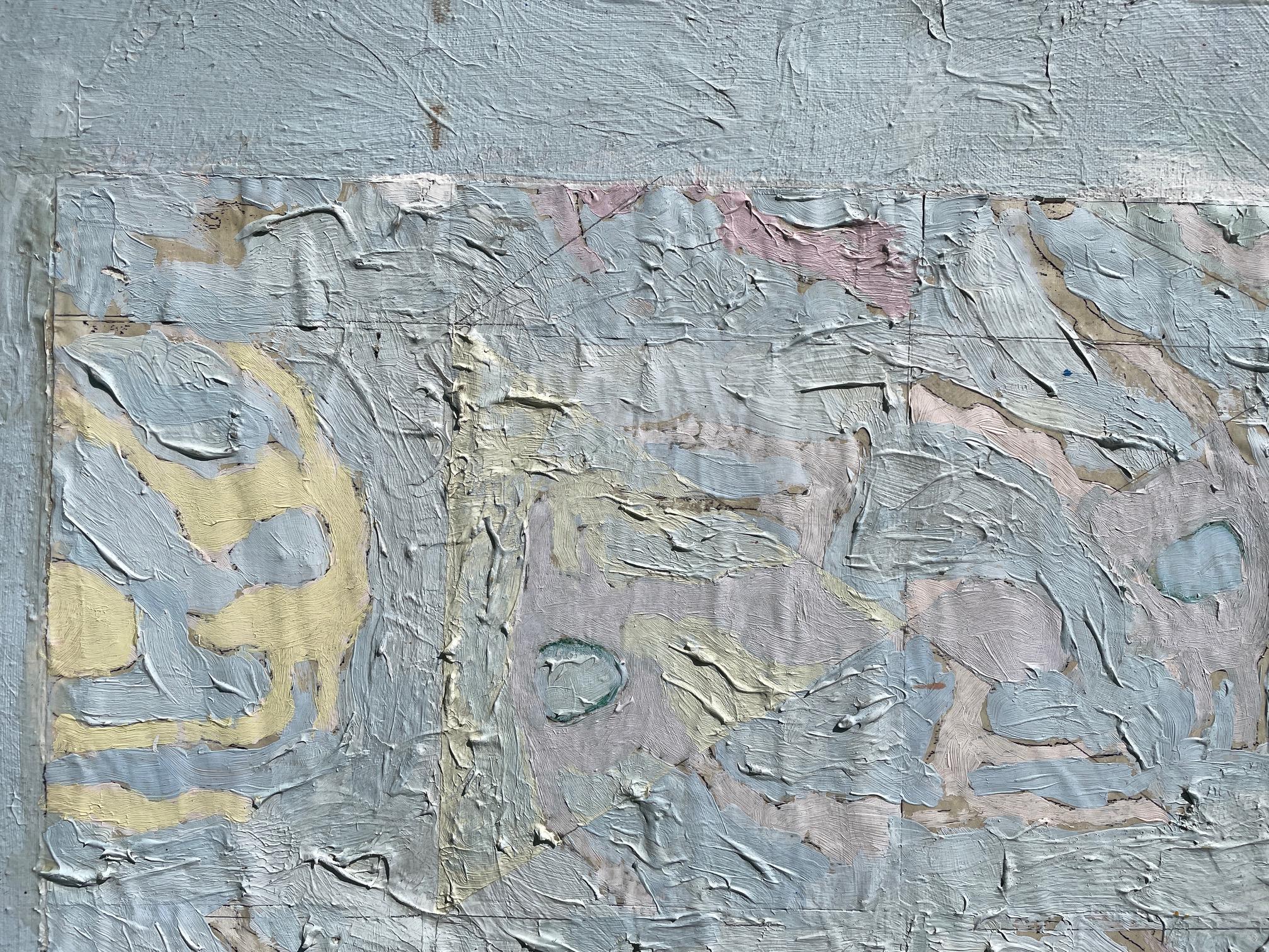 This early mixed-media ppiece by Rehfeld showcases his experimental approach during the late 1970s, when he was exploring texture, repetition, and subtle tonal shifts. Built from layered materials and soft pastel hues, the surface carries a quiet rhythm that feels both structured and weathered, almost like a faded textile or an eroded architectural fragment. The piece has a serene, atmospheric quality, making it an elegant choice for collectors who appreciate minimalist palettes, rich texture, and historical studio work from Rehfeld’s formative period.