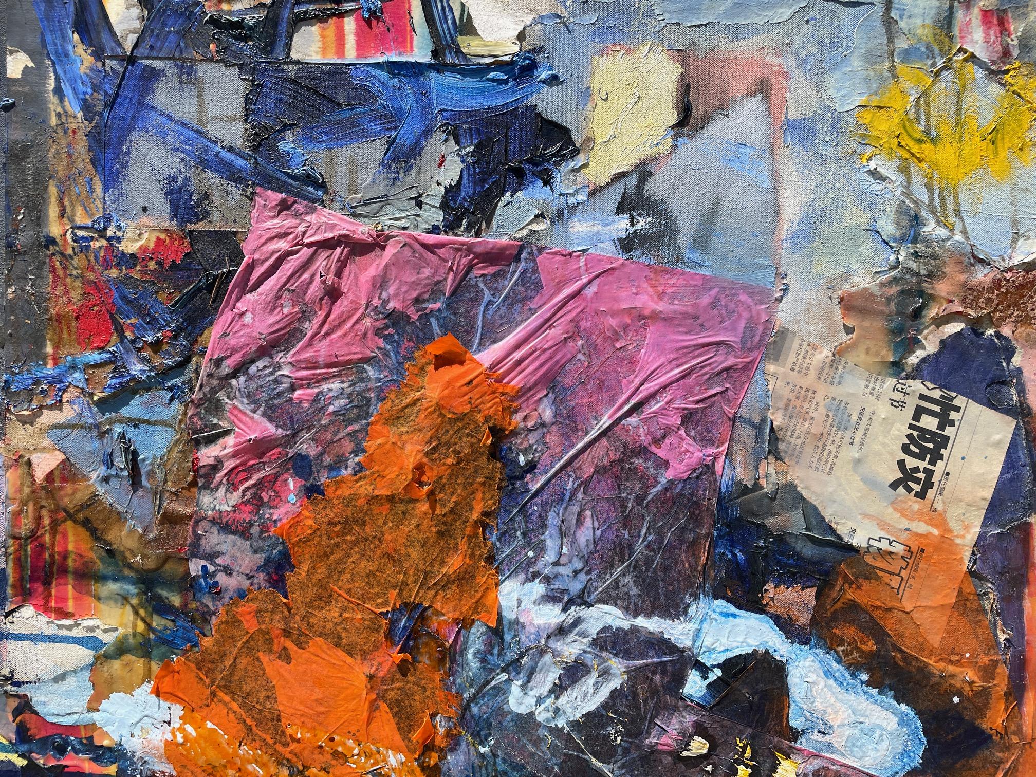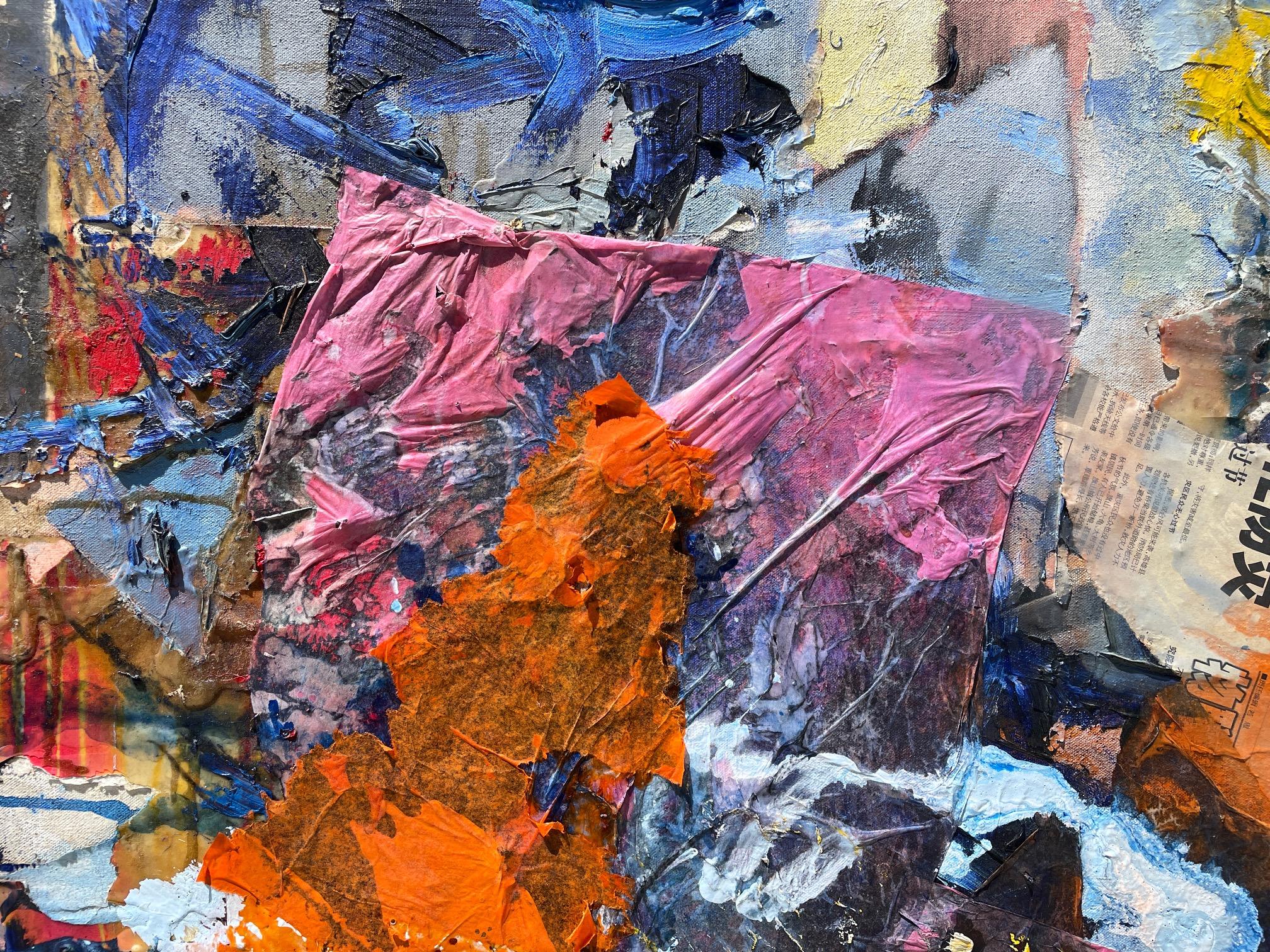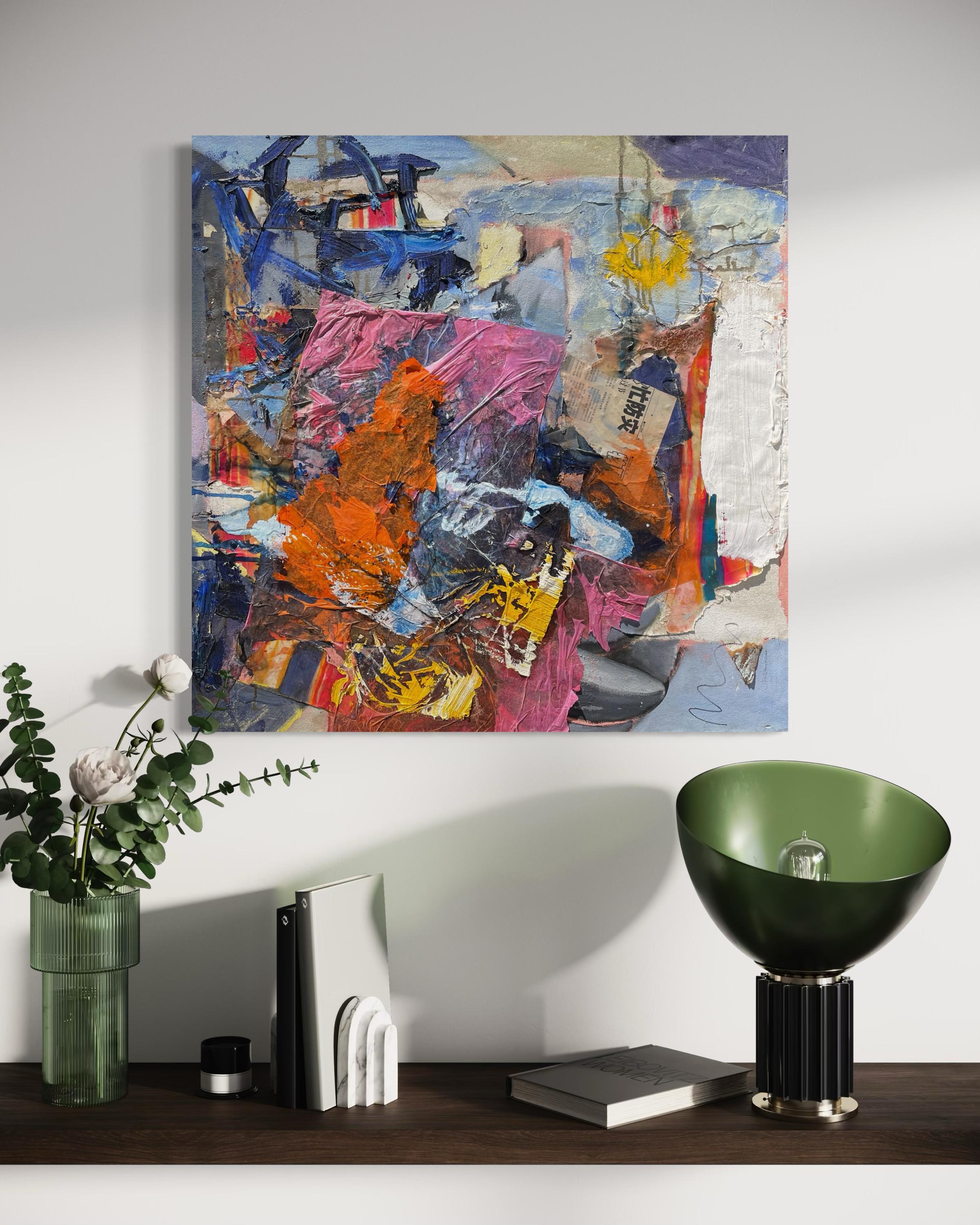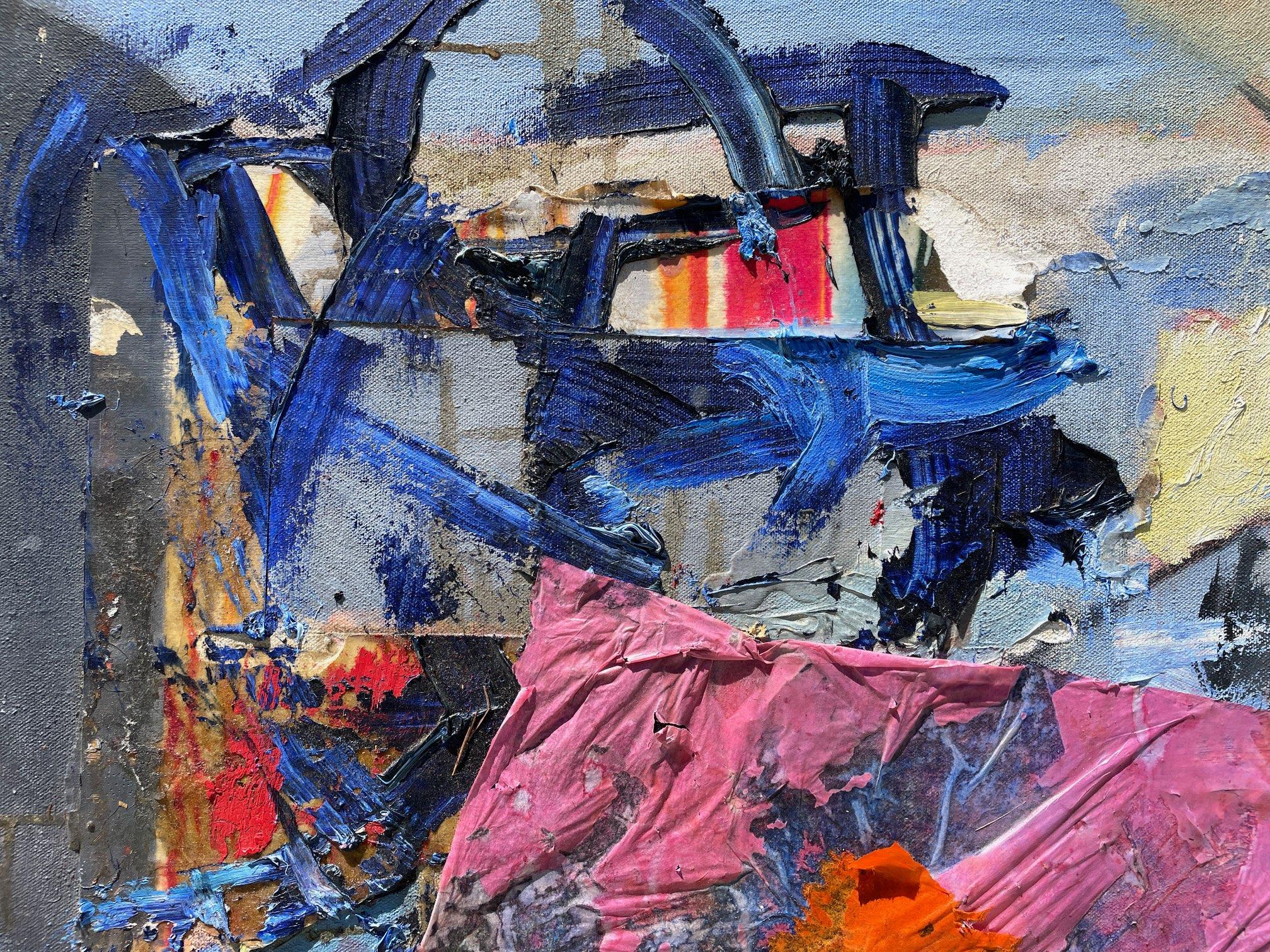 This vibrant mixed-media work by Rehfeld showcases his signature use of bold texture, layered collage, and energetic color. Built from a rich combination of paint, paper, and sculptural material, the surface feels almost topographical. The textured elements and layers of oil impasto invite viewers to explore its folds, ridges, and unexpected details. The interplay of electric pinks, deep blues, and vivid oranges gives the piece a charged, contemporary presence while still retaining the improvisational freedom of pure abstraction.