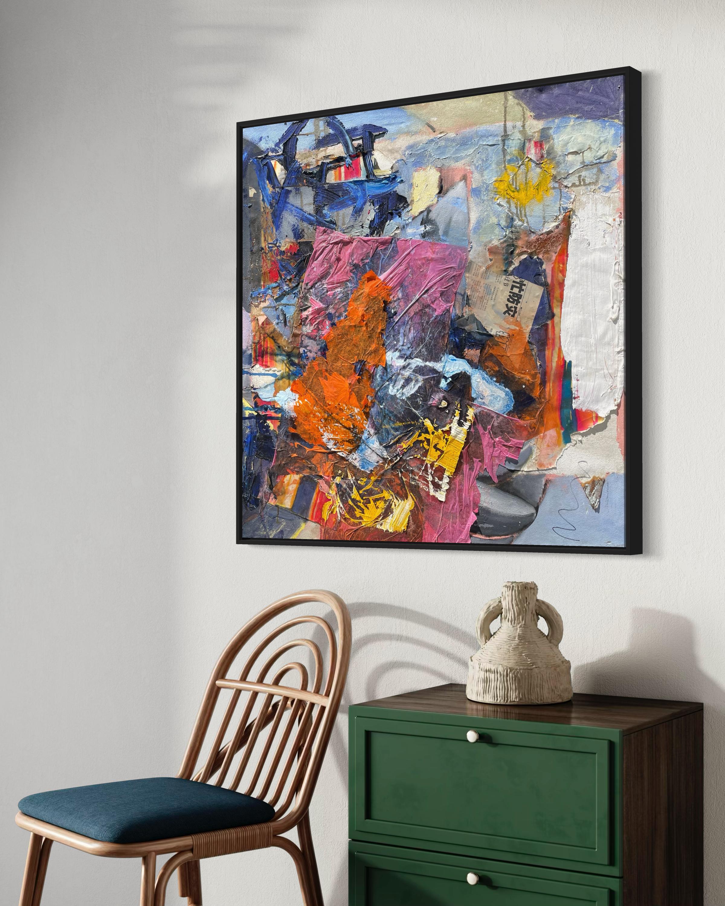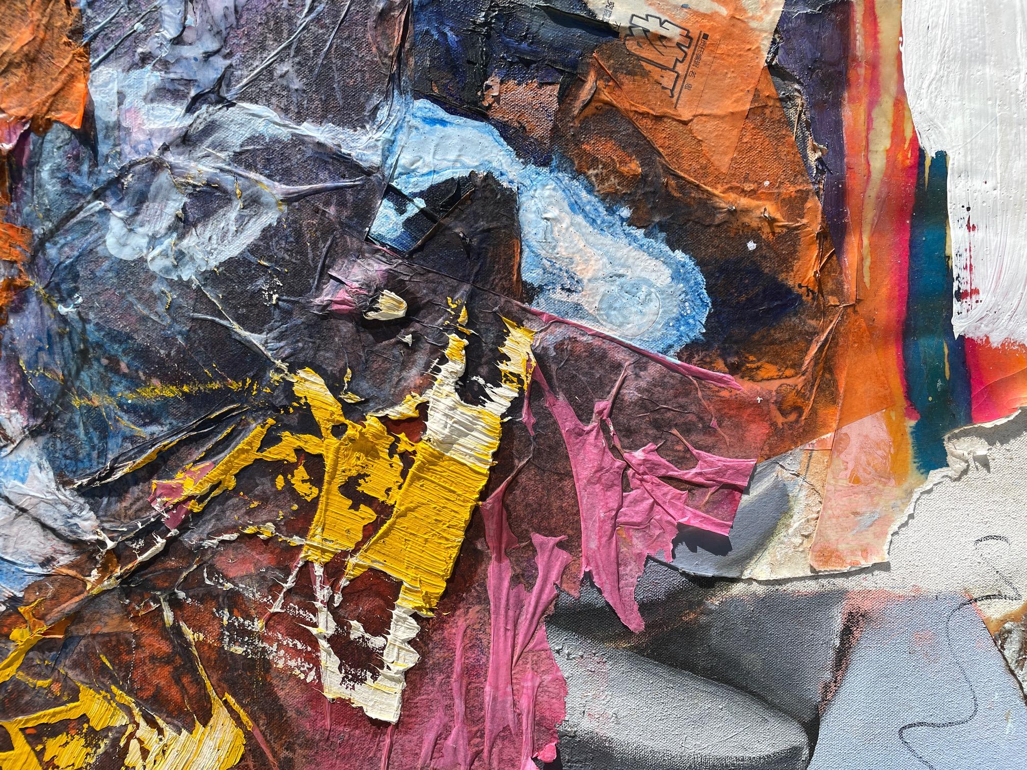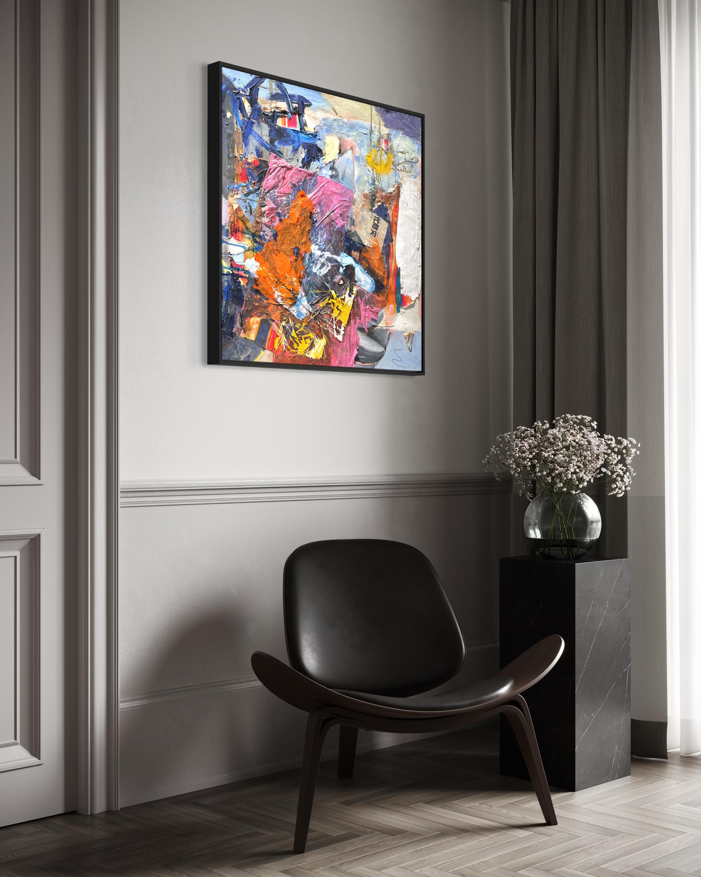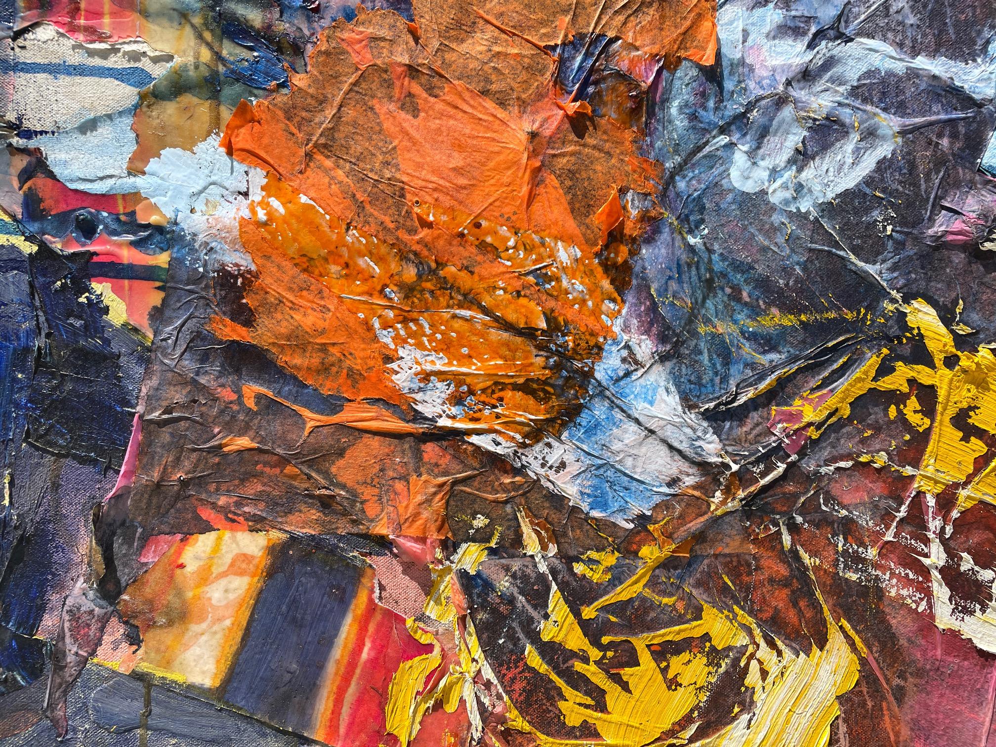 This vibrant mixed-media work by Rehfeld showcases his signature use of bold texture, layered collage, and energetic color. Built from a rich combination of paint, paper, and sculptural material, the surface feels almost topographical. The textured elements and layers of oil impasto invite viewers to explore its folds, ridges, and unexpected details. The interplay of electric pinks, deep blues, and vivid oranges gives the piece a charged, contemporary presence while still retaining the improvisational freedom of pure abstraction.