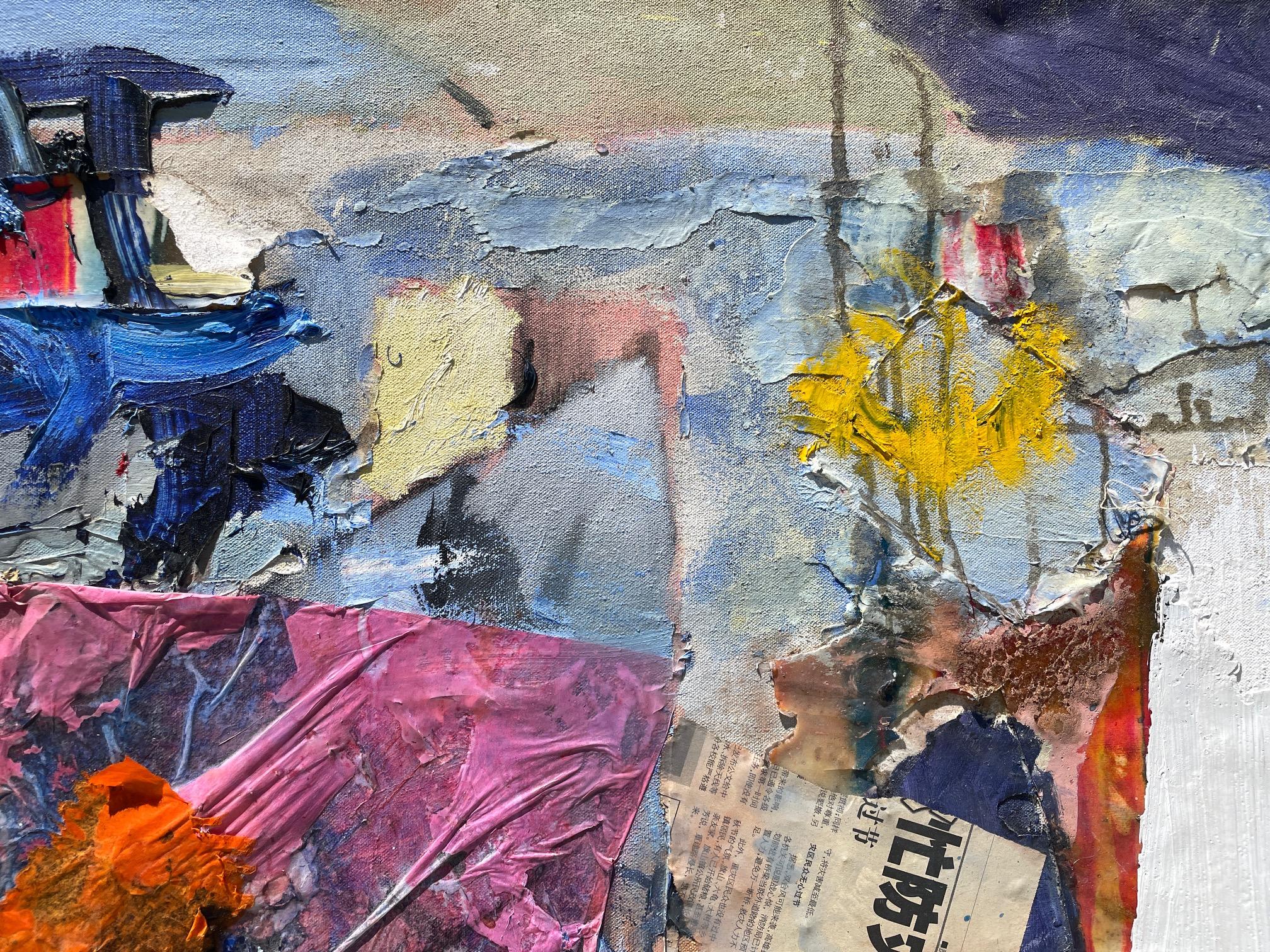 Colourful, French mixed media abstract, acrylic, newsprint and ink from the 1980s. The canvas is signed and dated bottom right but we have not yet managed to decipher it.