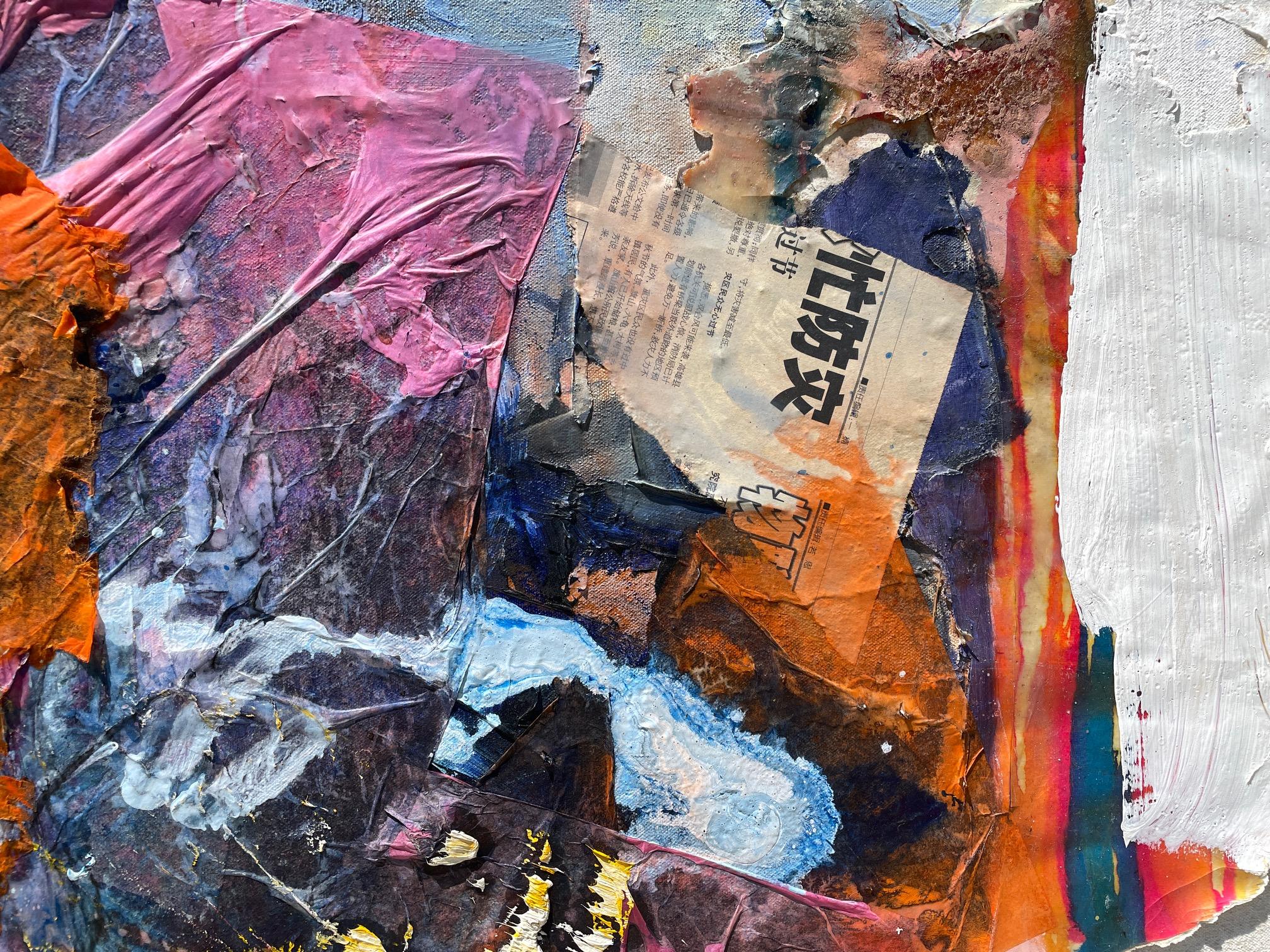 Oil paint, paper, newsprint, tissue paper, glue, mixed media, canvas, stretcher bars