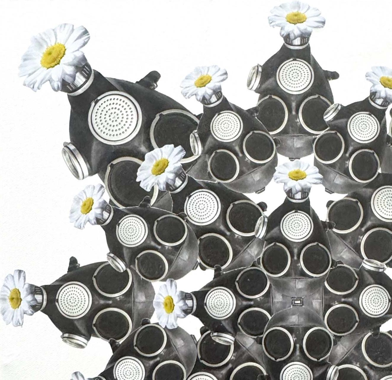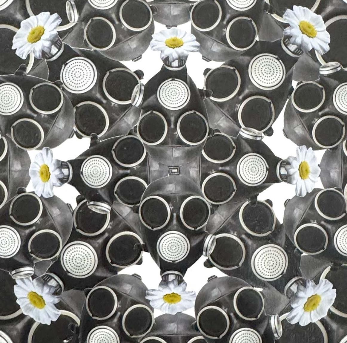 The spatial placement of the images in the collection brings out the clean lines and symmetrical design, displaying a play of hearts and flowers with war planes, grenades, gas masks and guns in a way that blurs the savagery and jollity implied by these articles with the final look suggesting that love and beauty prevails.