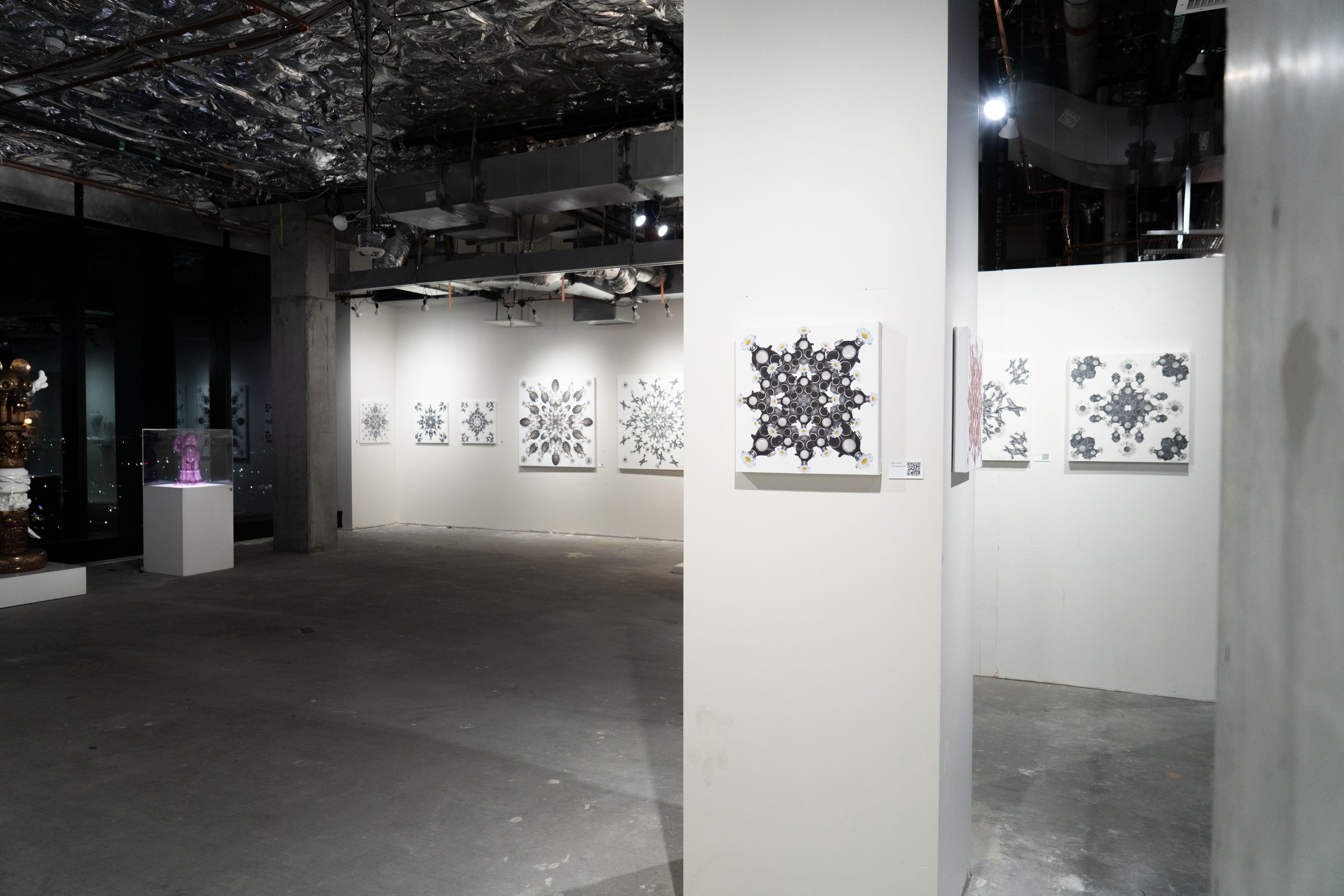 Using symmetry as a basis, Drakopoulos derives structure by combining elements from the natural world and science. Modifying these elements digitally, Drakopoulos distills into a pattern or shape, and then layers them with a different structure and repeats the process of layering paint in resin. She tries to find the most subtle and interesting way to connect the different layers that will reveal an underlying structure or system.