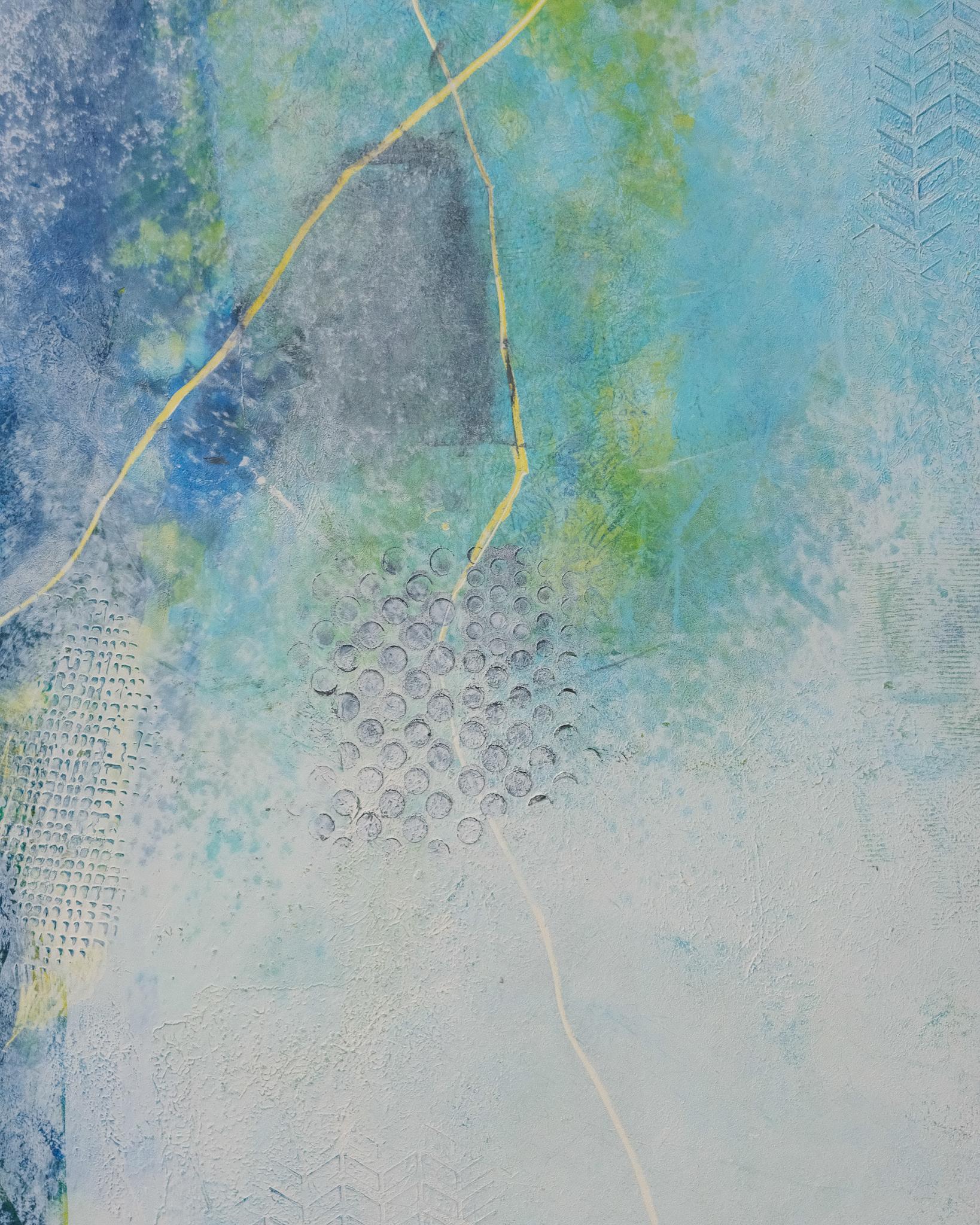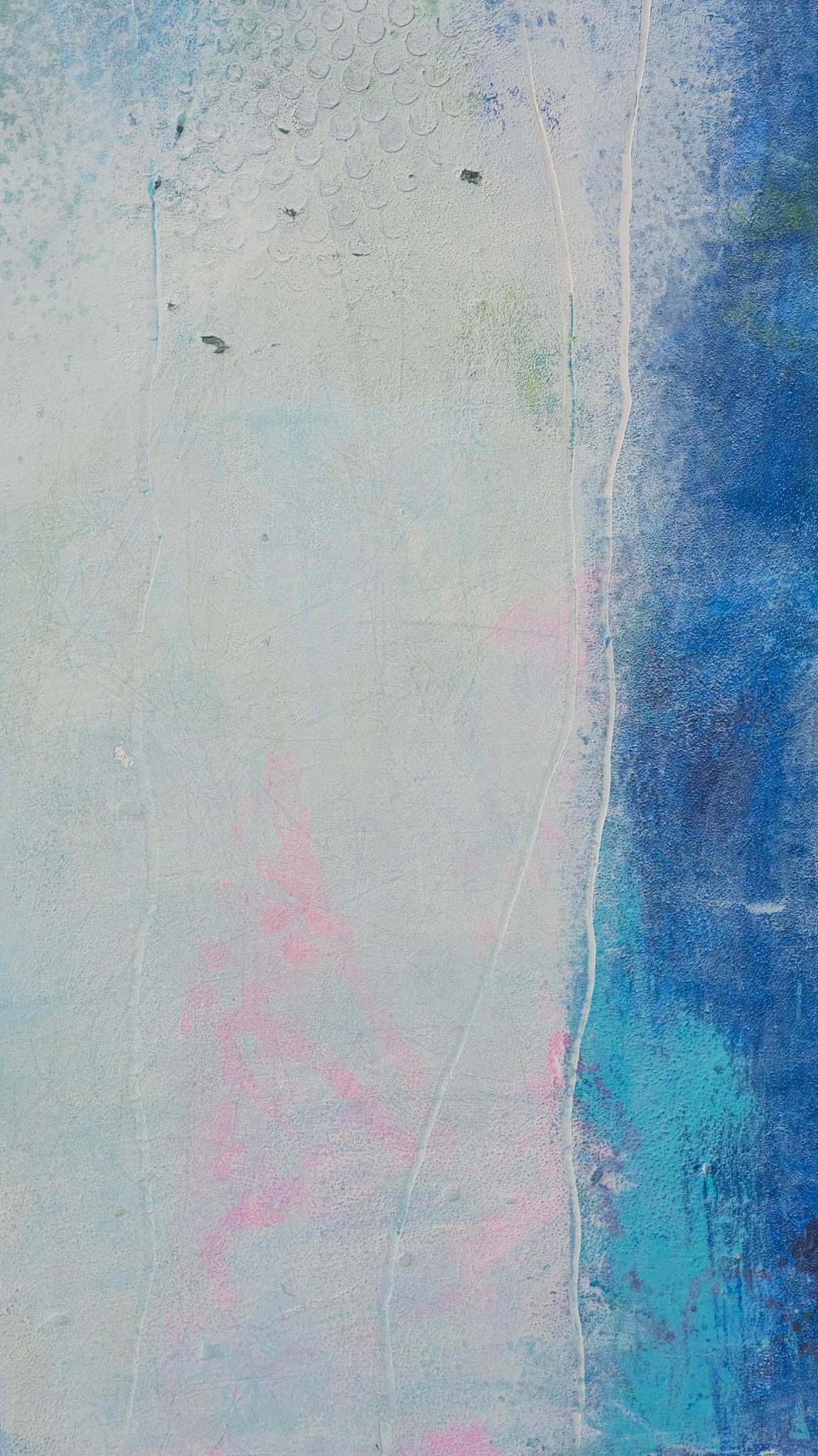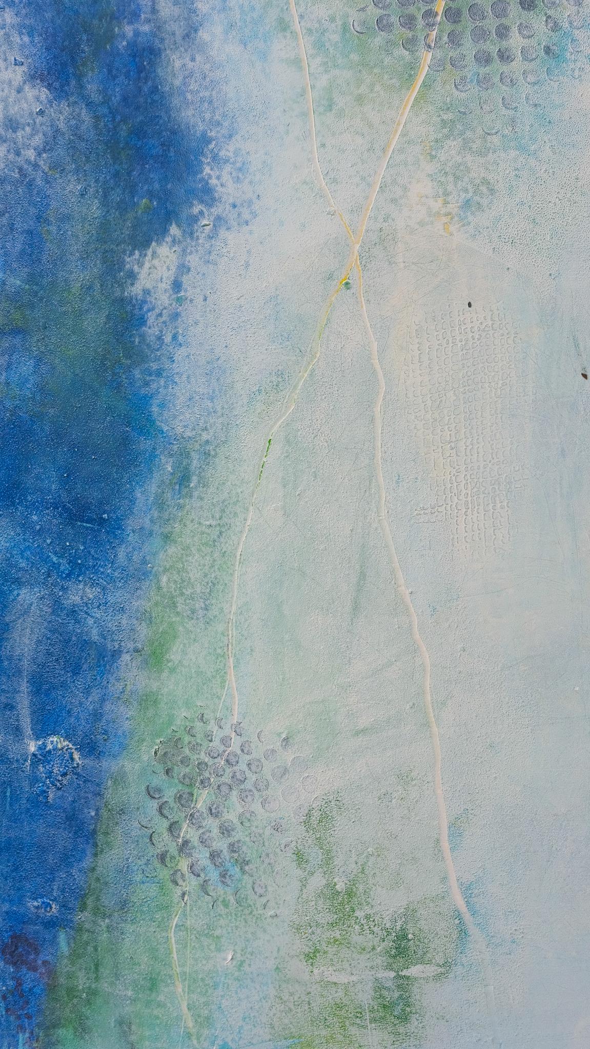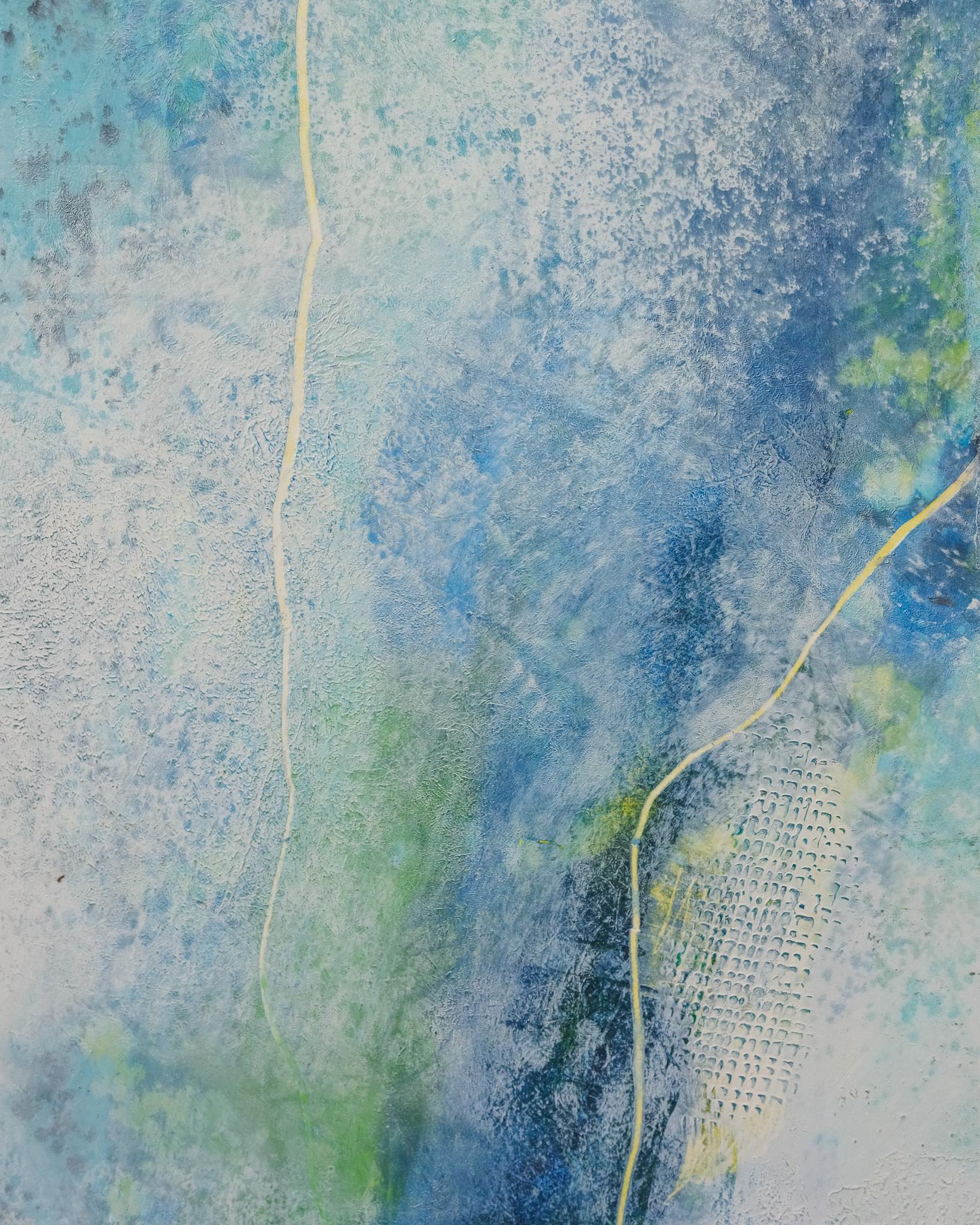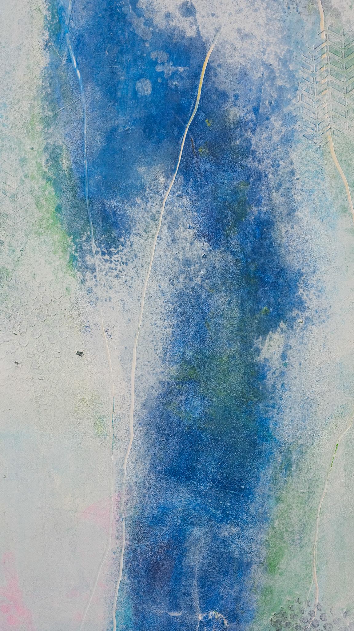 "Visions of My Former Self" by Sandi Neiman is an abstract expressionist diptych with a serene and introspective feeling. The work has a cool palette of blues, whites, and light greens, turquoise and pink, with energetic vertical strokes of deep indigo and cobalt providing a strong focal point down the center of each panel. The surface of each panel a layered mix of lighter tones, featuring marks made by scraping, texture, and subtle stamped patterns, hinting at underlying complexity. Fine mineral-like veins of yellow and white traverse the surface, suggesting wisps of light or movement, while a scatter of paint splatters adds to the overall immediate and atmospheric quality of the piece. The overall impression is one of a watery, misty emotion, creating a profound and personal visual experience.