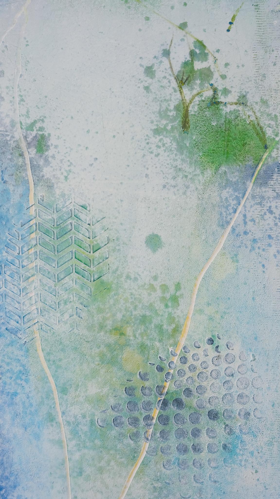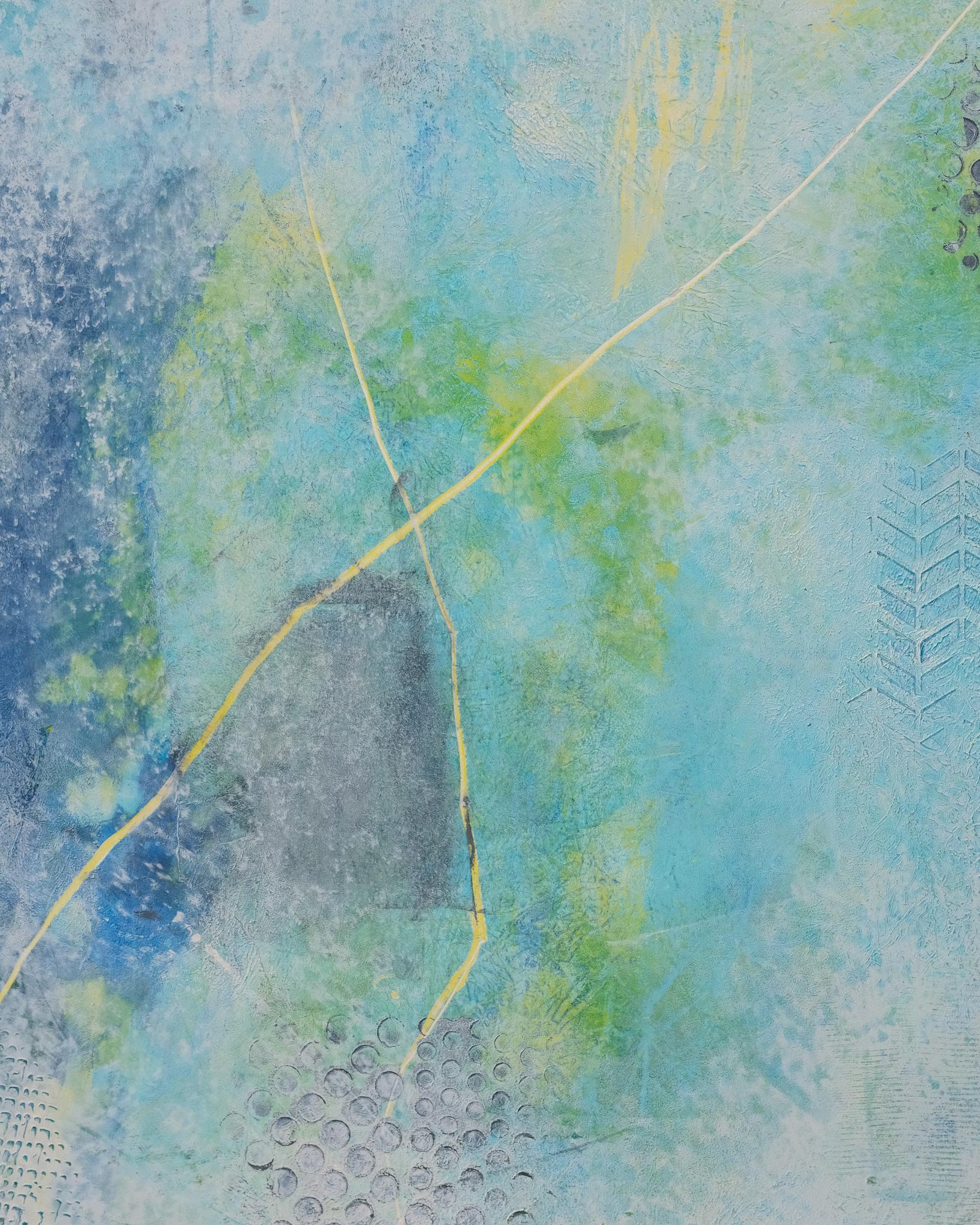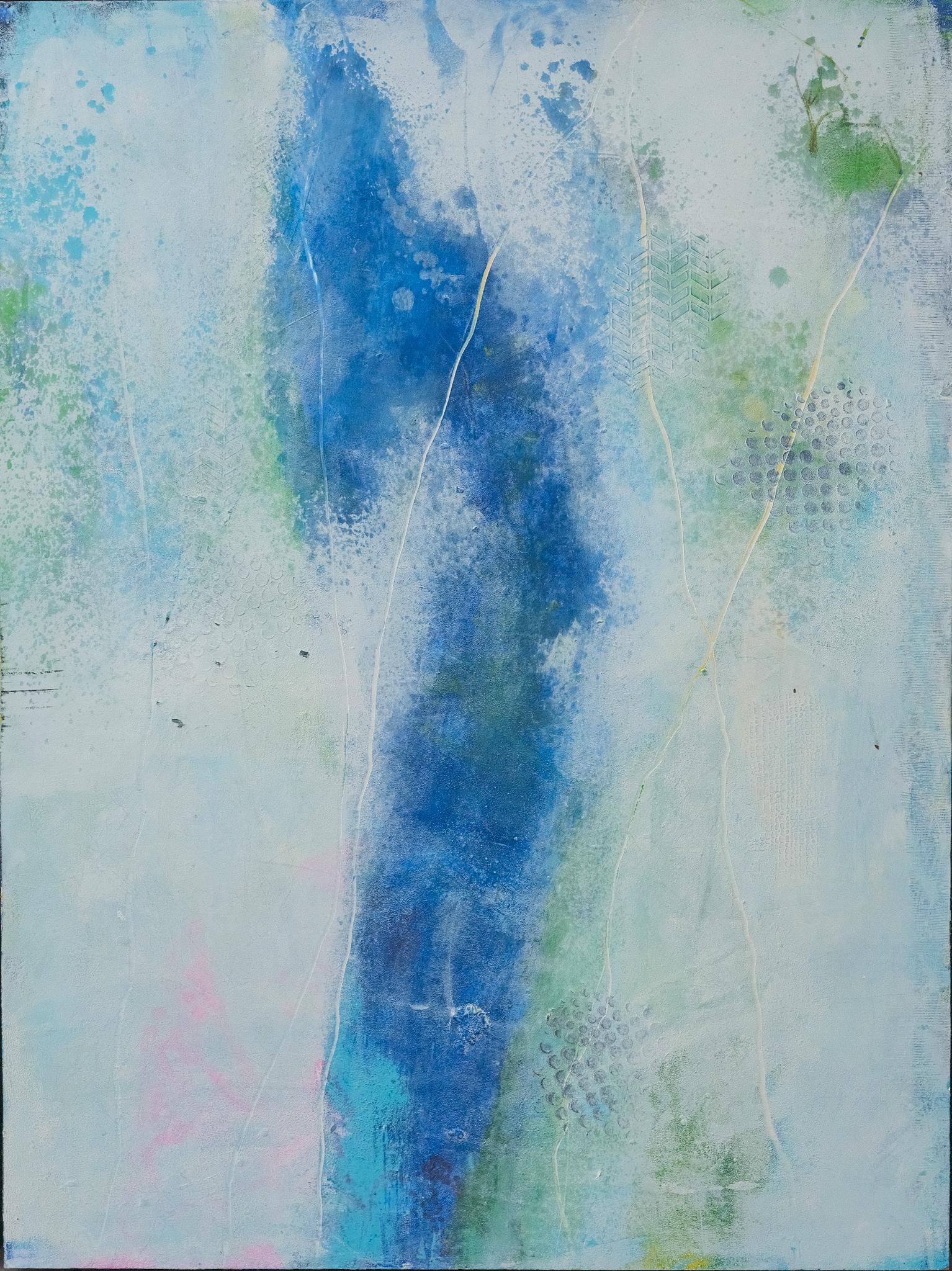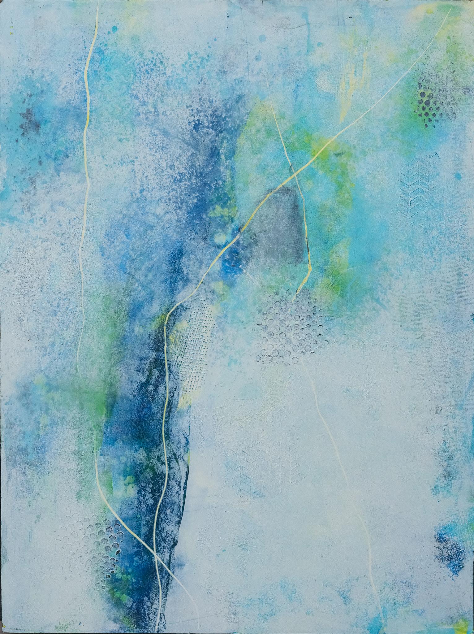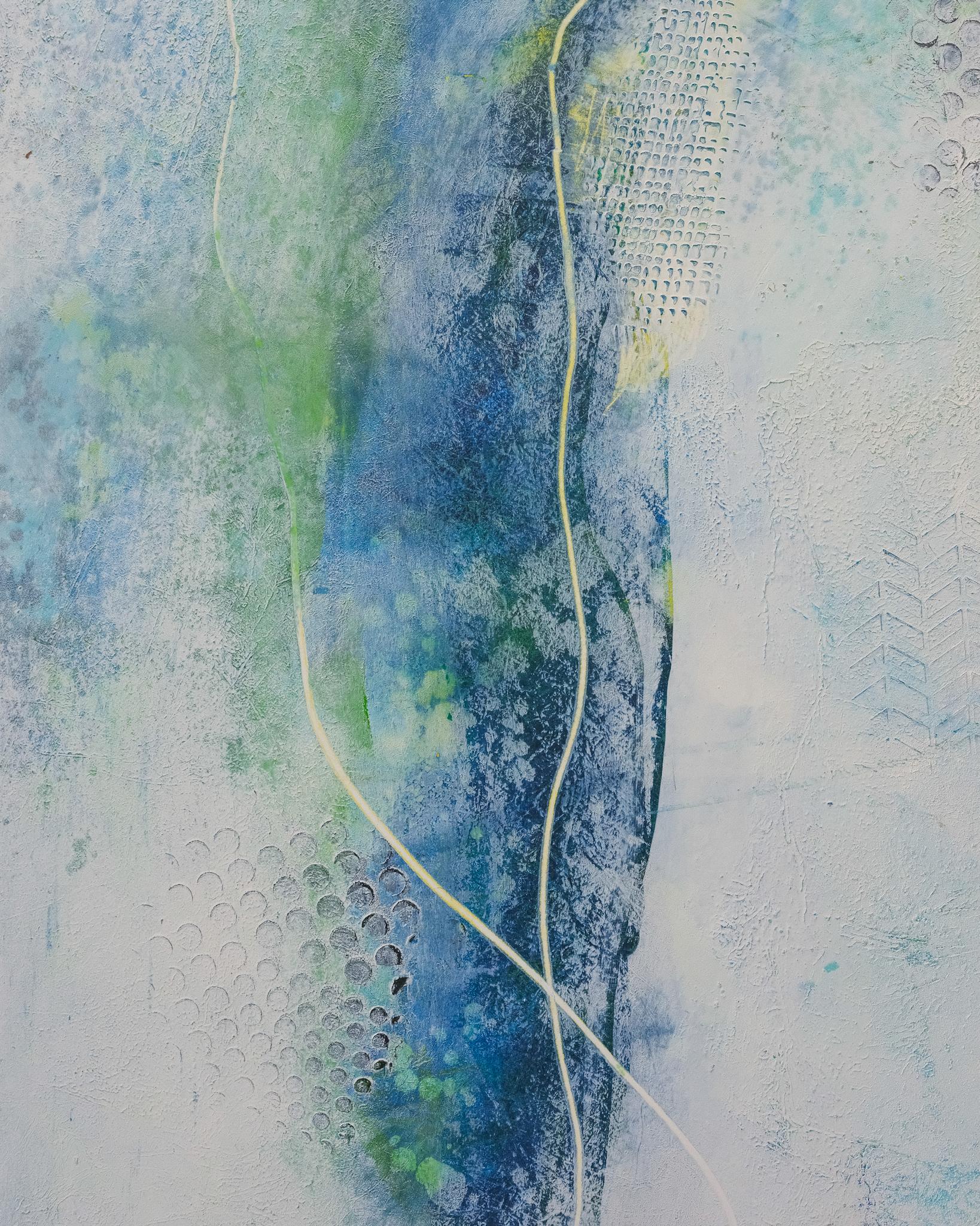 "Visions of My Former Self" by Sandi Neiman is an abstract expressionist diptych with a serene and introspective feeling. The work has a cool palette of blues, whites, and light greens, turquoise and pink, with energetic vertical strokes of deep indigo and cobalt providing a strong focal point down the center of each panel. The surface of each panel a layered mix of lighter tones, featuring marks made by scraping, texture, and subtle stamped patterns, hinting at underlying complexity. Fine mineral-like veins of yellow and white traverse the surface, suggesting wisps of light or movement, while a scatter of paint splatters adds to the overall immediate and atmospheric quality of the piece. The overall impression is one of a watery, misty emotion, creating a profound and personal visual experience.