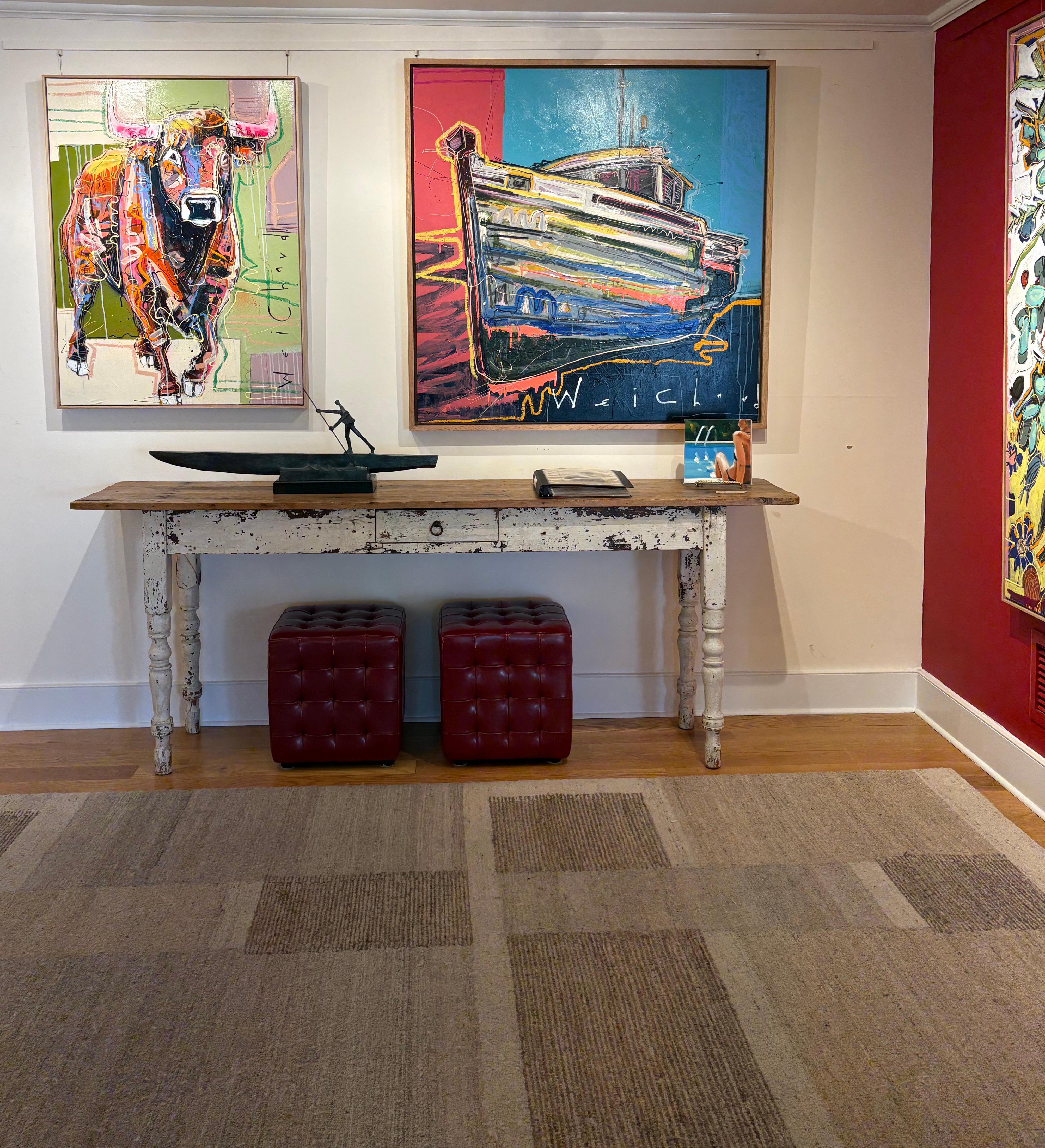 My biggest inspiration, however, are my two Australian Shepherds - Disney and Faloo. It’s their endless affection and loyalty that amazes me everyday, there is never a dull moment around here. But, I really find brilliance in all animals, whether it be our noisy chickens, Jen’s horses or the neighbor’s cows, I have a huge admiration for their unmistakable characteristics and unique markings, no matter the species. Just being in the presence of animals has a dramatic proven positive physiological and psychological effect on us and my art tries to explore this using color and texture.