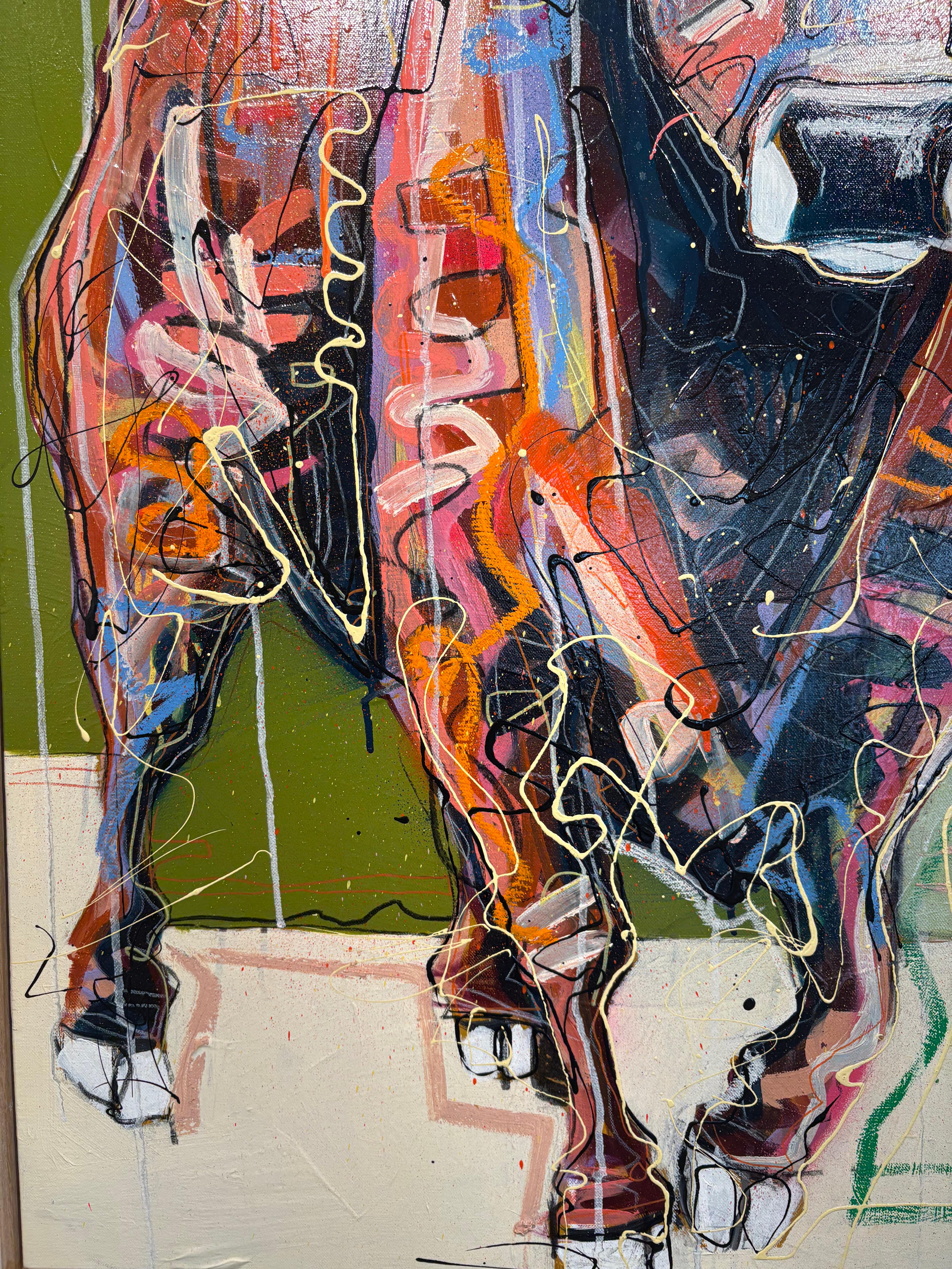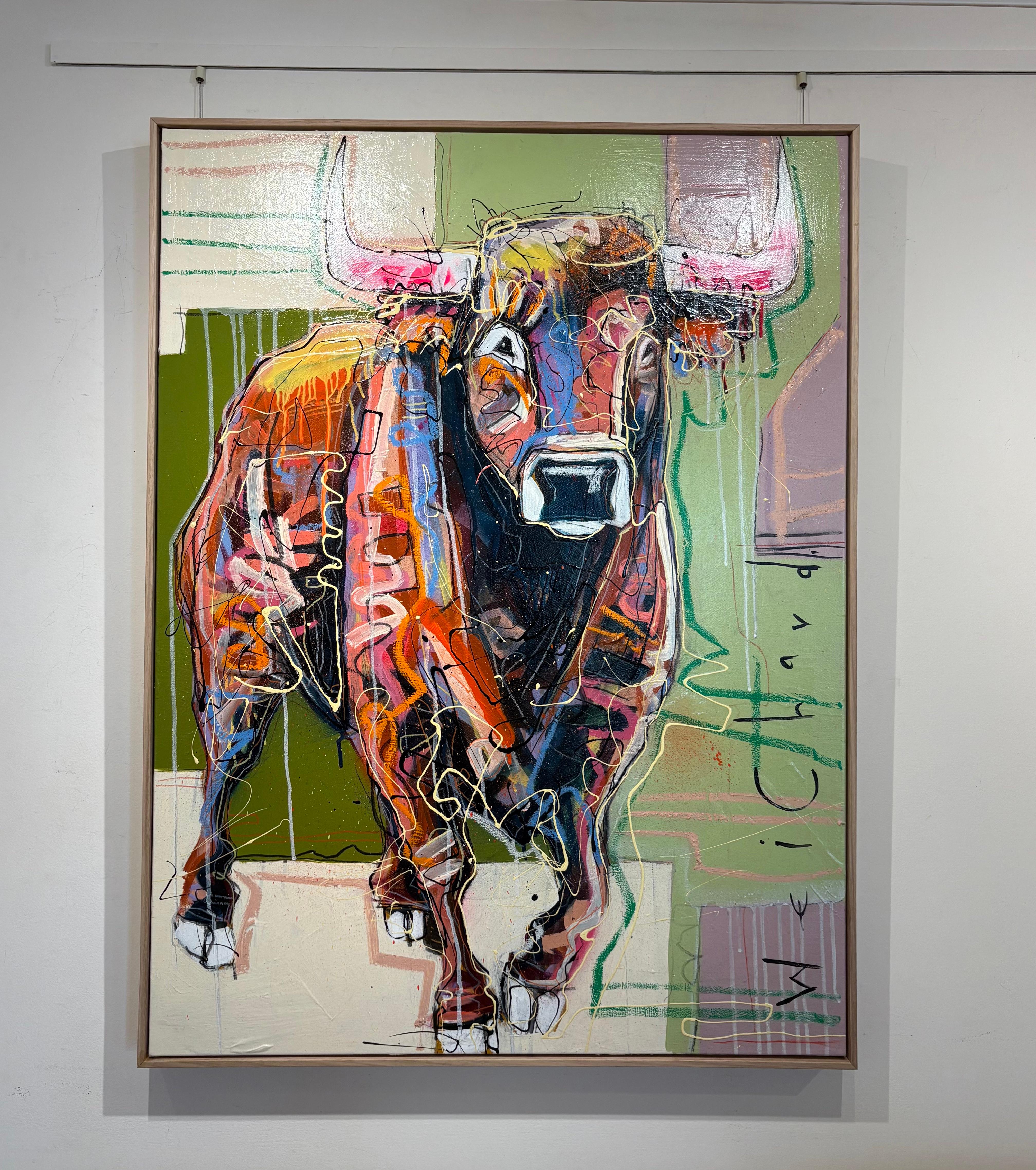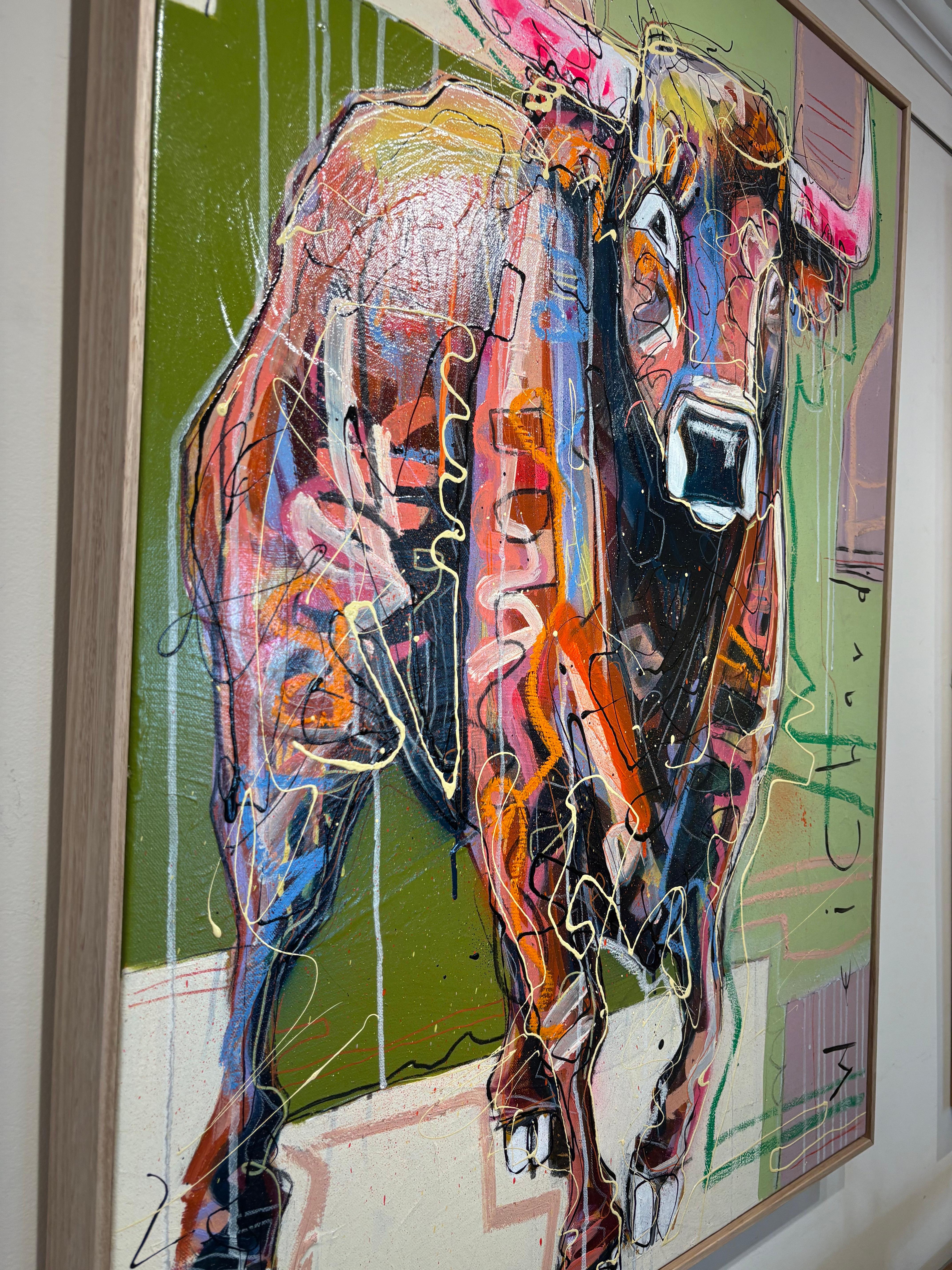 Vitality and vigor are at the center of each of my works. I aim to induce a feel of brightness and levity, with my style heightening the playfulness found in cockatoos, the power of a bull or the vibrancy of fresh gum leaves. High colors are purposefully used to emphasize the character, persona, and emotion of my subject matters. The intentionally dramatic brushstrokes imbue my subject matter with a dynamism that is at once powerful and compelling. Combining bright colors with layered mixed media such as spray paint, enamel, oil paint on varied mediums, my bold technique belies the intentionality of my process.