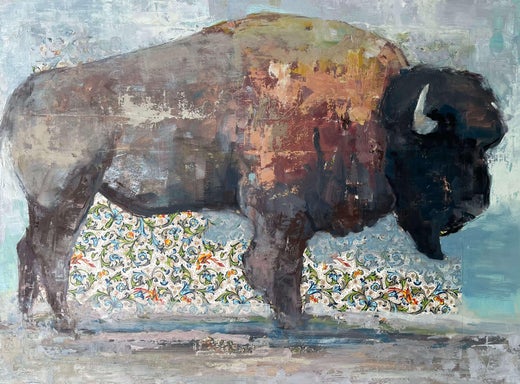 "Looks Like Sun" is an evocative original painting by Brian Keith Stephens, capturing the rugged spirit of a western buffalo. This piece, using oil and wax on cotton, measures 32 x 4...