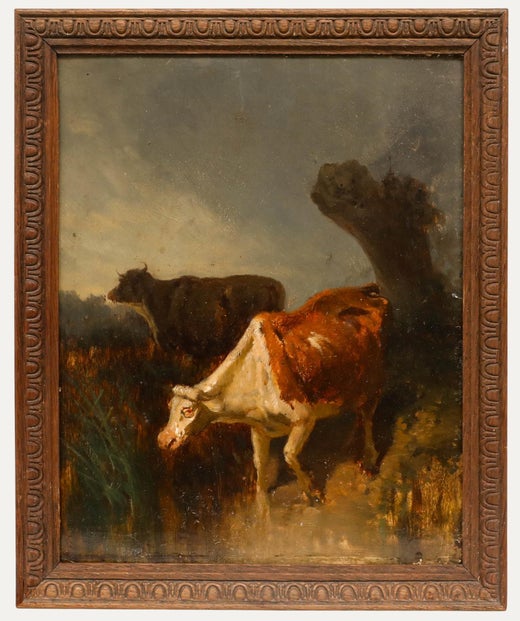 This oil on board pastoral painting of two cattle is signed and dated by the artist in the lower right corner “F.J. Dierckxsens 1858”. There is also a handwritten paper affixed to th...