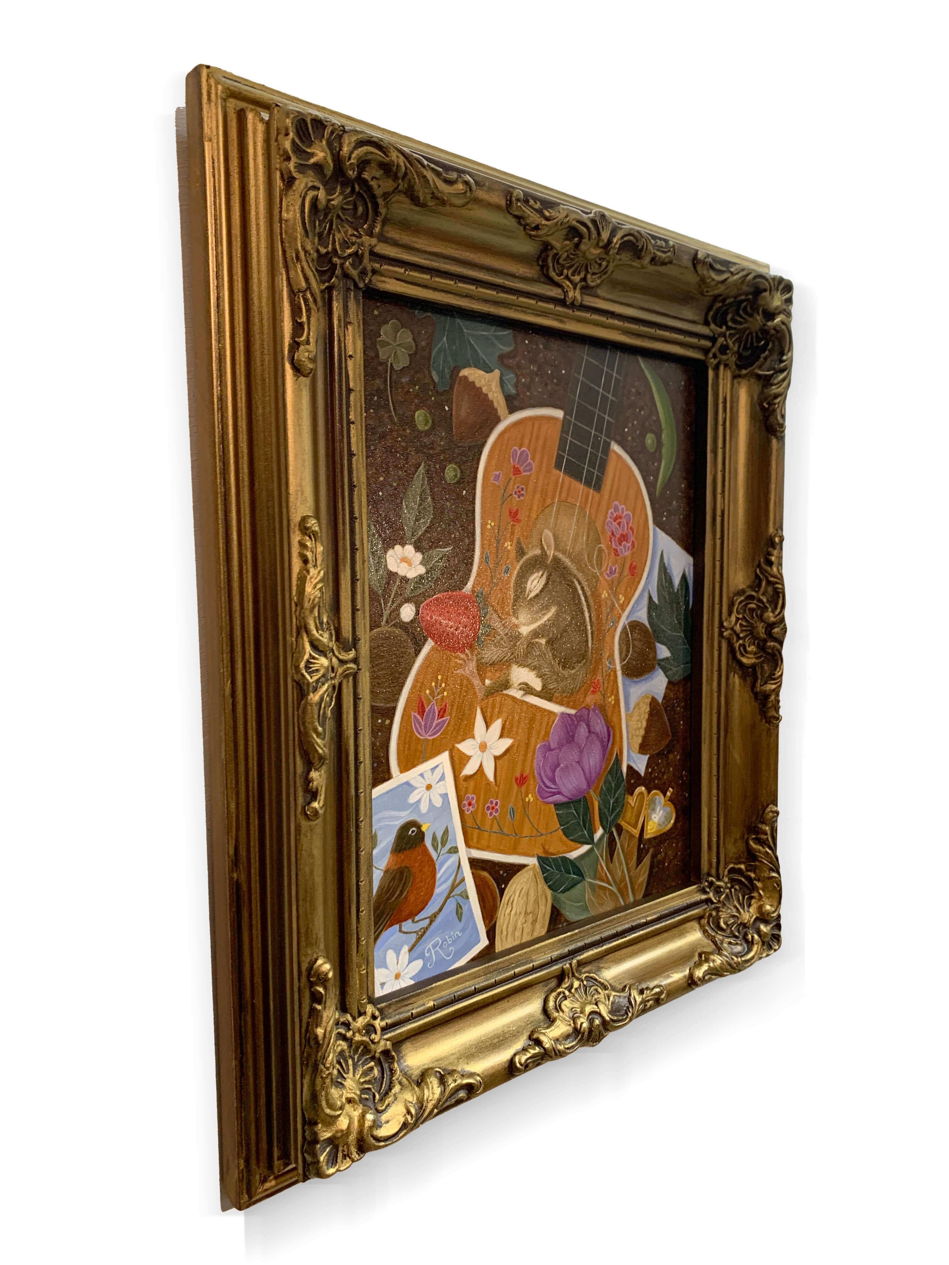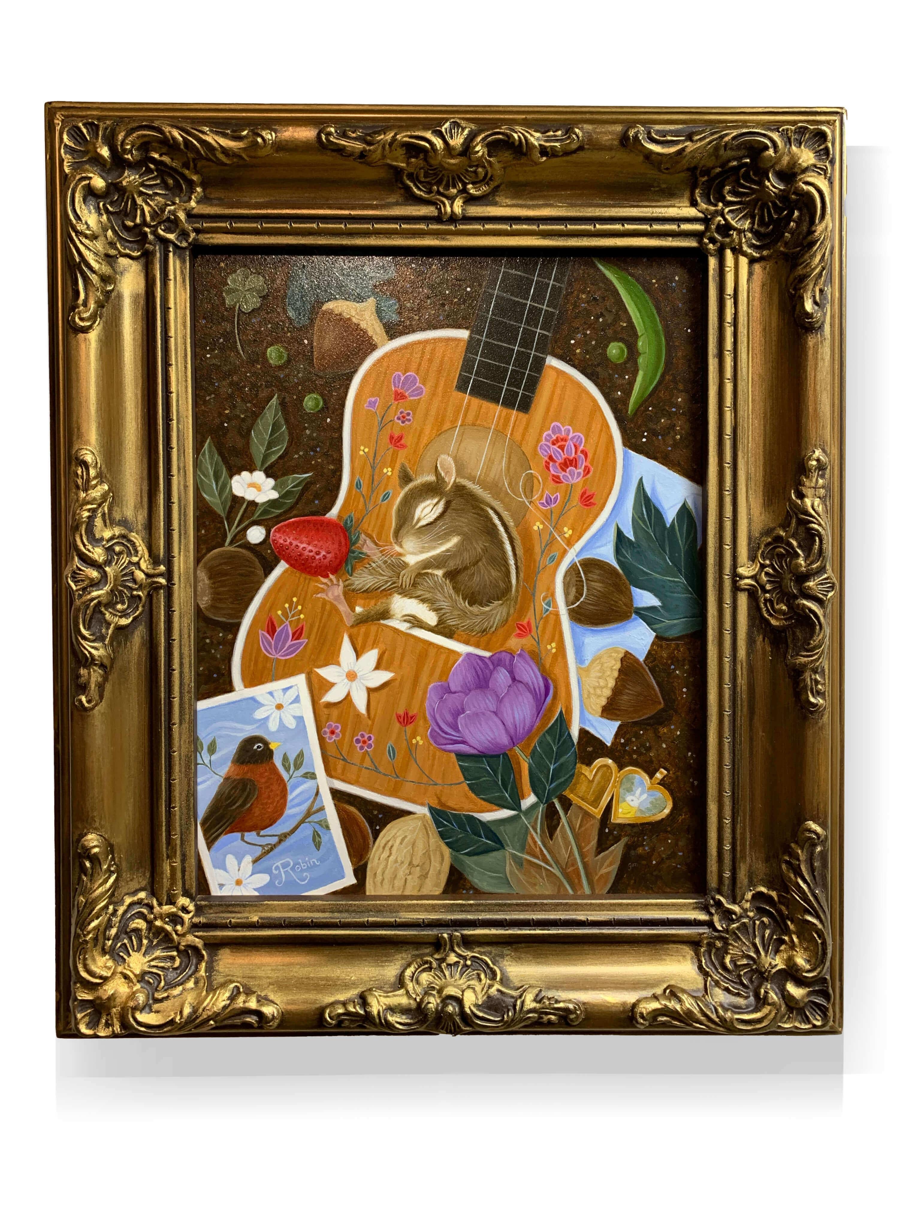 Gina Matarazzo’s “A Theater for Thomas” is a charming and imaginative oil painting on Gessoboard panel created in 2024. This original, handmade piece measures 10 x 8 x 1.25 inches and is presented in a beautifully ornate gold-tone frame with overall dimensions of approximately 15 x 13 inches. It features a whimsical stage setting at night, complete with a playful chipmunk dressed in a bow tie and surrounded by lush flora and colorful fruit. The carefully rendered curtains, vibrant blossoms, and lovingly detailed fauna all combine to create a rich, storybook atmosphere—inviting viewers into a scene filled with both humor and warmth.