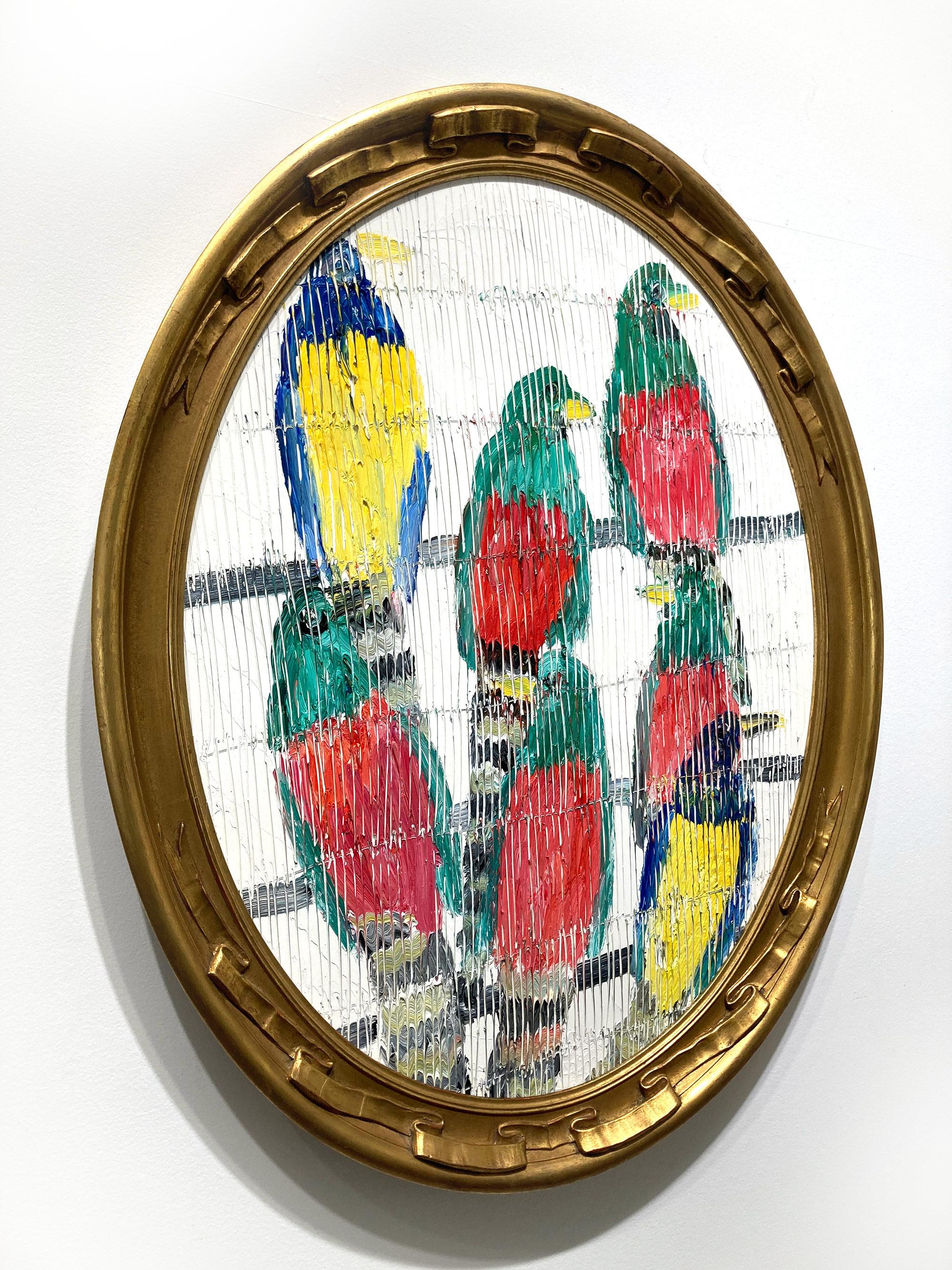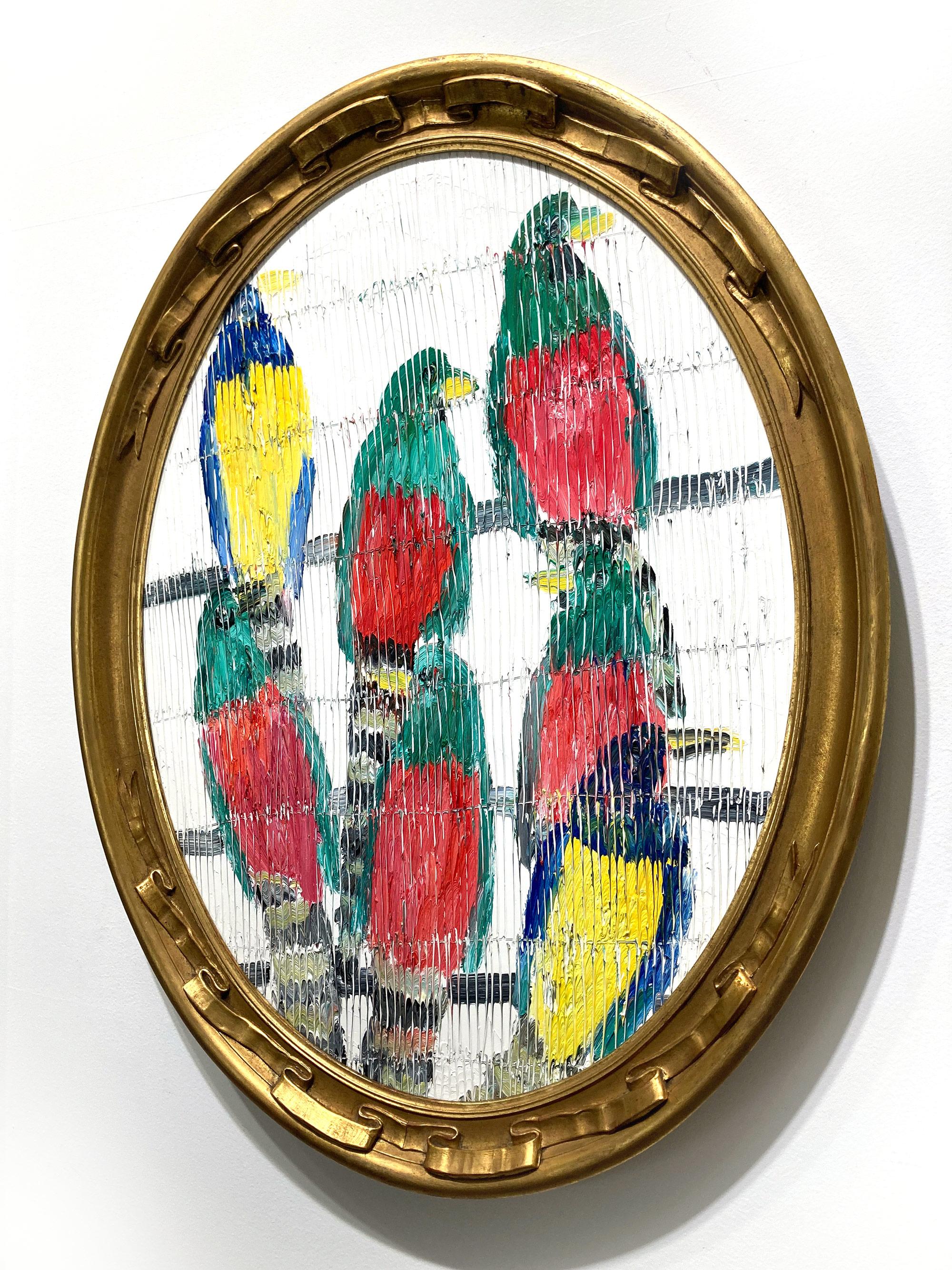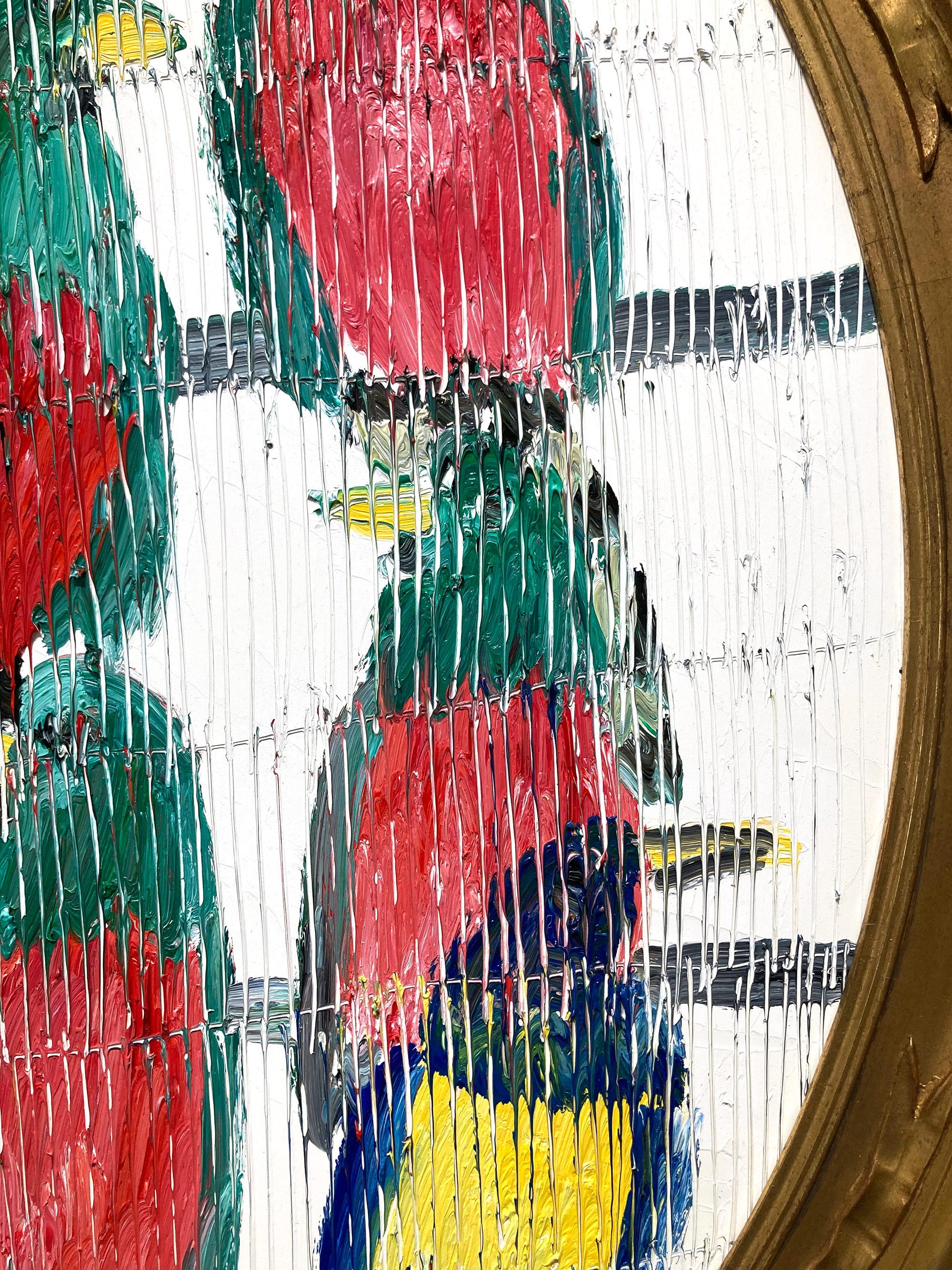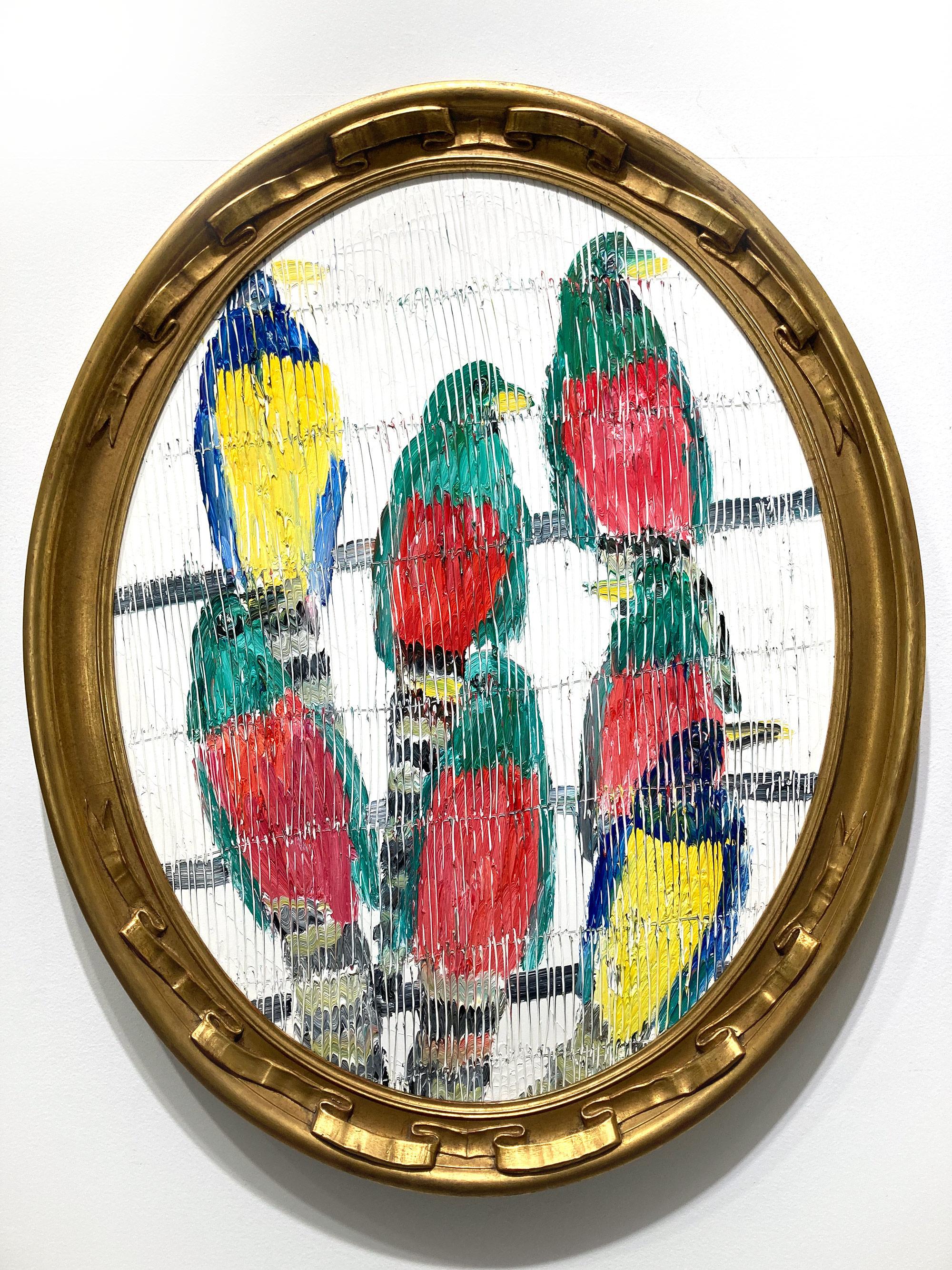 Hunt Slonem"Grand Mott Mott" Multicolored Birds with Background Oil Painting on Wood Framed2025