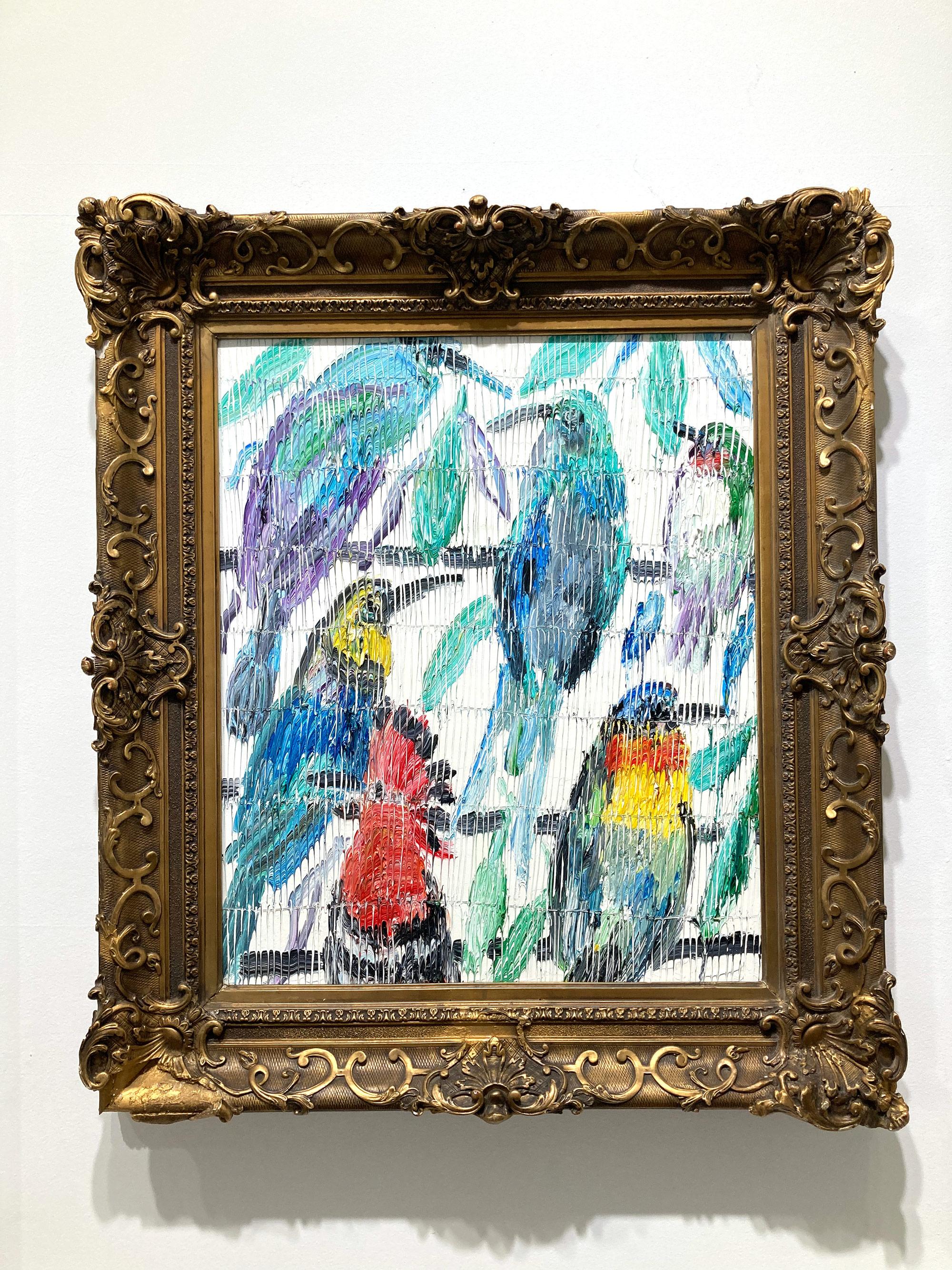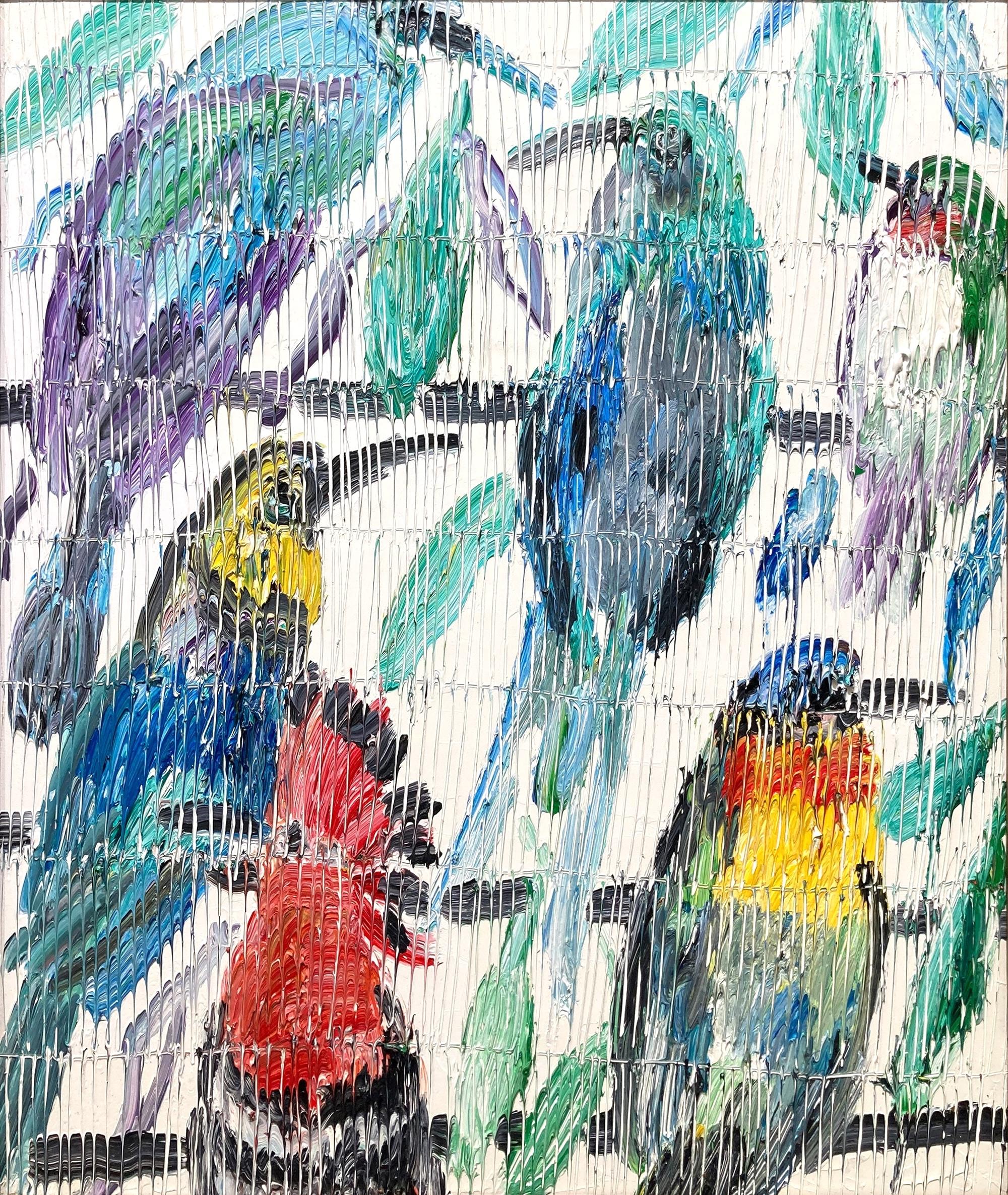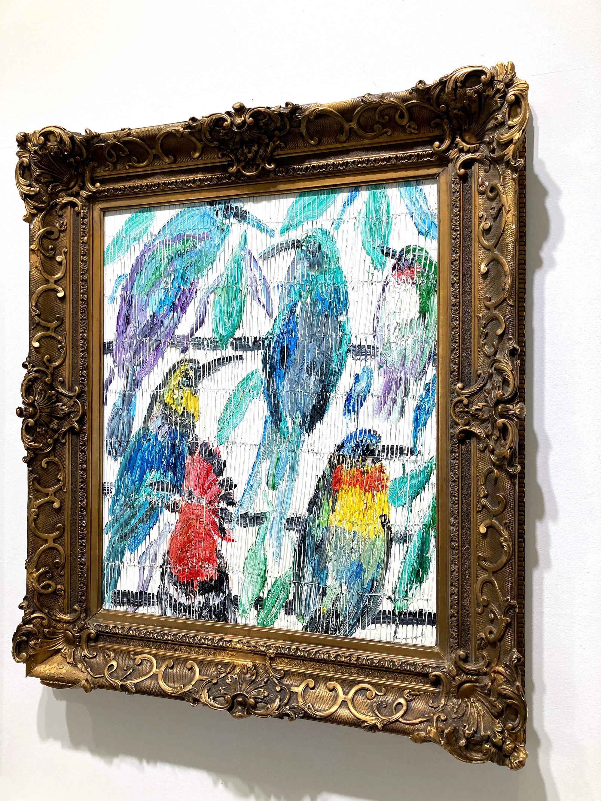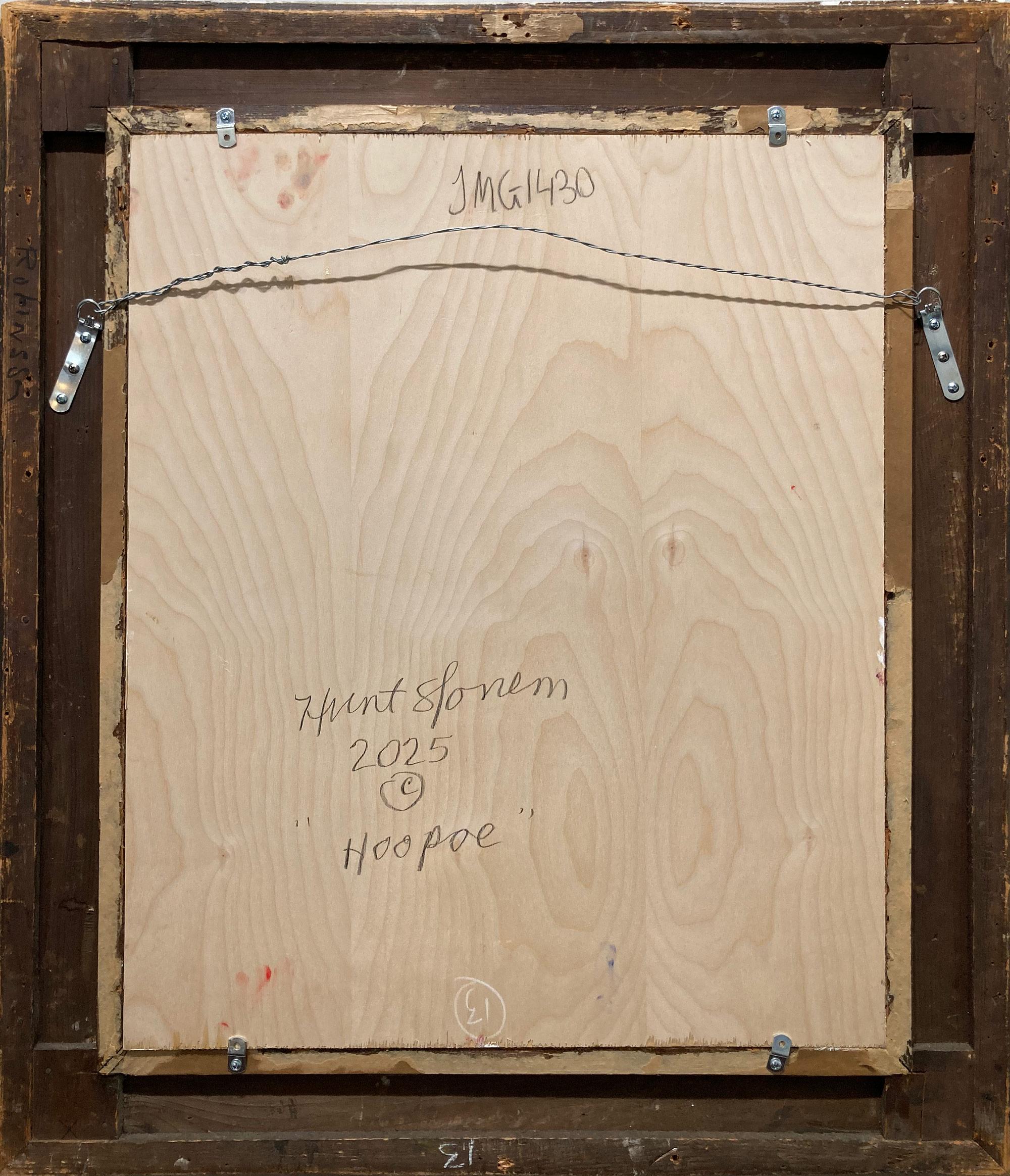 Hunt Slonem"Hoopoe" Multicolored Birds with White Background Oil Painting on Wood Framed2025