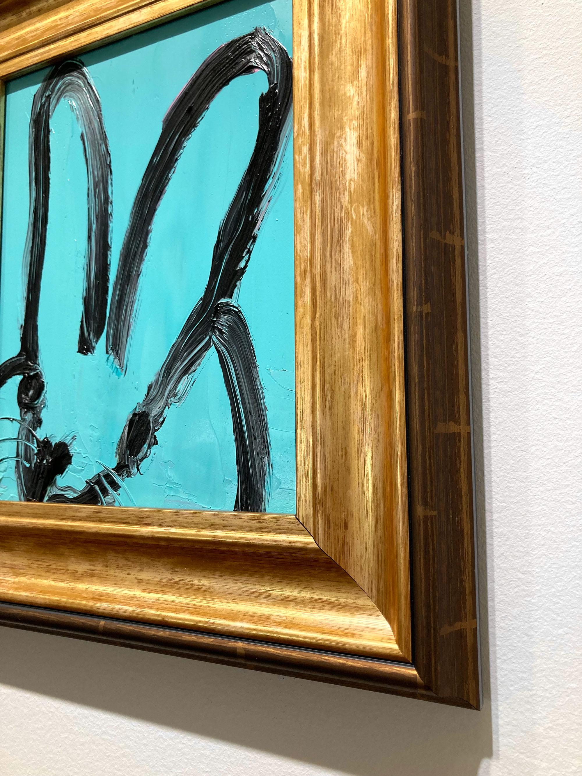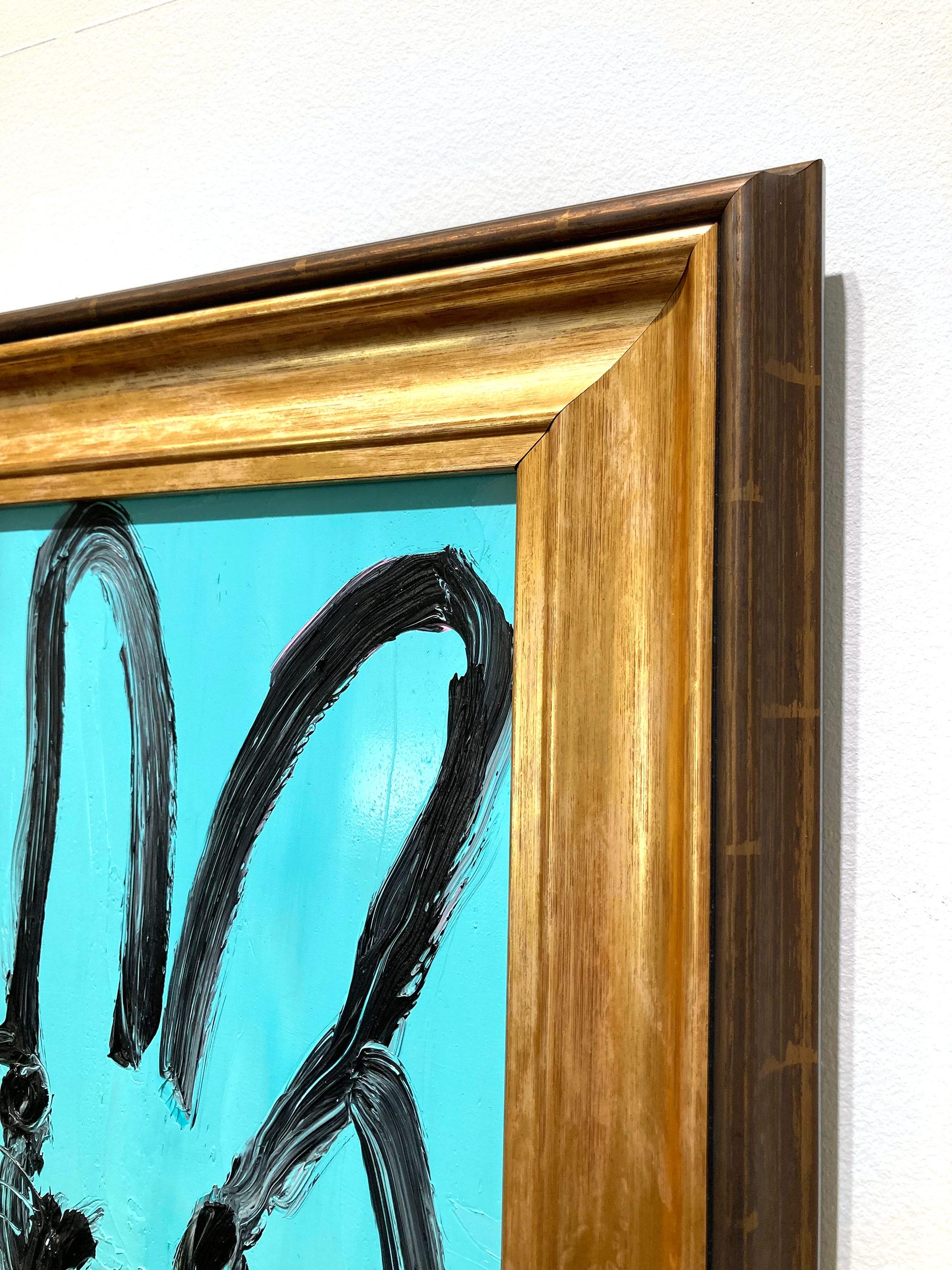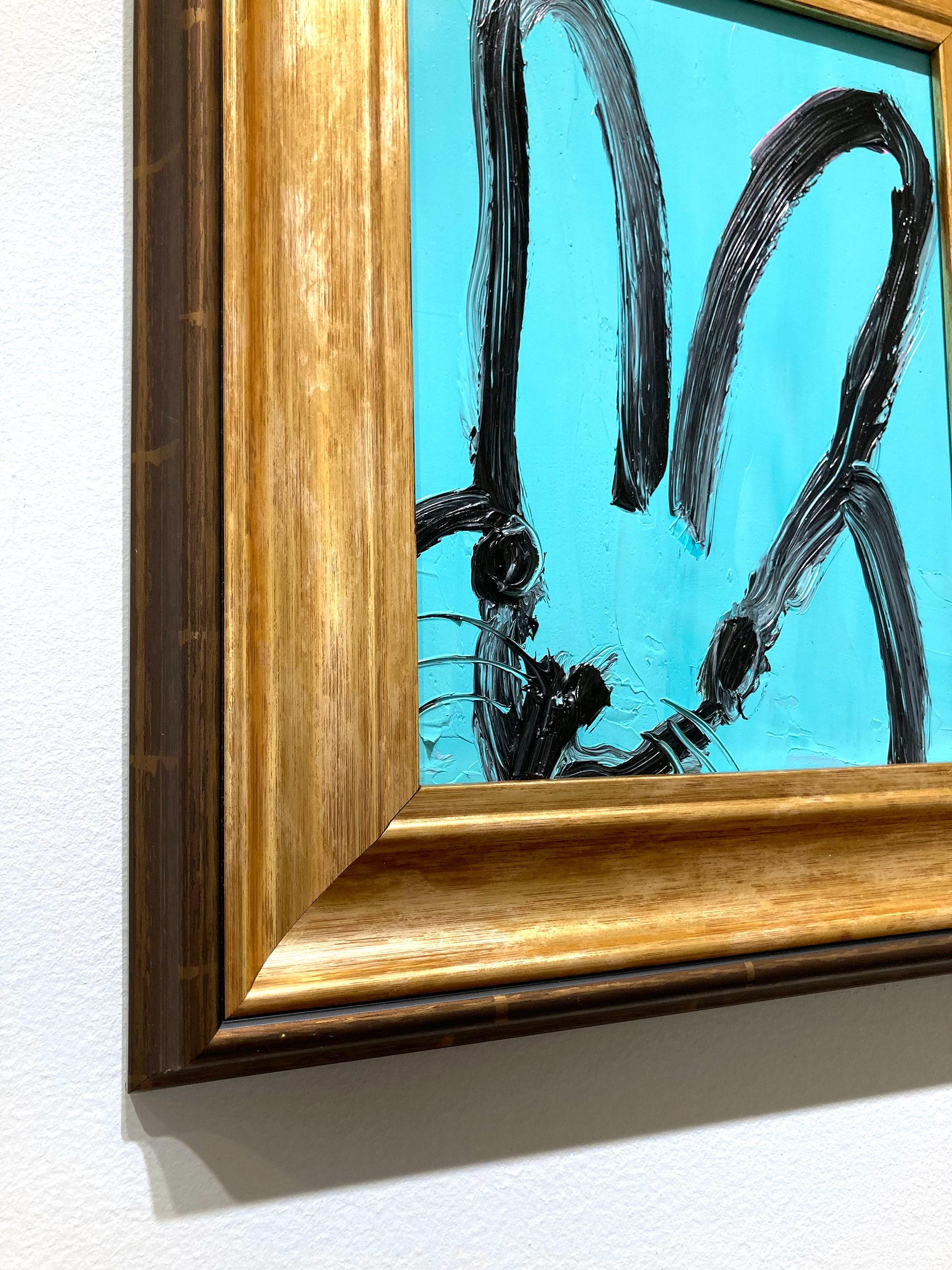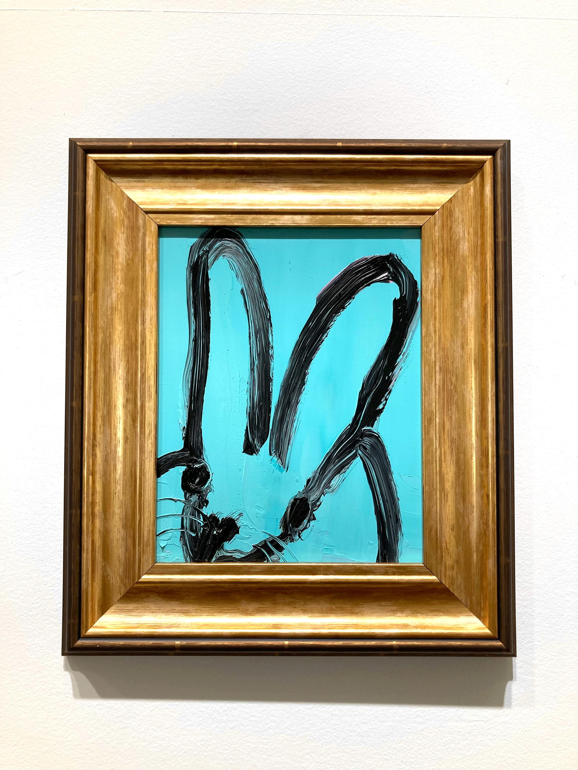 Hunt Slonem"Spa" Black Outline Bunny on Teal Blue Oil Painting on Panel in Antique Frame2025
