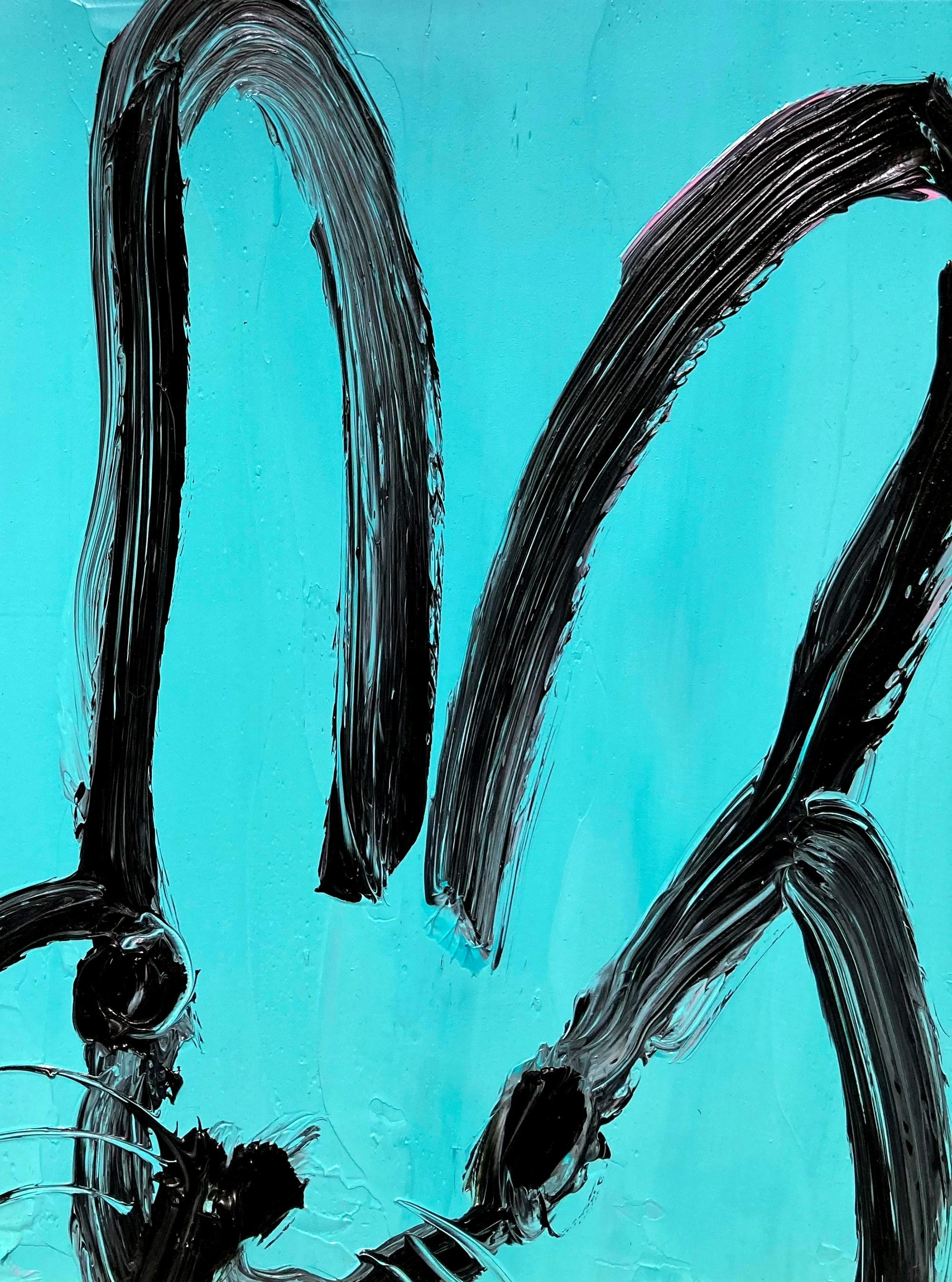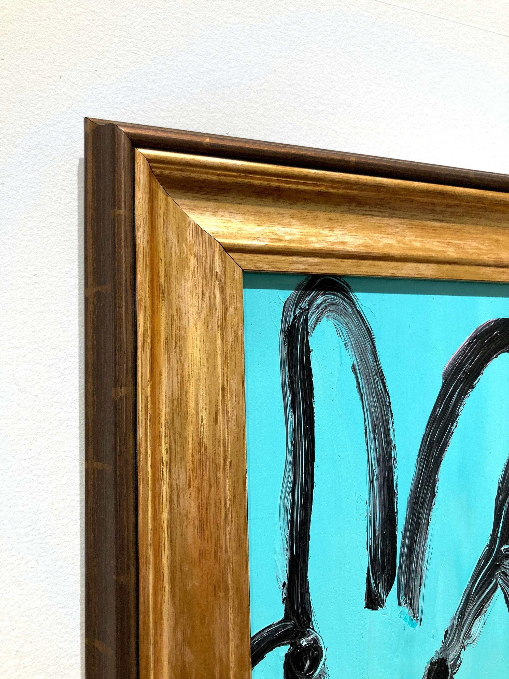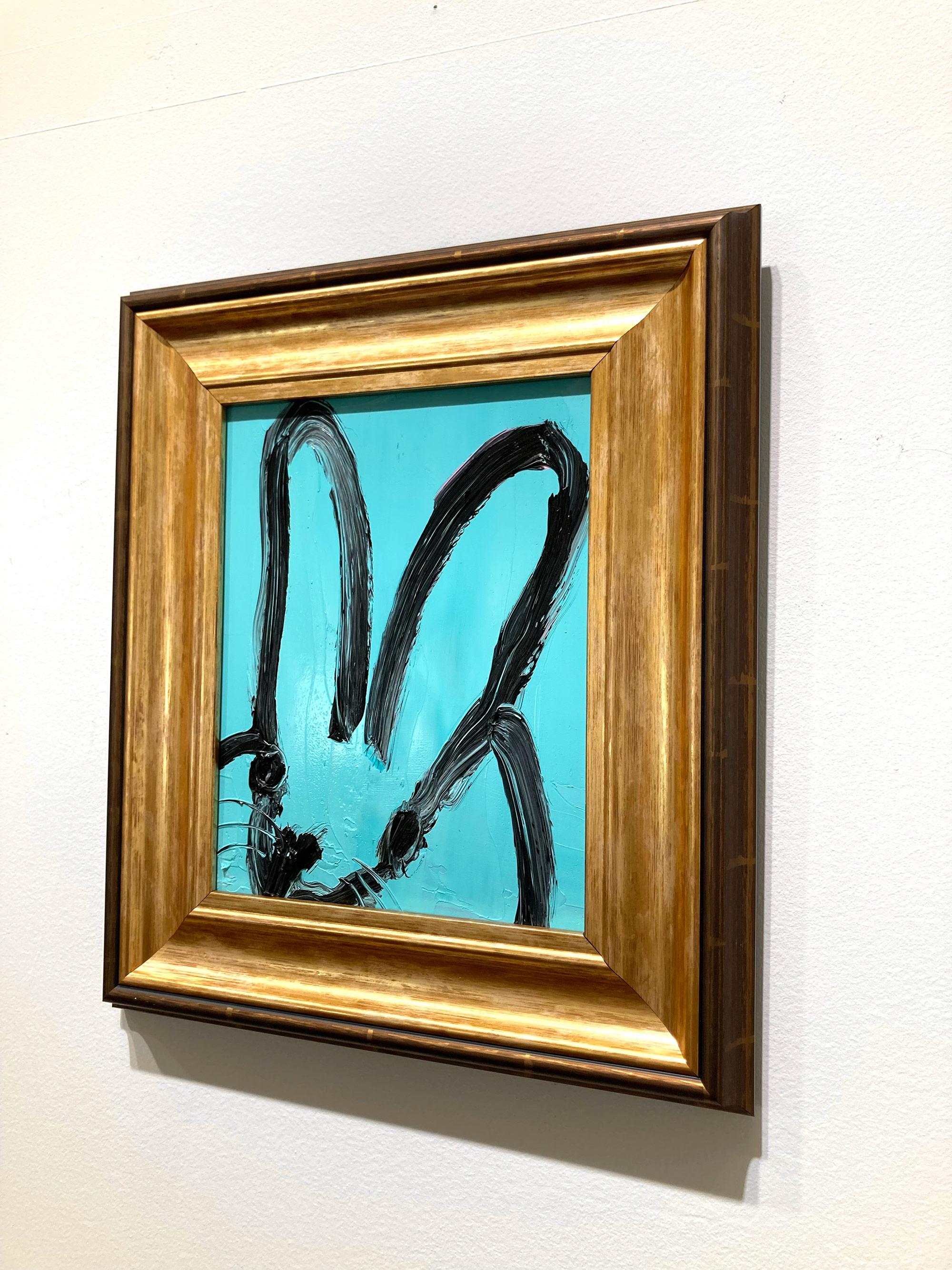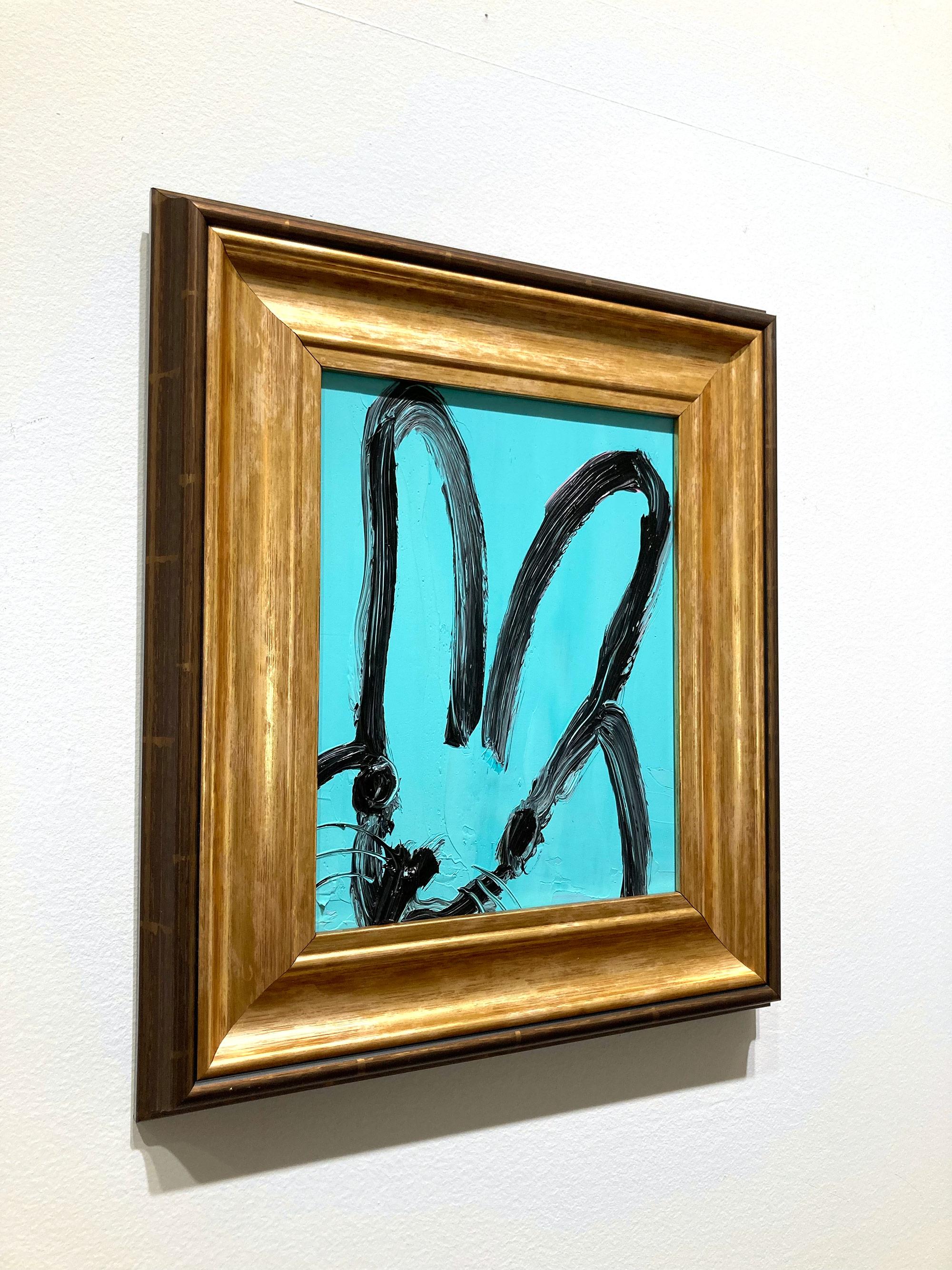 Hunt Slonem"Spa" Black Outline Bunny on Teal Blue Oil Painting on Panel in Antique Frame2025