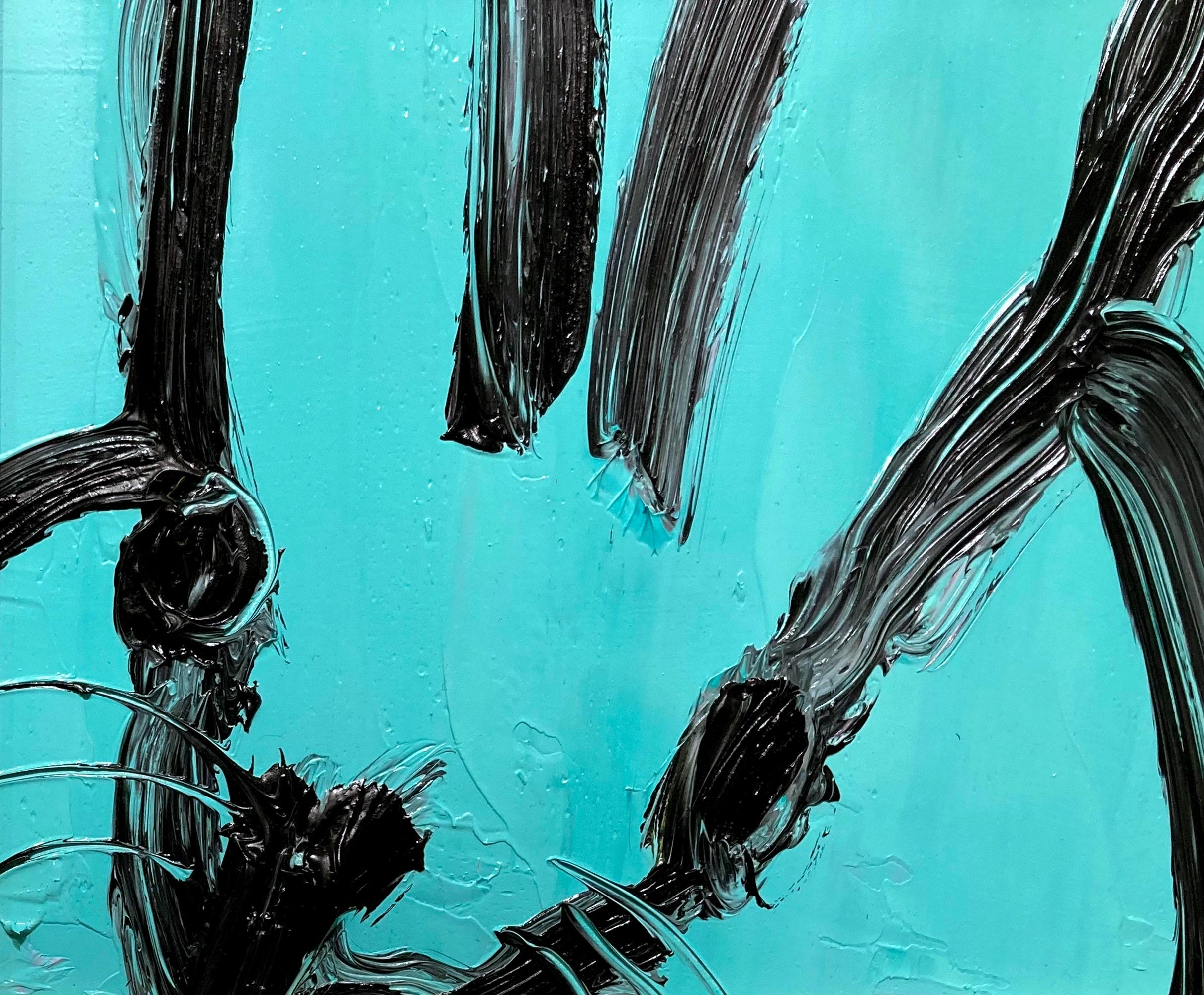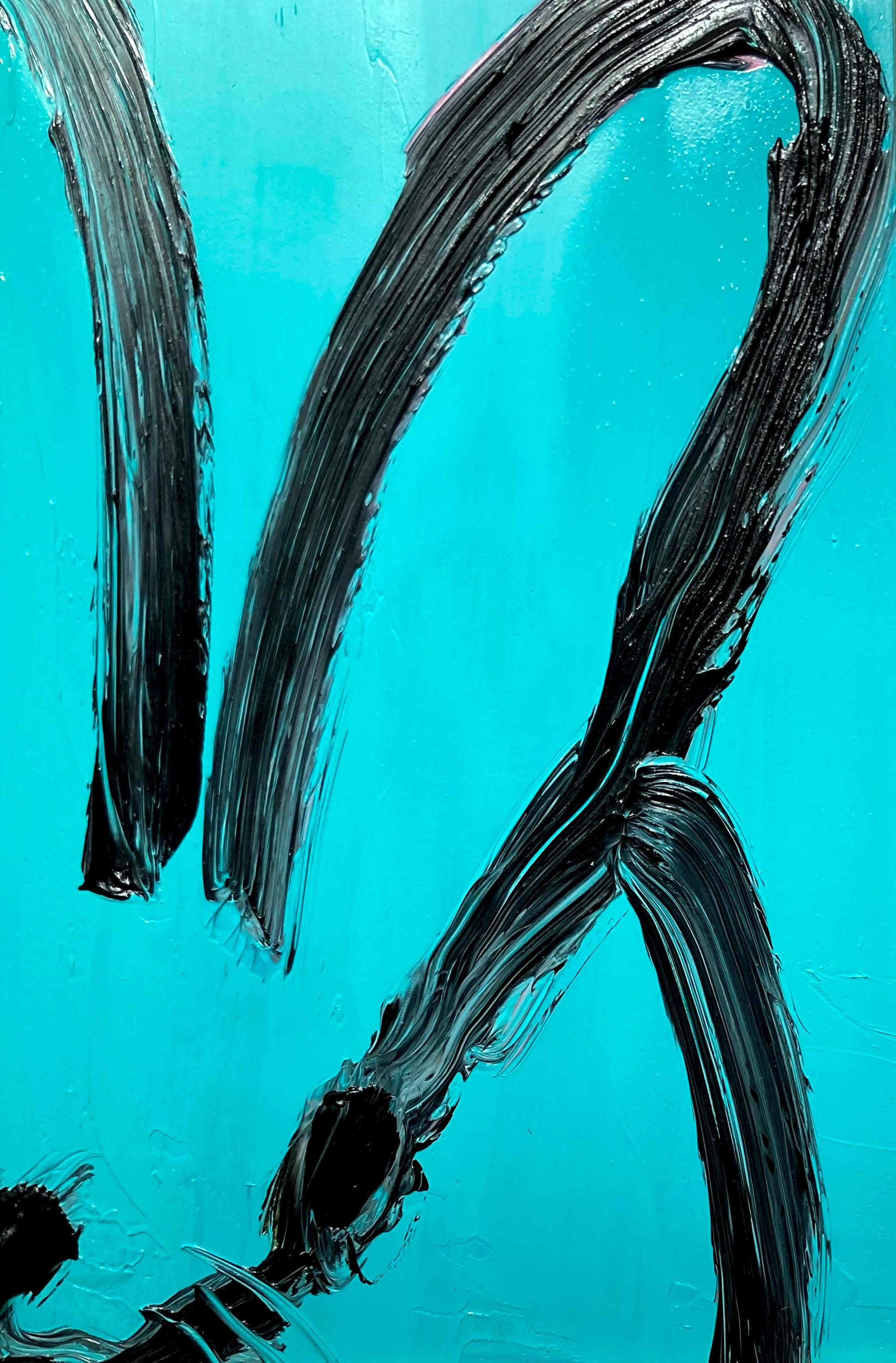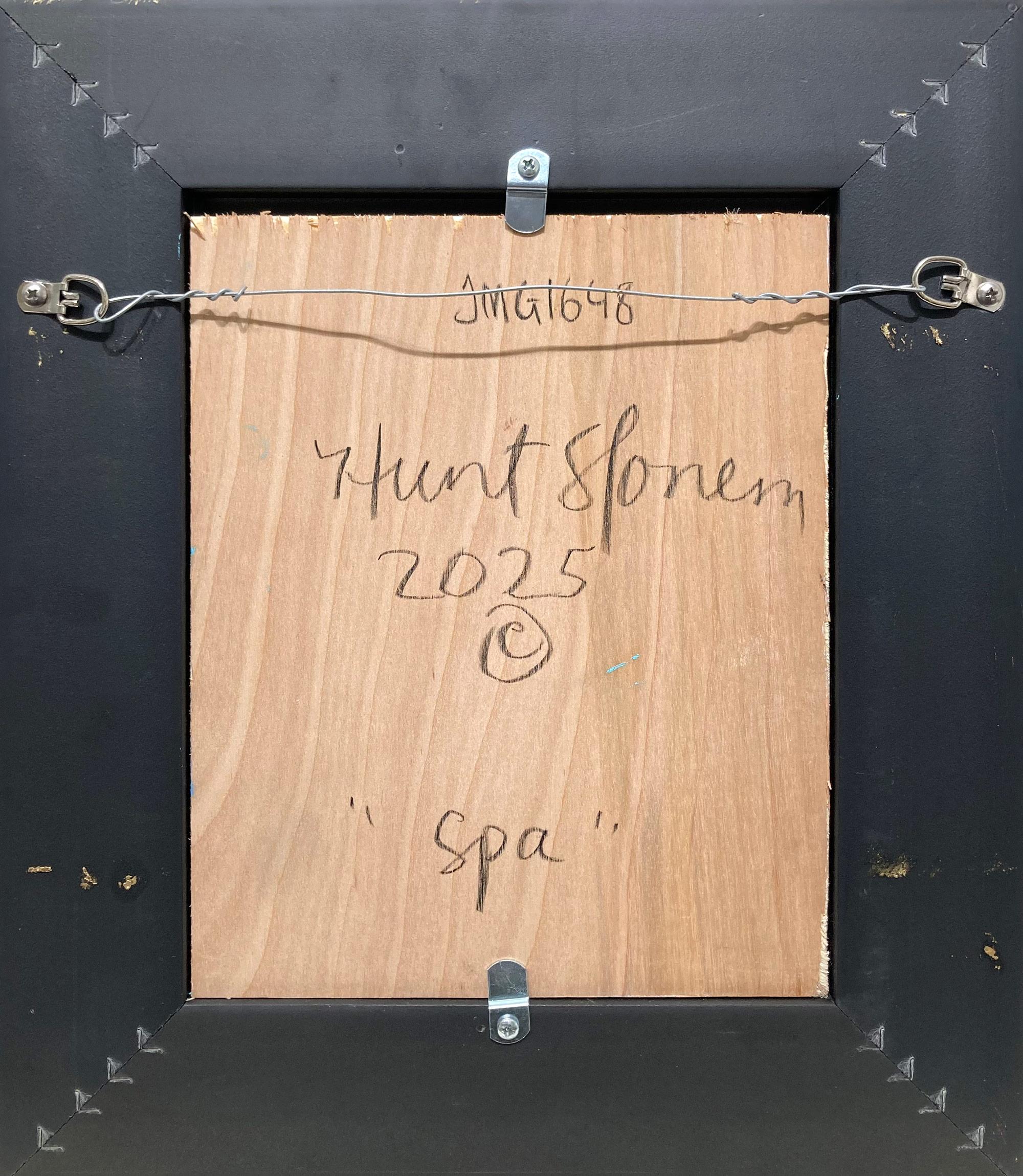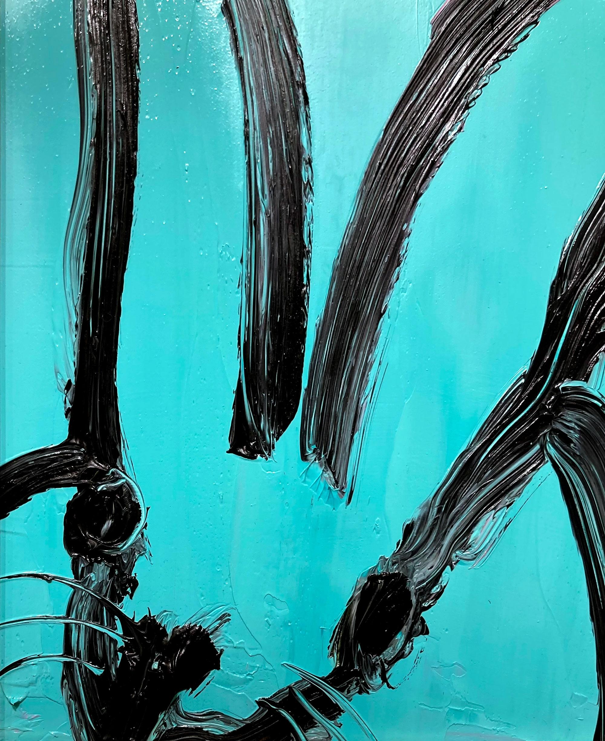 Hunt Slonem"Spa" Black Outline Bunny on Teal Blue Oil Painting on Panel in Antique Frame2025