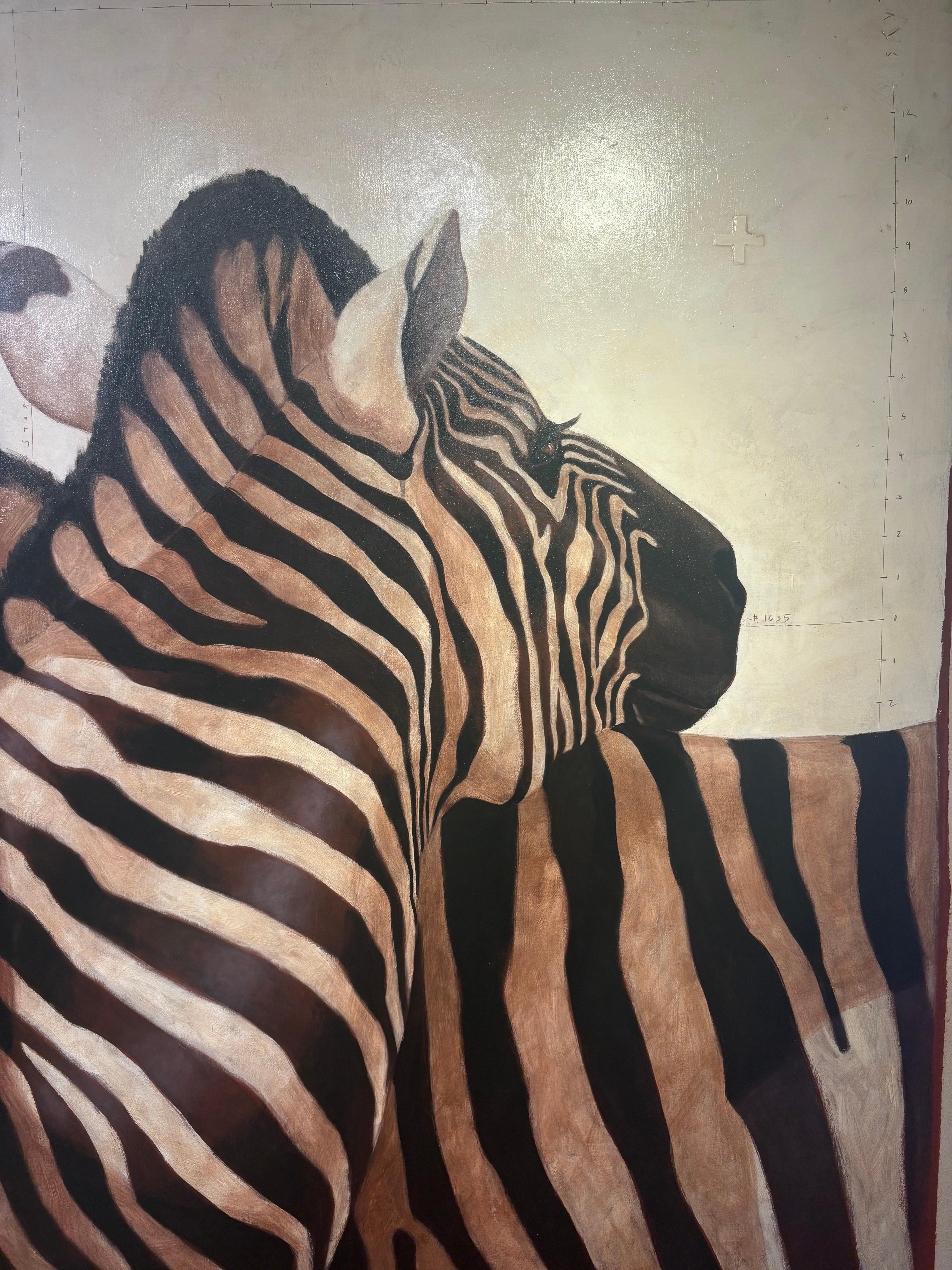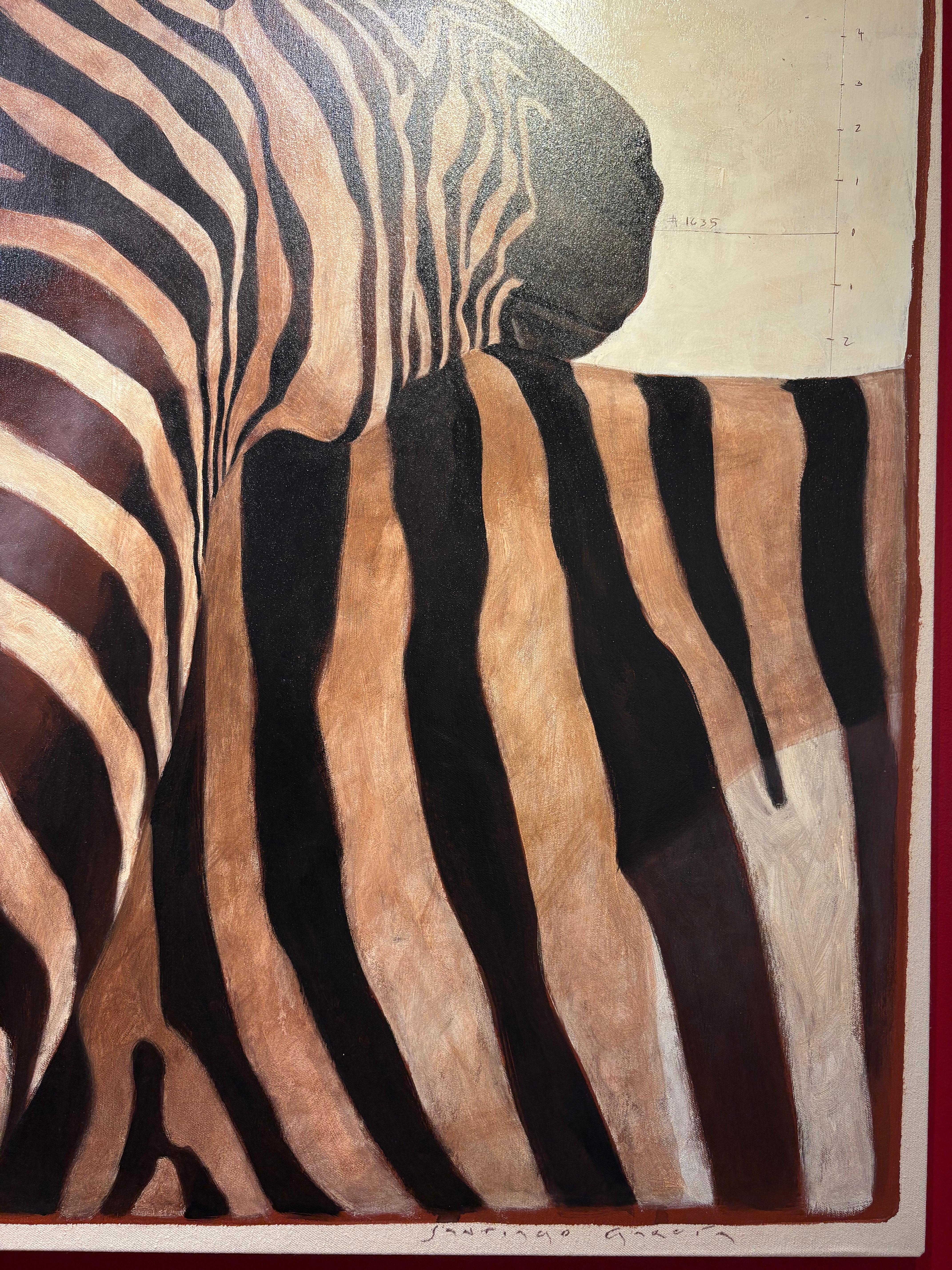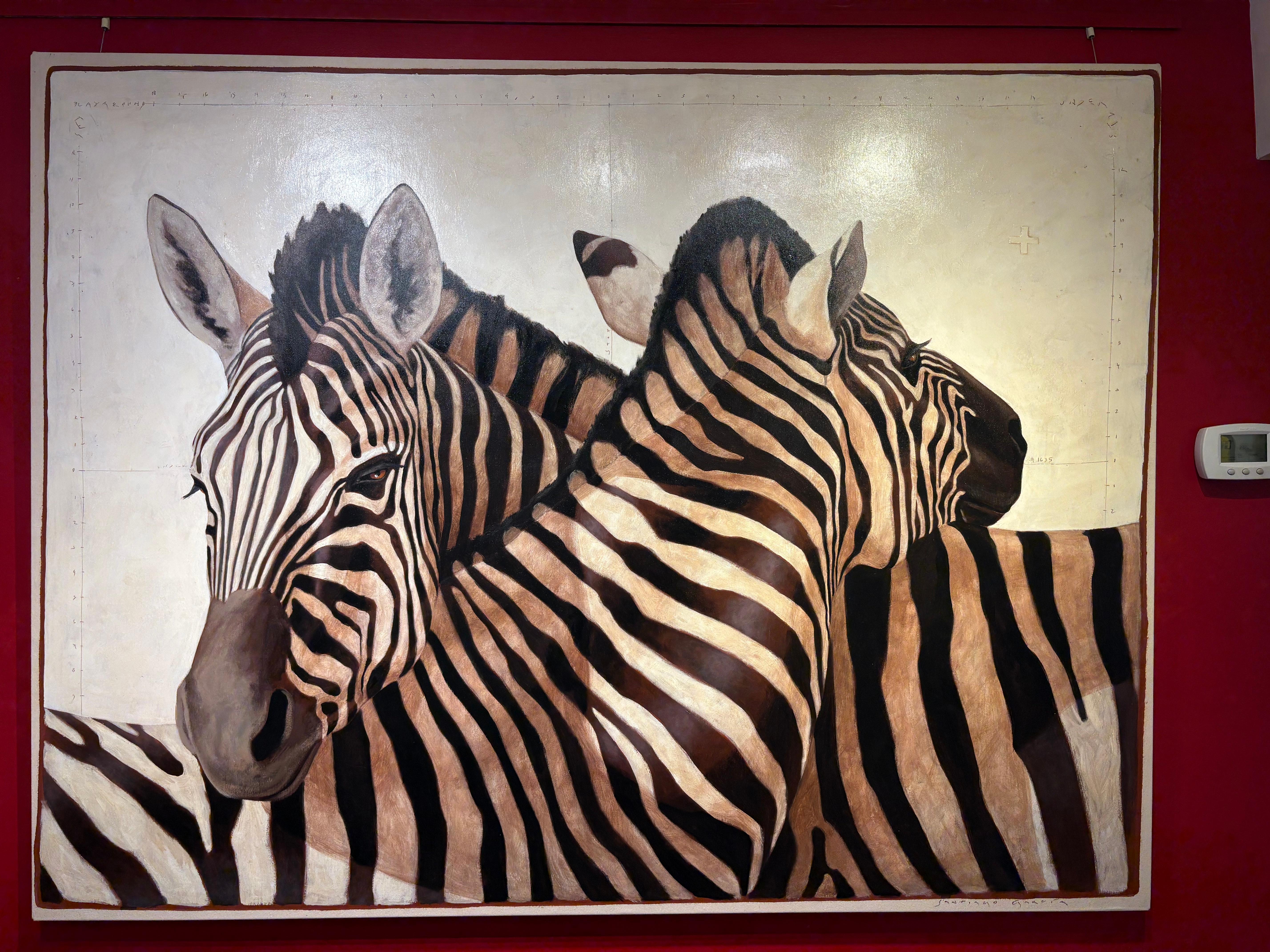 Santiago Garcia"#1635" neutral photorealistic painting of two zebras embracing2025