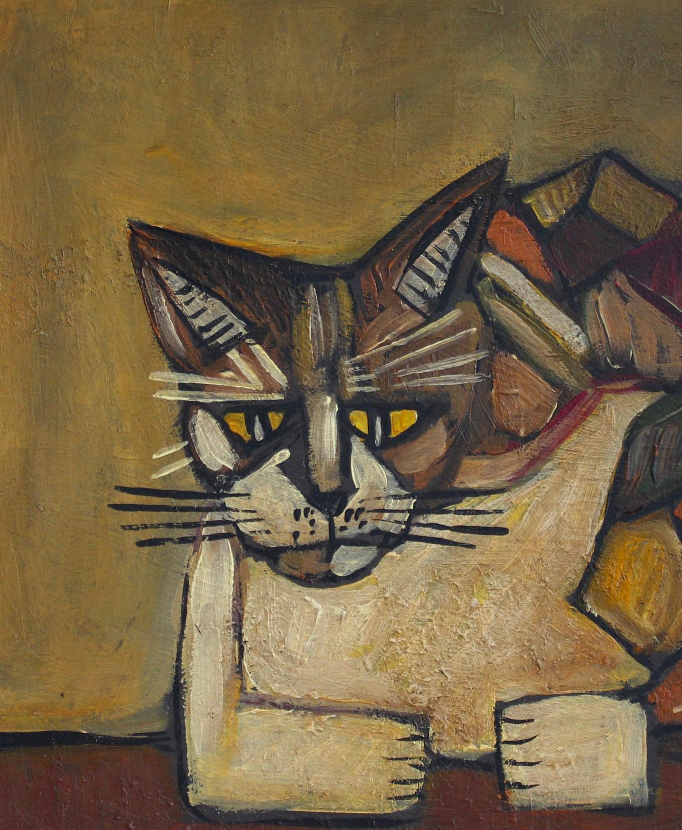 Whimsical oil on paper painting of a tabby cat resting on a rug and backed by large abstract cat forms, circa 1940. Signed lower left.
