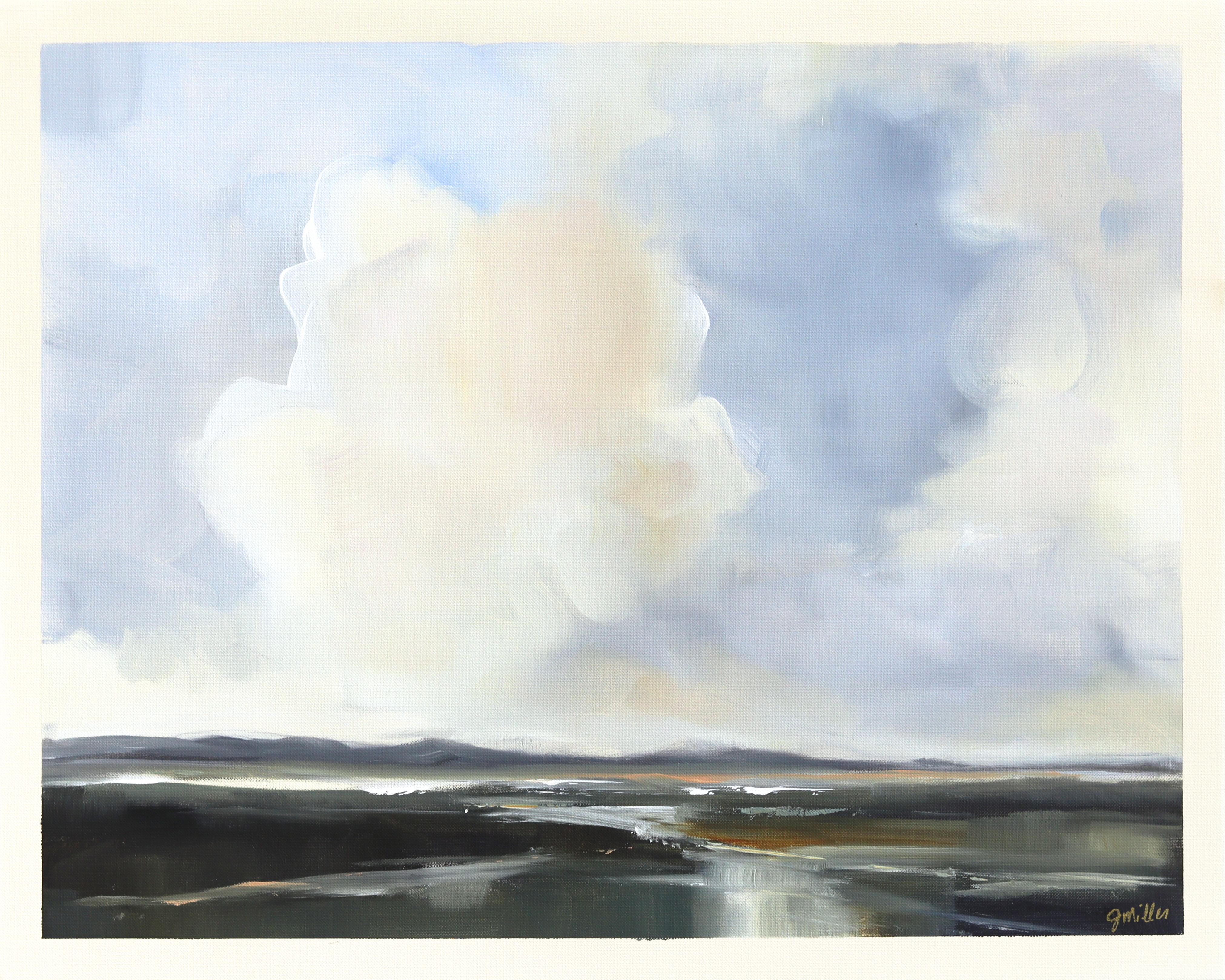 Artist John Jaster captures a Southwestern landscape framed by two towering saguaro cacti and a dry creek bed winding through weathered cliffs. Vivid green and ...