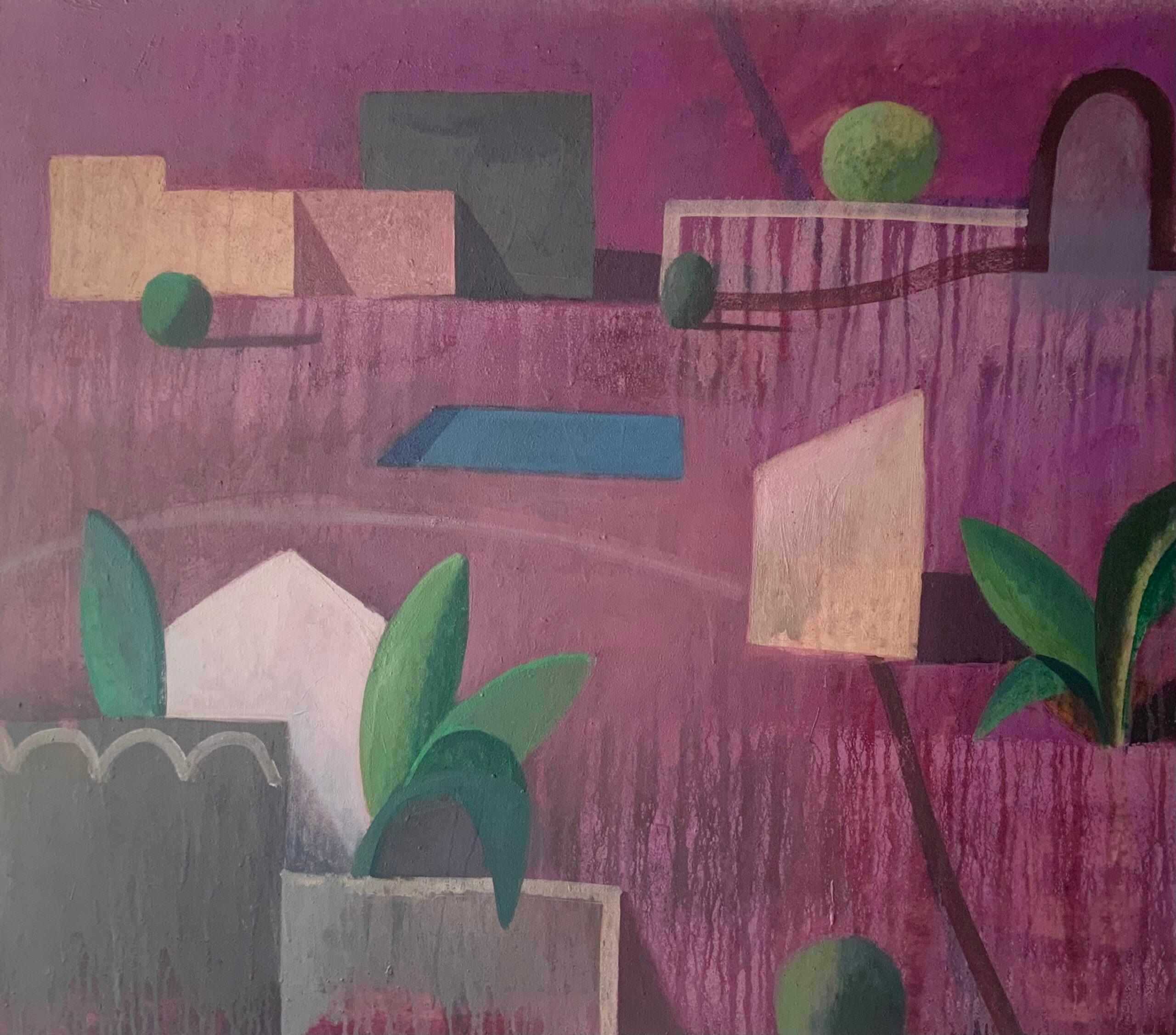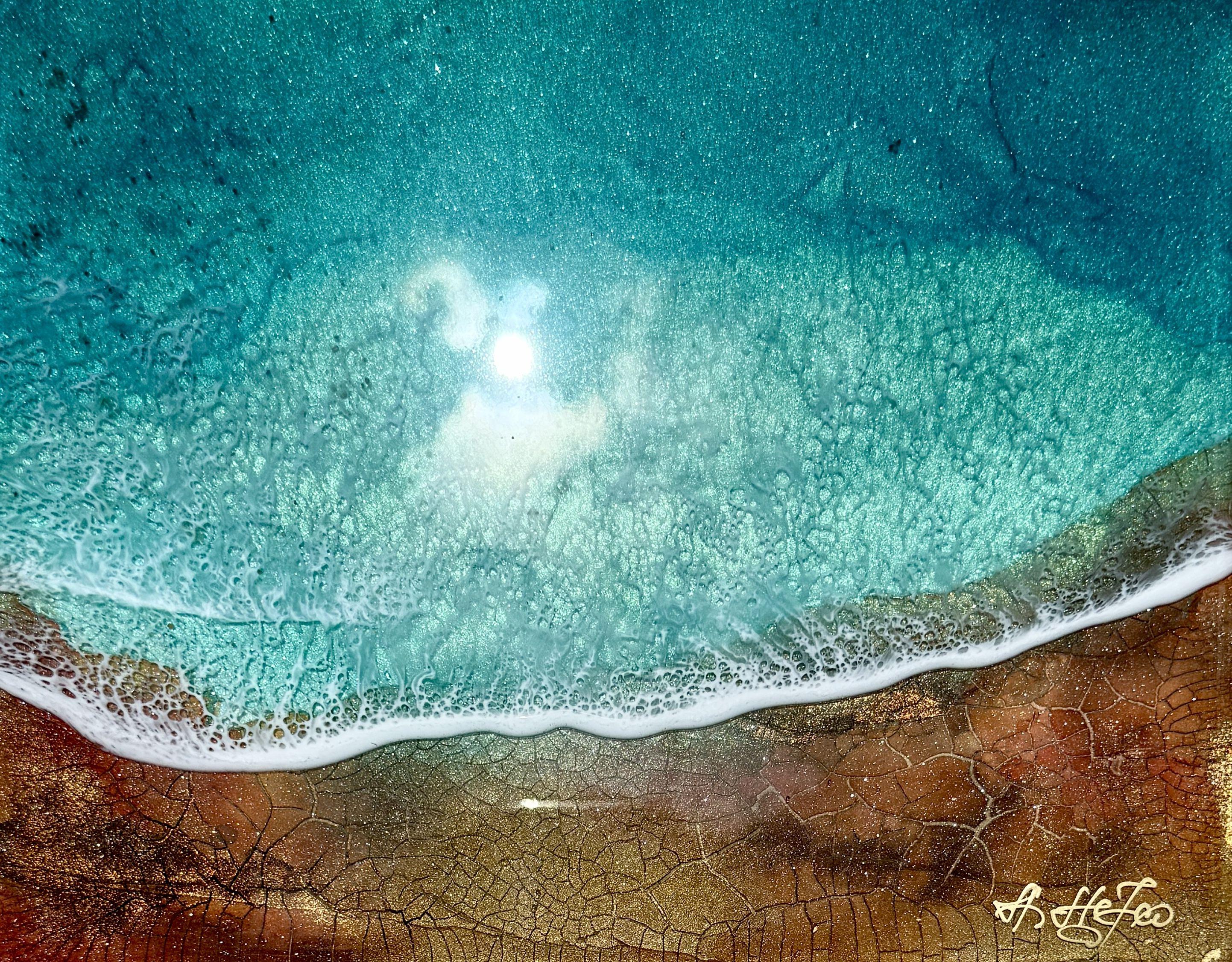 Durán’s palette combines cool marine blues with warm ochres and oranges, evoking the luminous coastal atmosphere characteristic of the Mediterranean.