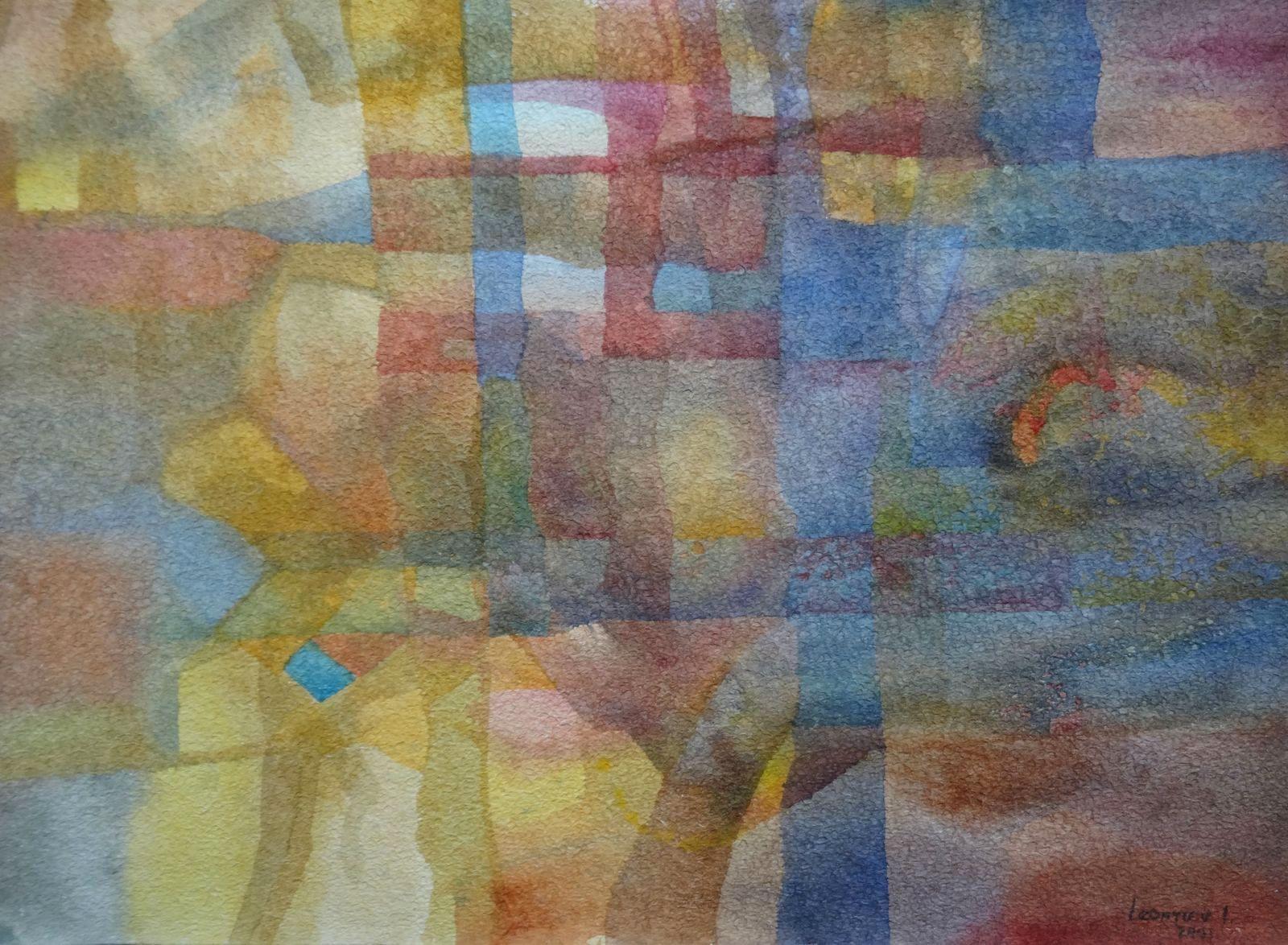 This layered abstract painting evokes an indefinite seascape, where shifting bands of color and gestural line work suggest movement, depth, and natural rhythm. Built through a comple...