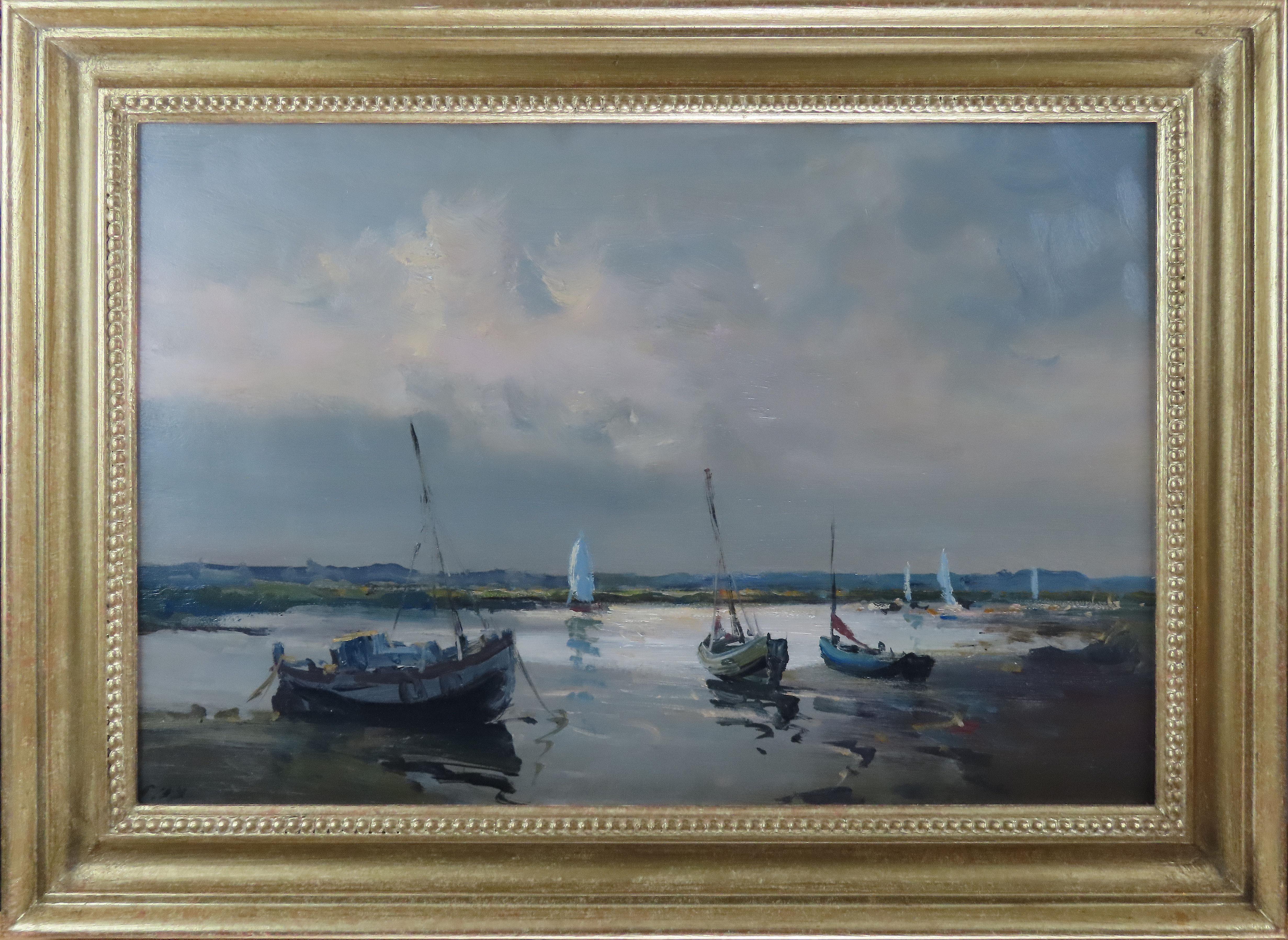 Mid-Century vintage riverscape, a colourful copy of Claude Monet's Sailboats on the Seine at Petit-Gennevilliers. An oil on wood in a gilt frame which sets off the painting beautifu...