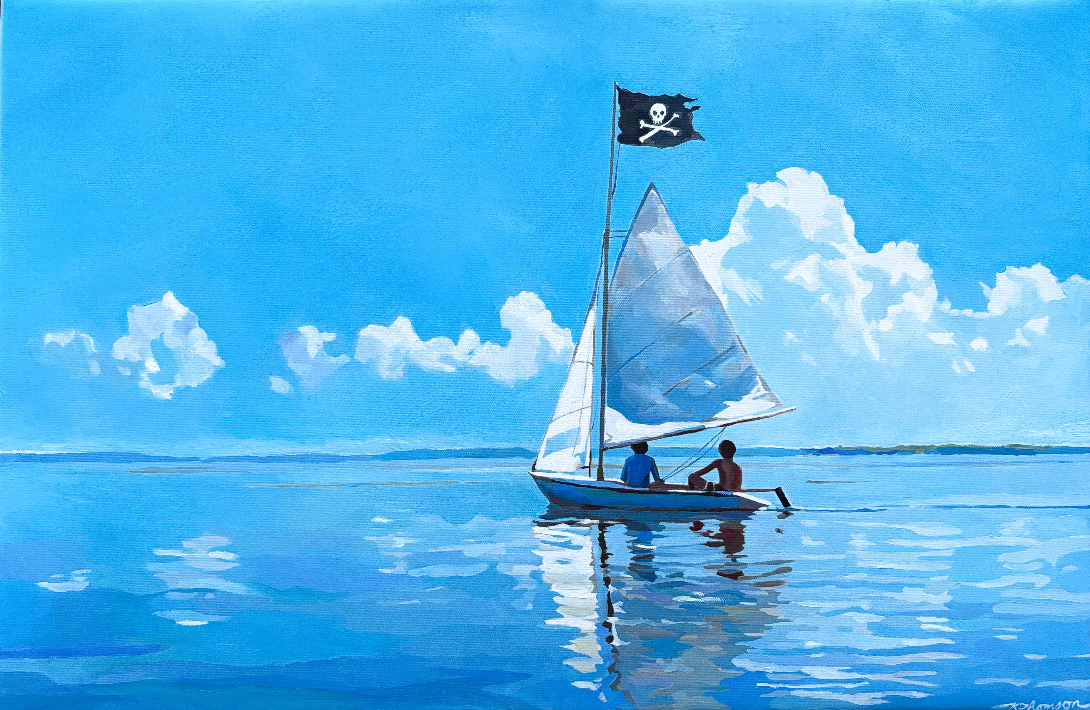 Artist John Jaster captures a Southwestern landscape framed by two towering saguaro cacti and a dry creek bed winding through weathered cliffs. Vivid green and ...