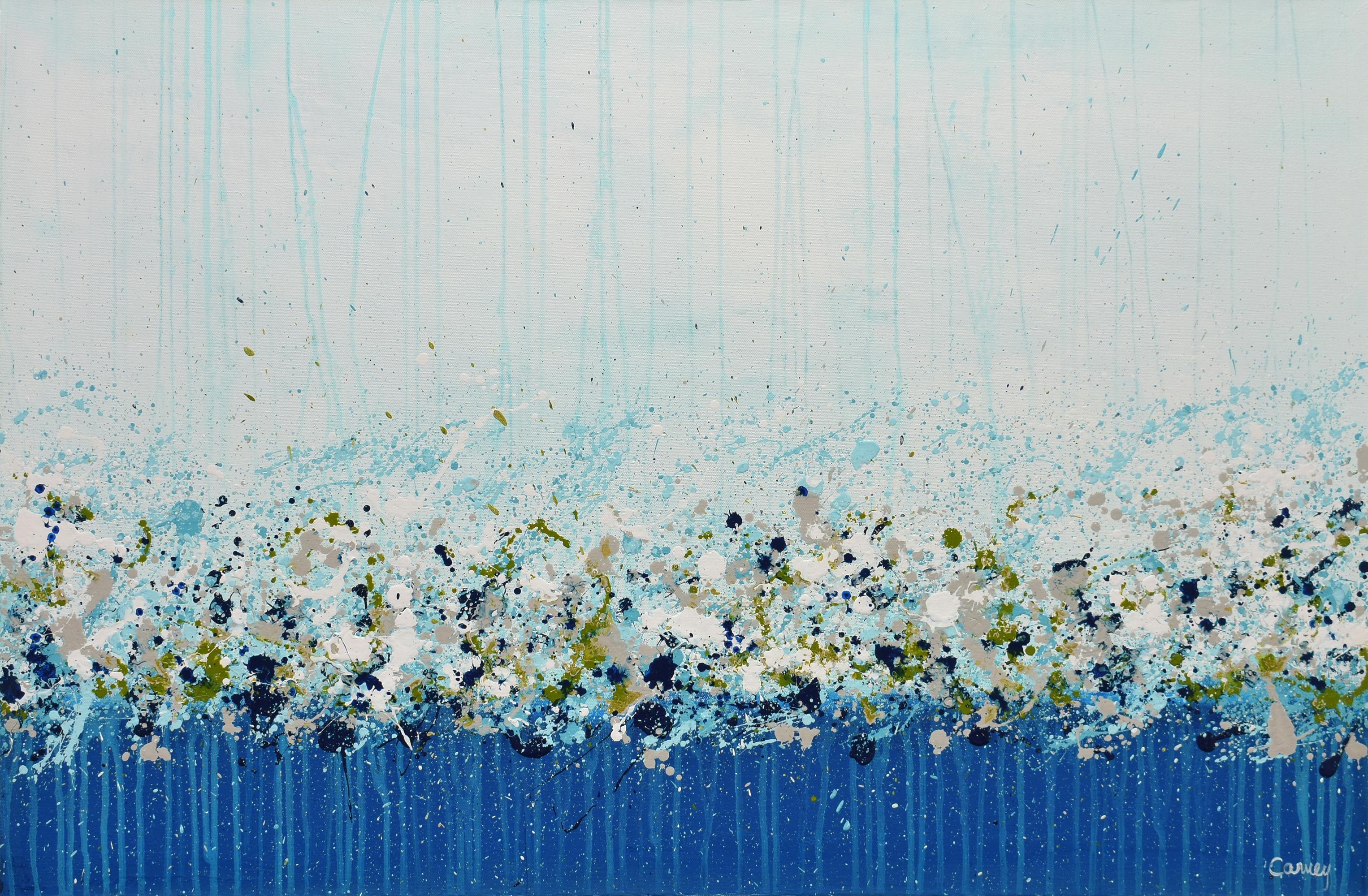 Shades of blue, green, and white suggest a peaceful landscape. The painting reflects the quiet, expansive spaces in nature that always draw artist Kajal Zaveri....