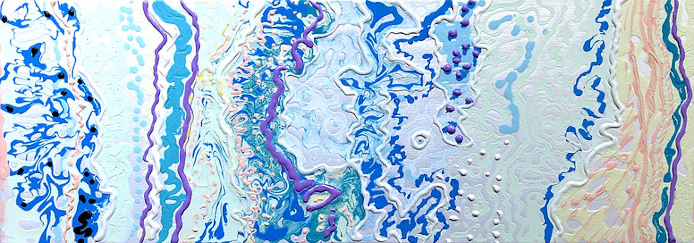 Shades of blue, green, and white suggest a peaceful landscape. The painting reflects the quiet, expansive spaces in nature that always draw artist Kajal Zaveri....