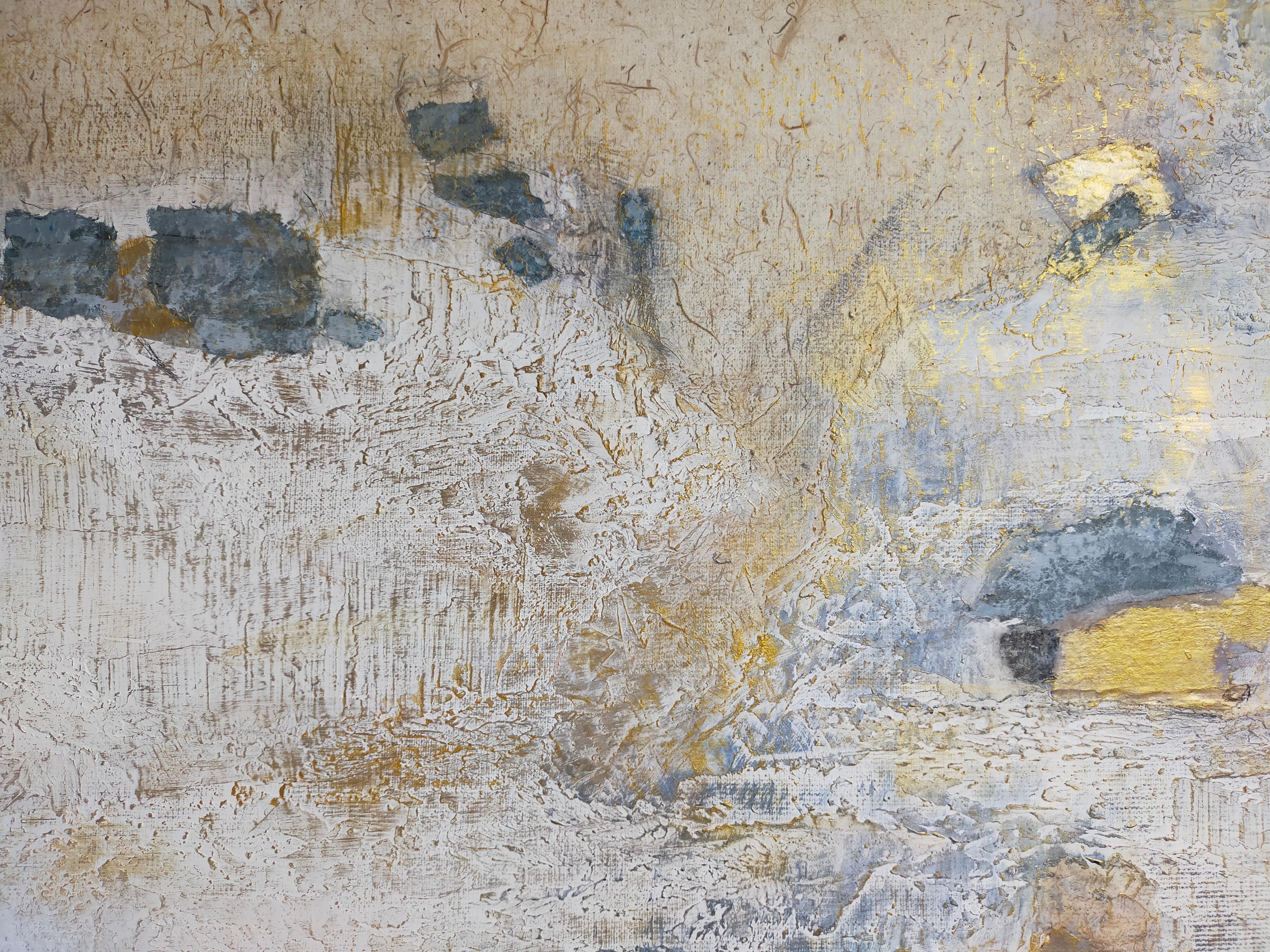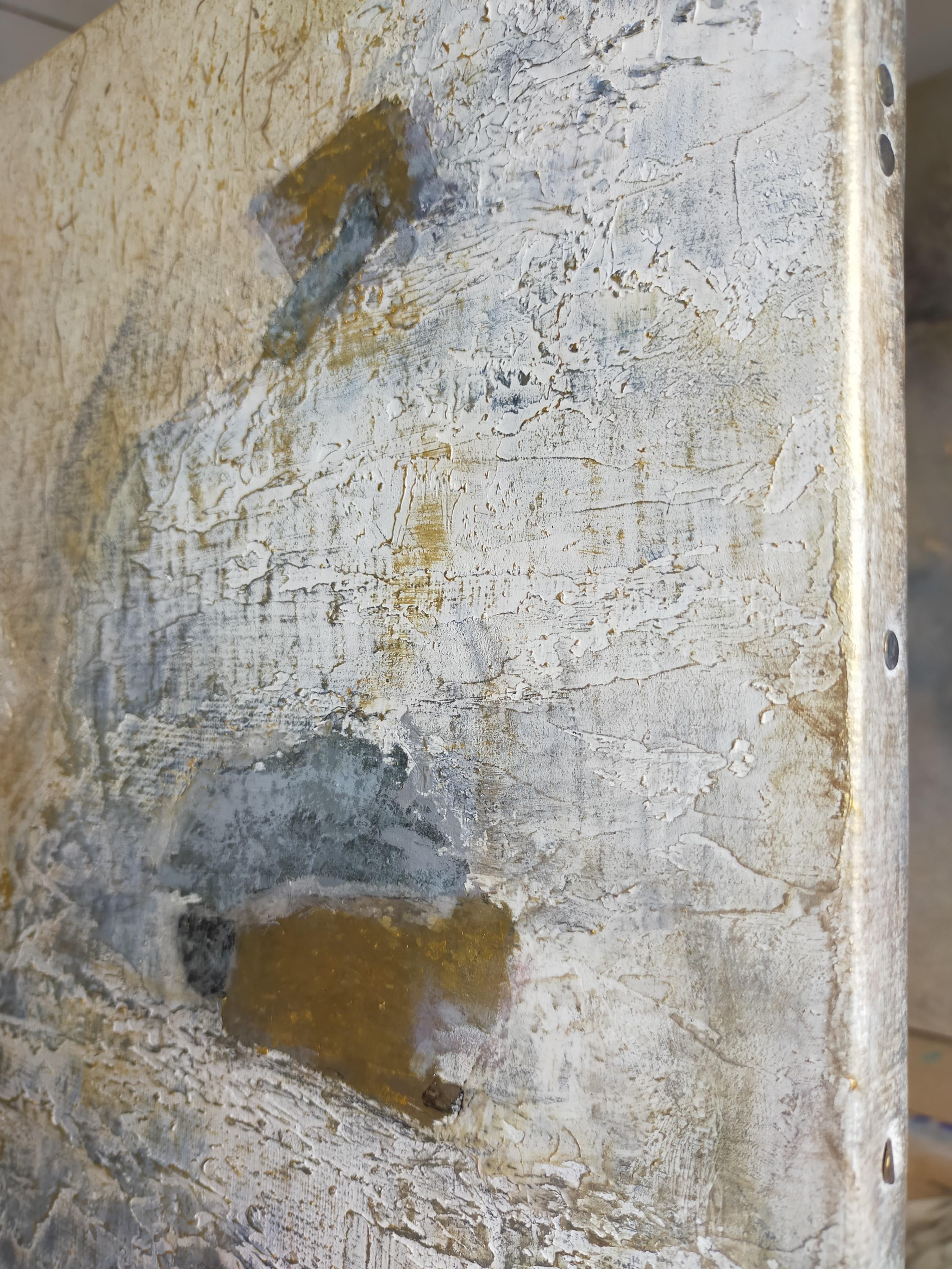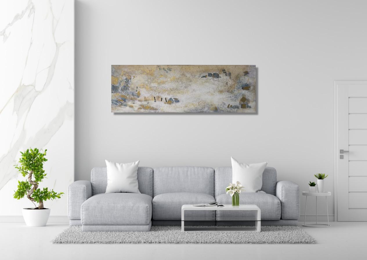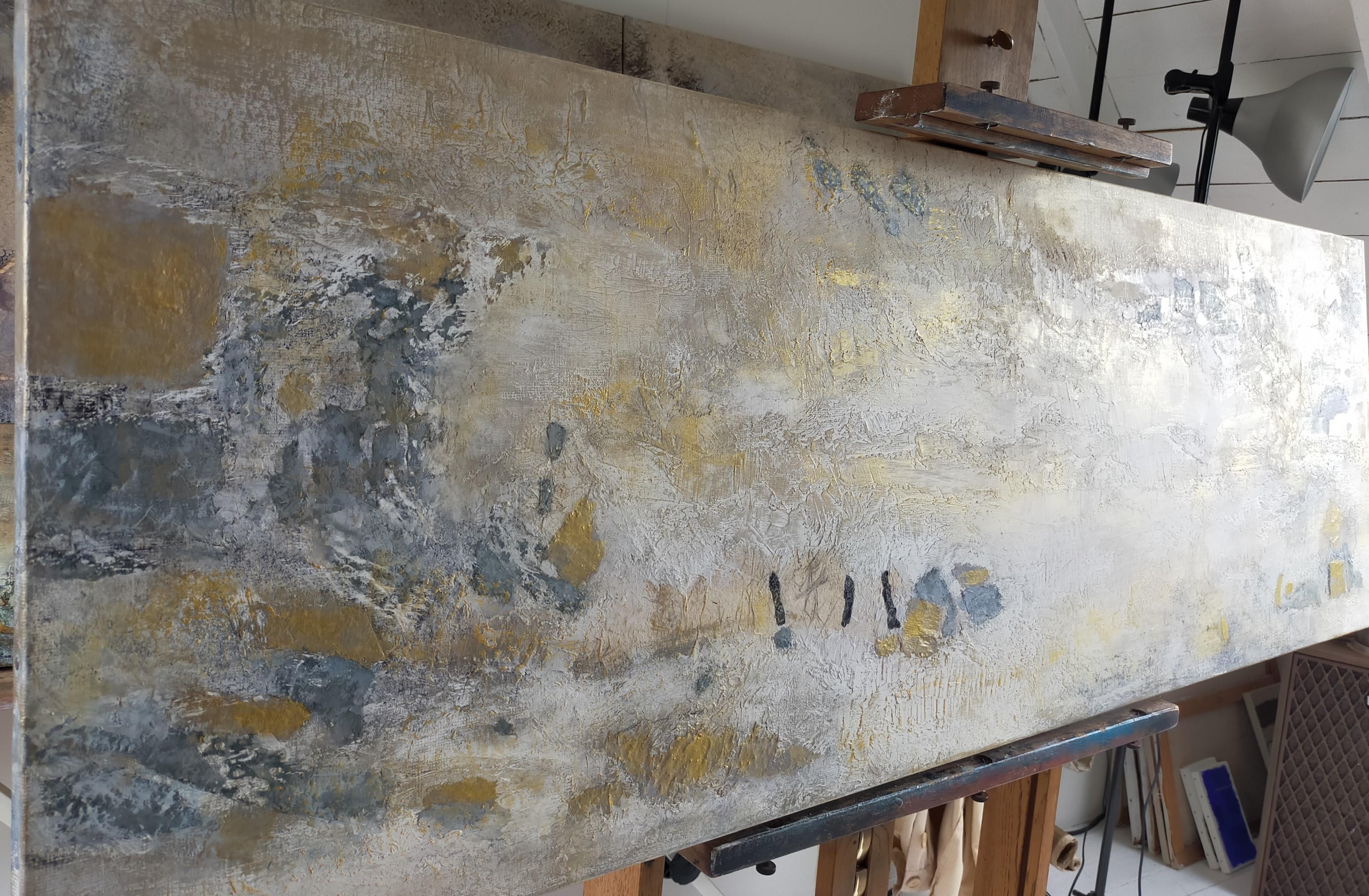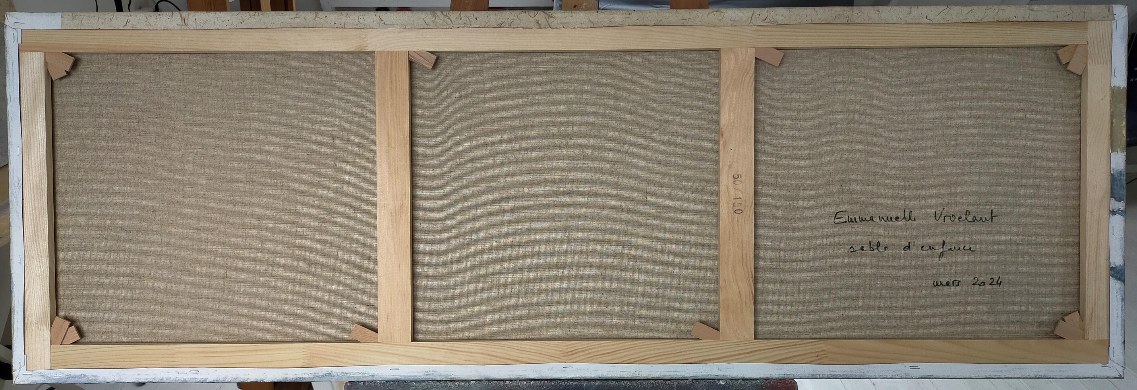 Emmanuelle Vroelant"Childhood sand-1" abstract acrylique, collage, marble on linen canvas 50x140cm2024