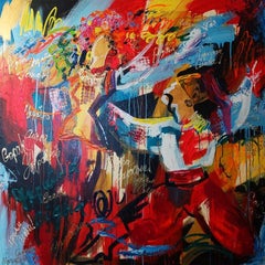 Contemporary figurative painting with lots of details and movement. Beautiful statement piece for any art collection. Combining a lot of different colors in any interiors and setting...