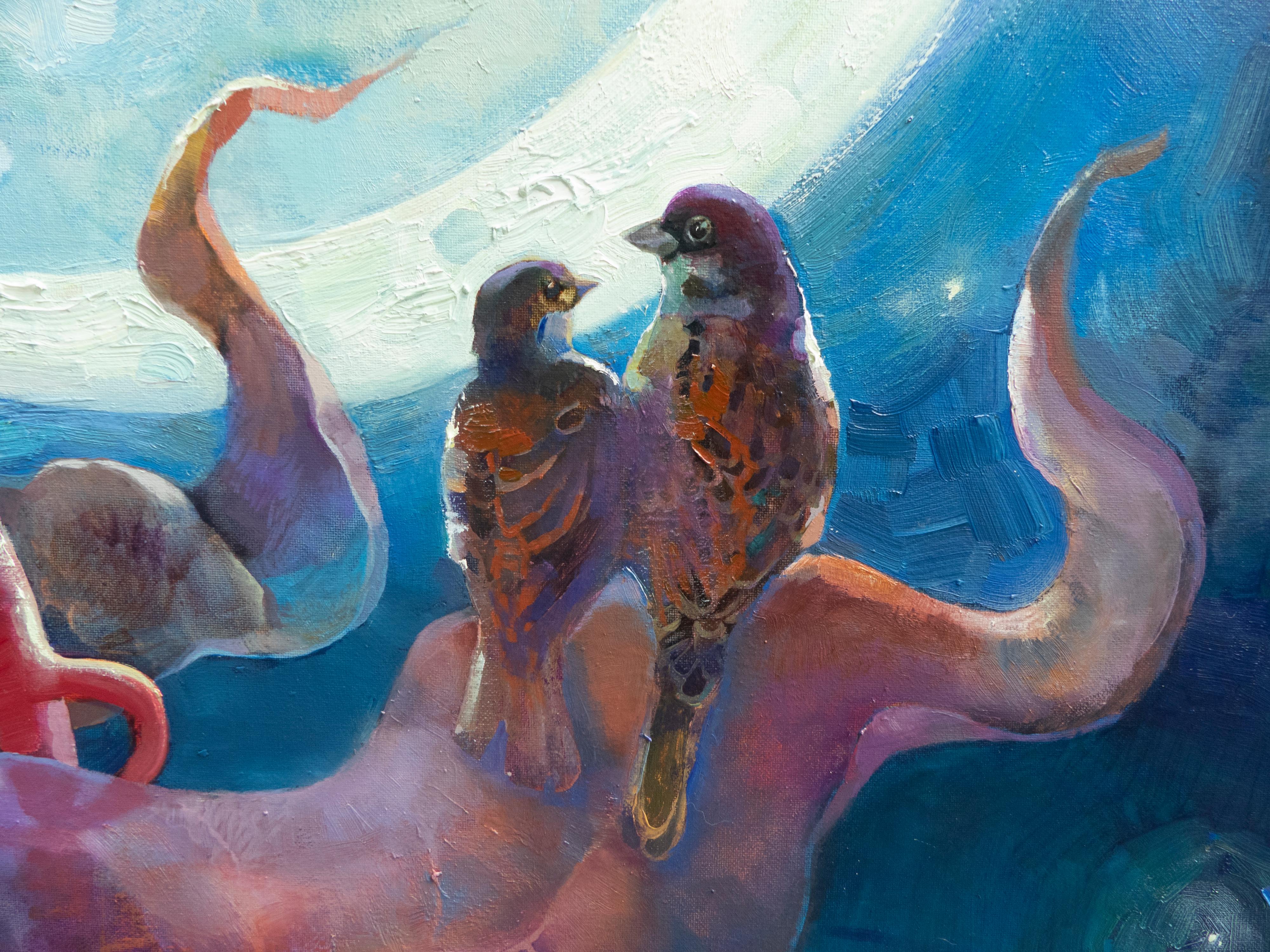 Moment of Eclipse portrays the poetic stillness of a rare lunar eclipse — that fleeting moment when the Earth gently slips between the Sun and the Moon, casting its shadow across the sky. A radiant sunflower and two sparrows quietly observe this celestial event, embodying a tender connection between nature and the cosmos.