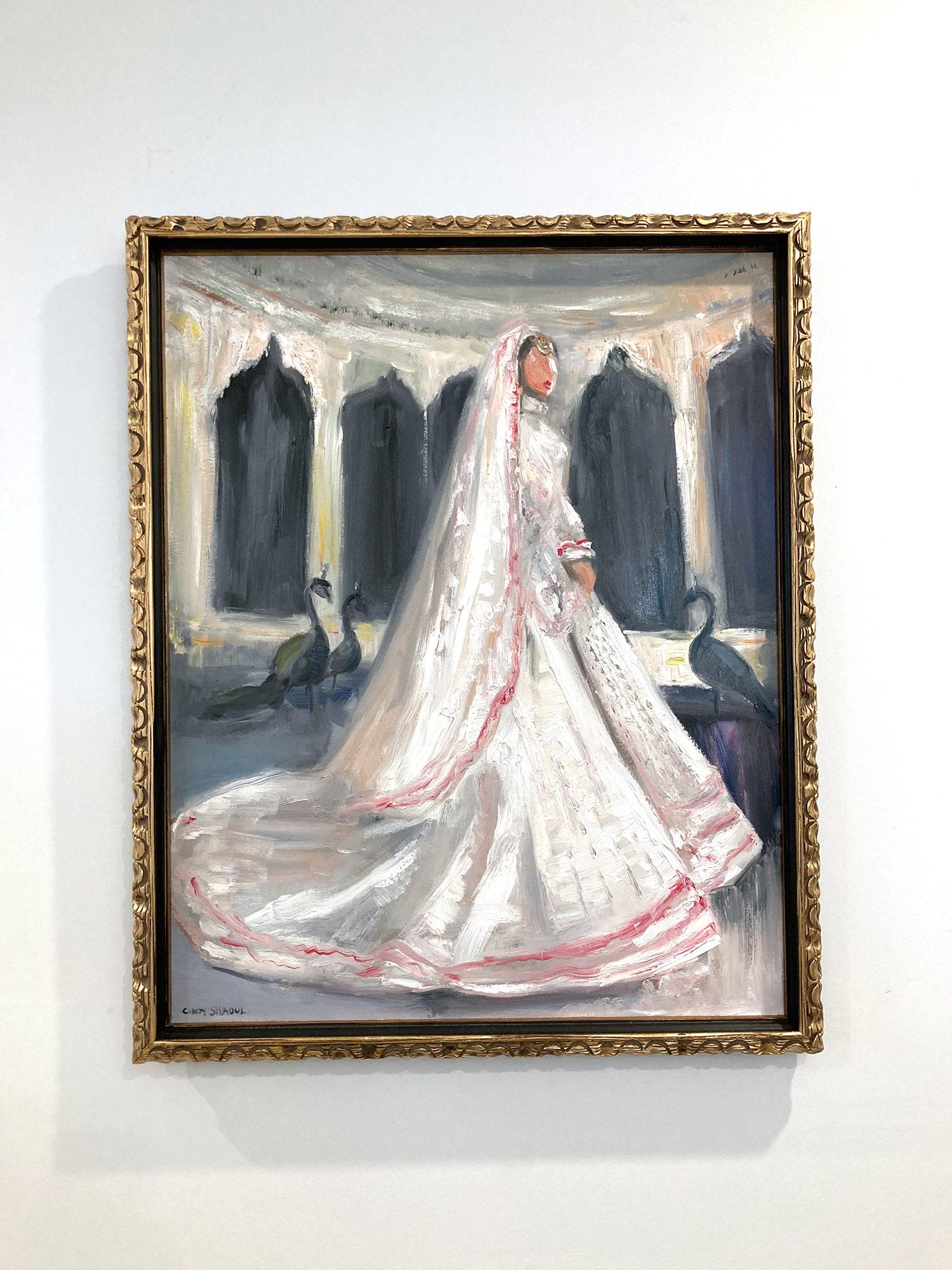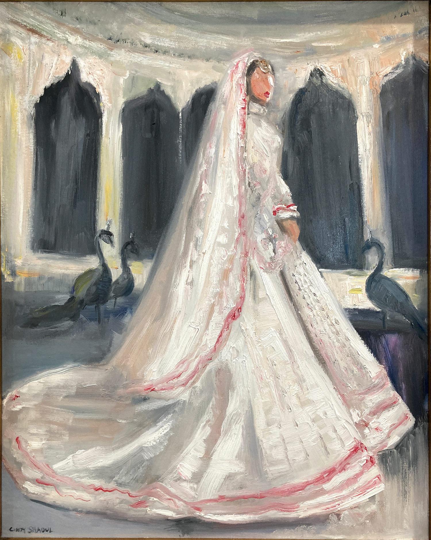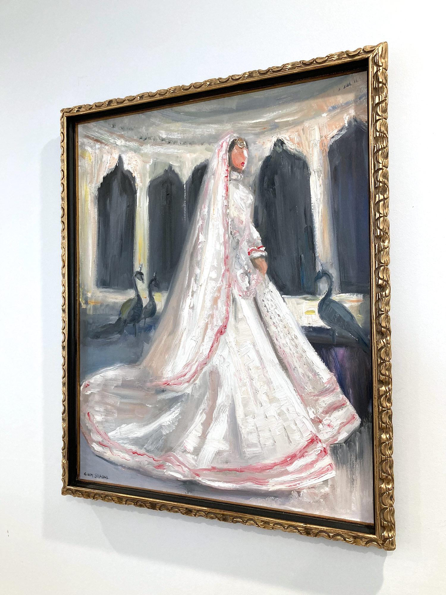 This piece depicts Rashida Merchant, at the Ambani Wedding. She is dressed in an elaborate white gown with pink accents, featuring a long, flowing train and a delicate veil. The bride stands in a graceful pose, set against a backdrop of arched windows with a soft, muted color palette of grays, creams, and hints of yellow. In the background, three peacocks with dark, iridescent feathers add a touch of elegance and contrast to the scene. The painting style is impressionistic, with visible brushstrokes and a focus on texture, particularly in the fabric of the gown. The piece is signed lower left corner and comes displayed in an original antique frame with hanging wire on verso ready to be displayed.