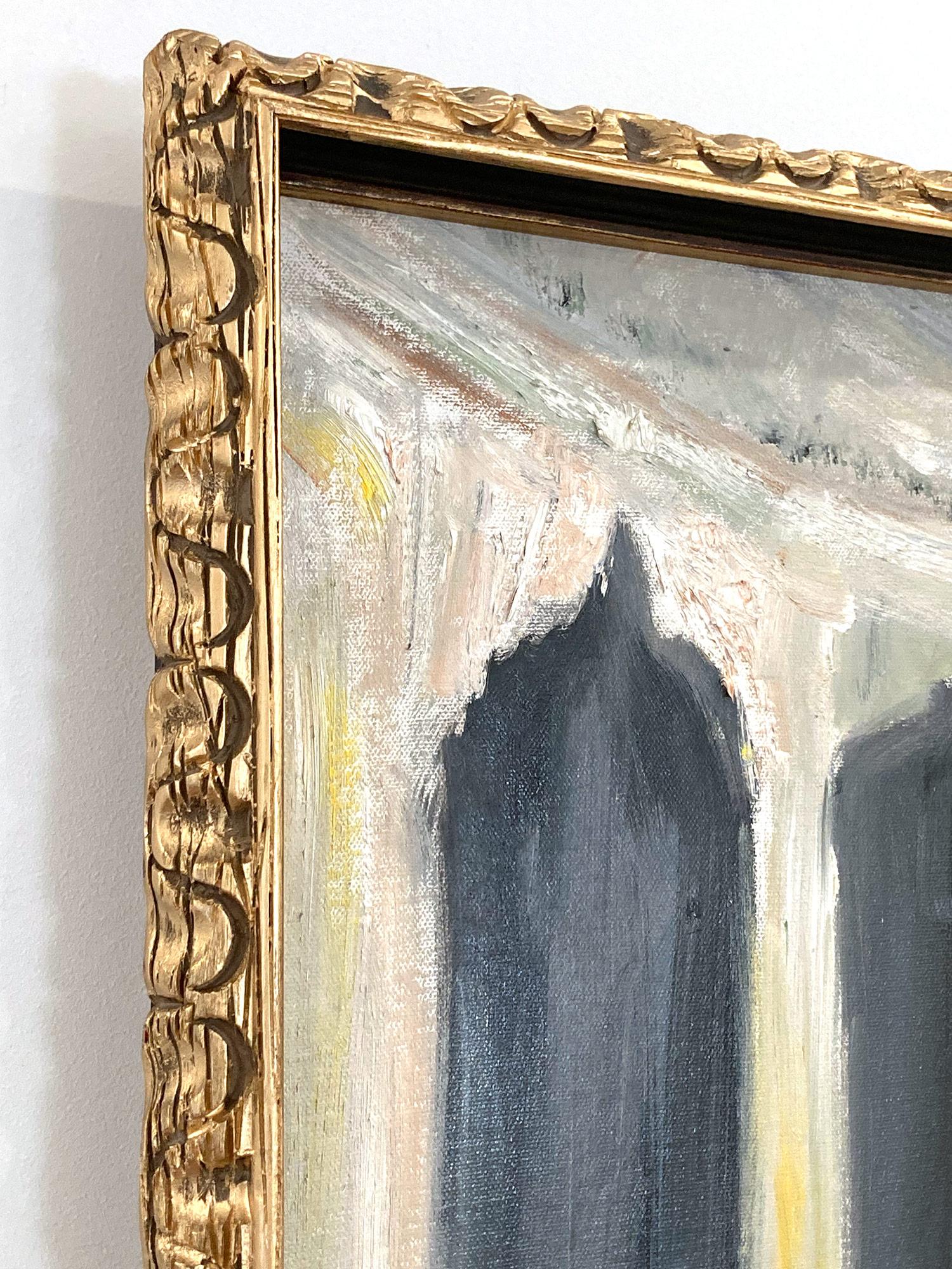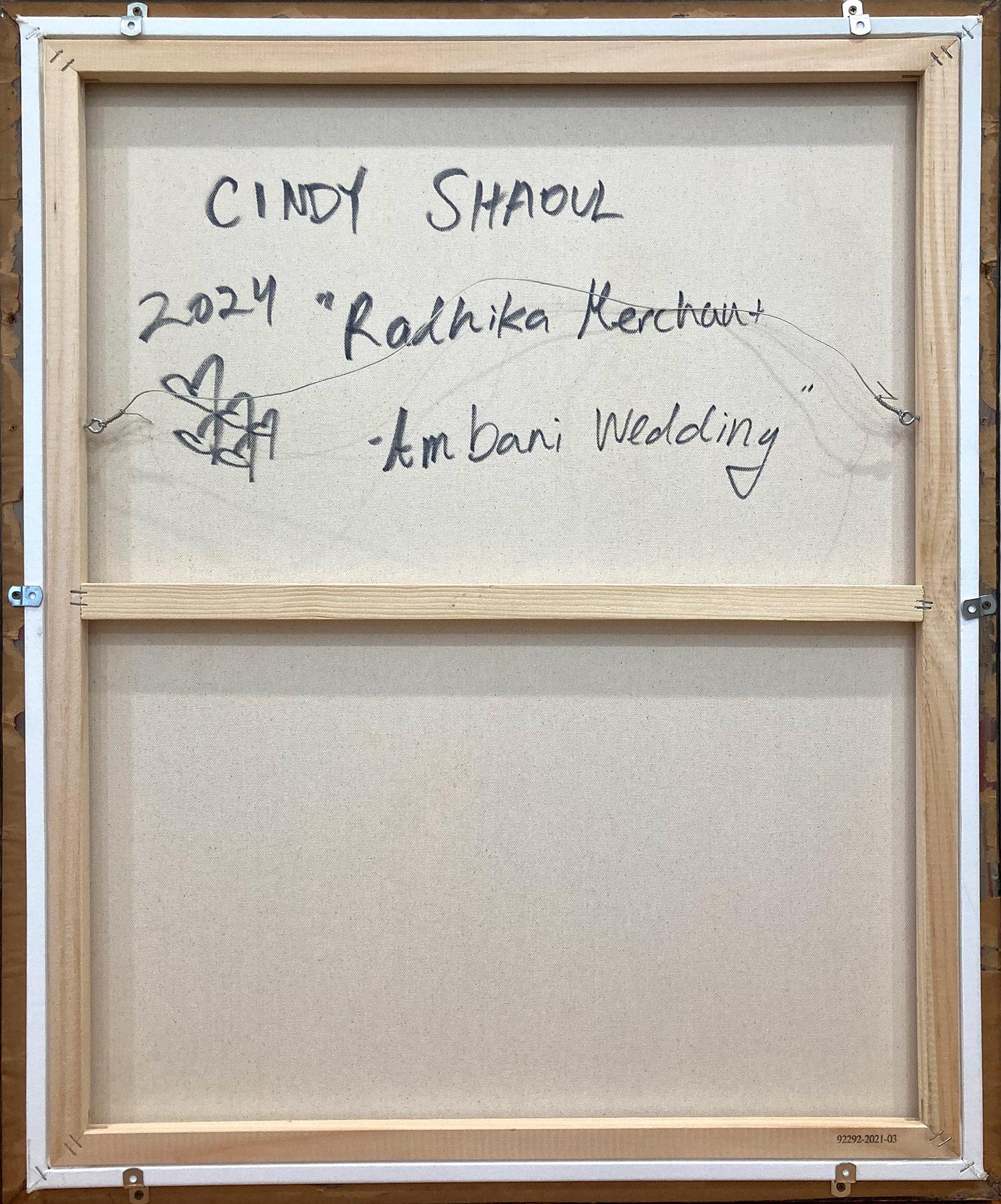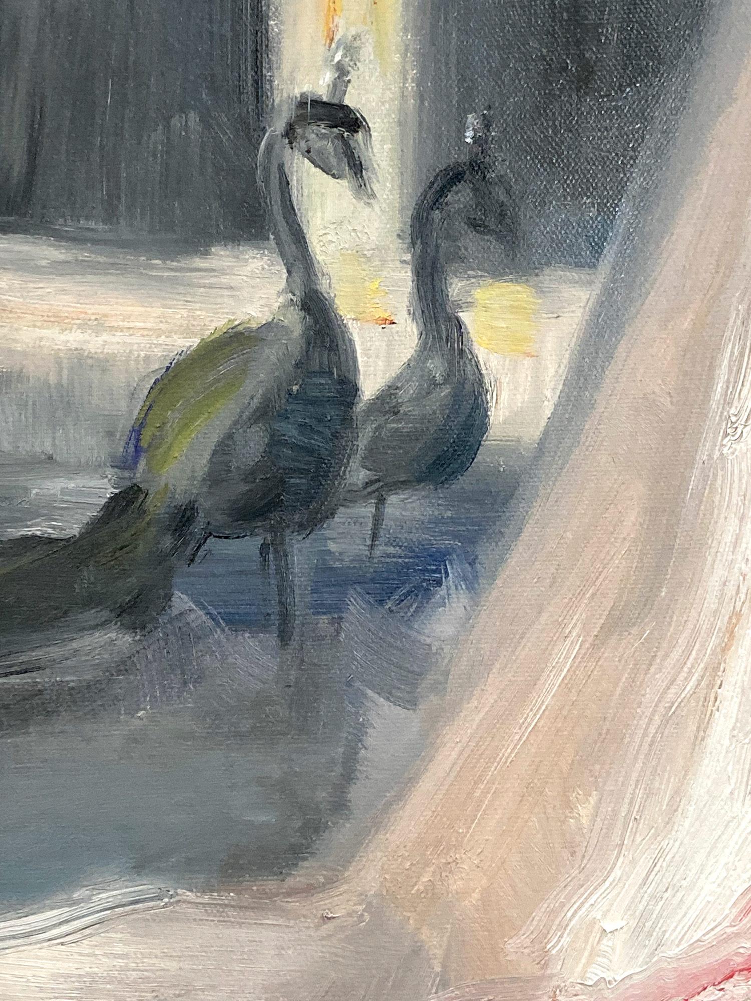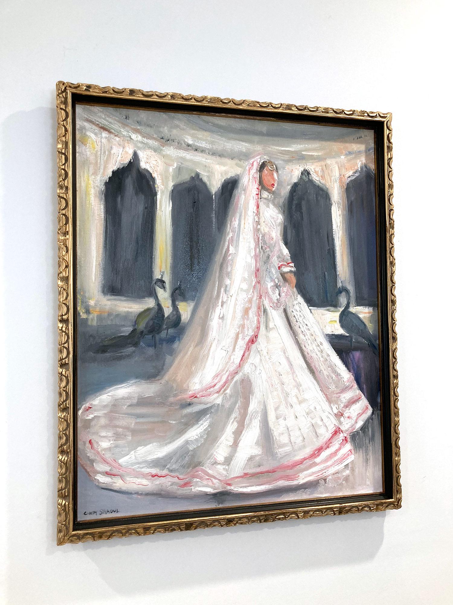 This piece depicts Rashida Merchant, at the Ambani Wedding. She is dressed in an elaborate white gown with pink accents, featuring a long, flowing train and a delicate veil. The bride stands in a graceful pose, set against a backdrop of arched windows with a soft, muted color palette of grays, creams, and hints of yellow. In the background, three peacocks with dark, iridescent feathers add a touch of elegance and contrast to the scene. The painting style is impressionistic, with visible brushstrokes and a focus on texture, particularly in the fabric of the gown. The piece is signed lower left corner and comes displayed in an original antique frame with hanging wire on verso ready to be displayed.