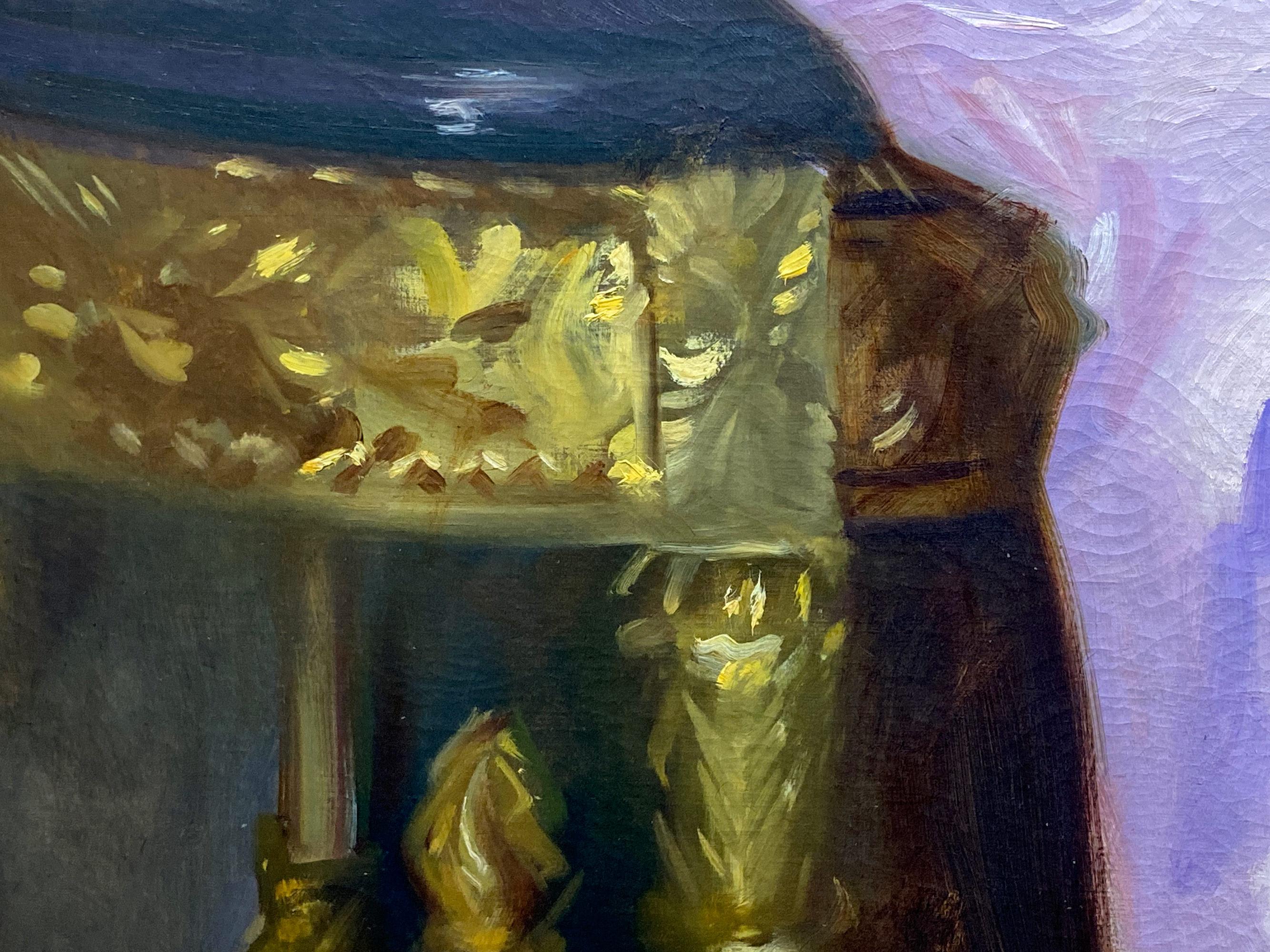 This painting depicts an interior scene of a woman seated at an apartment in Paris with a window that overlooks the city and an iconic church with the artist's reflection in the armo...