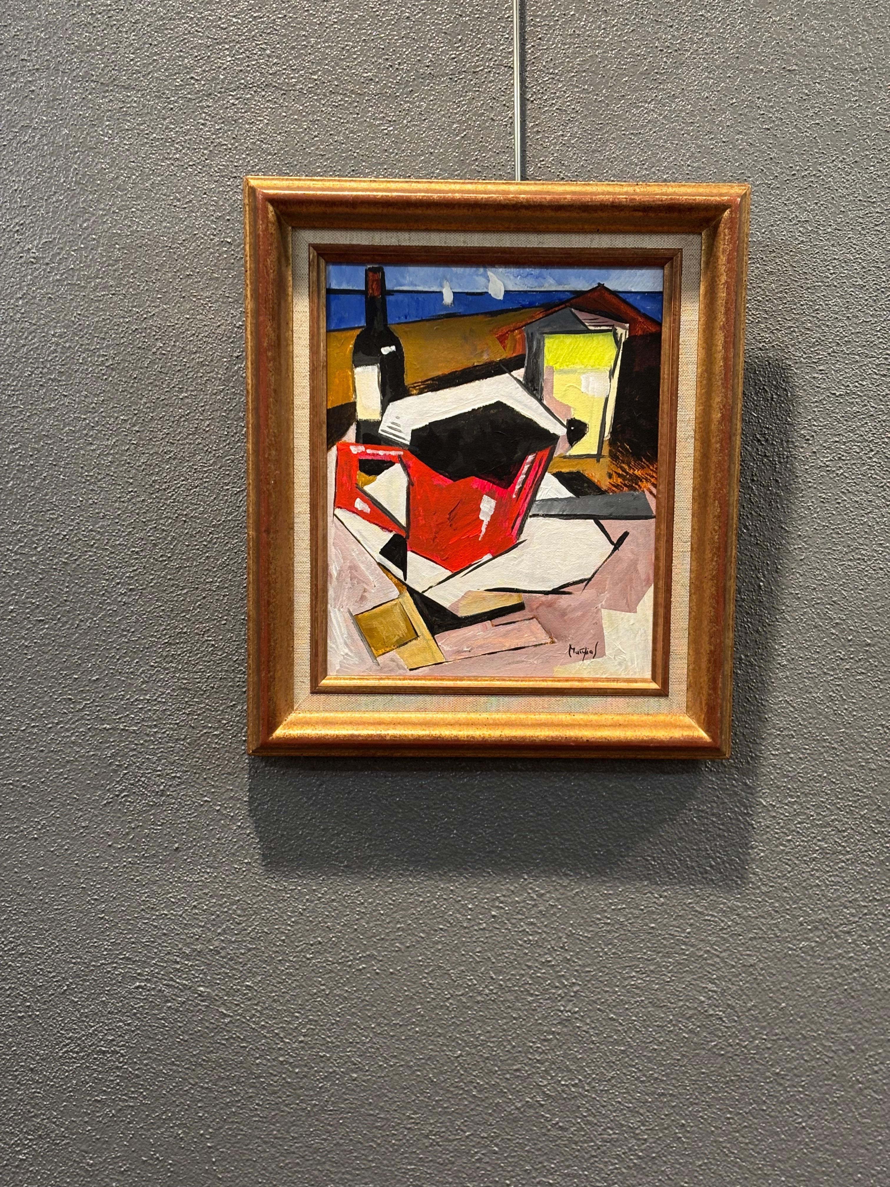 In Avant le déjeuner (“Before Lunch”), Grégoire Mathias creates a playful and vibrant still life where bottles of wine, a glass, and a red-checkered cloth are arranged against the backdrop of the sea. The bold shapes and saturated colors lend the work a festive, almost theatrical quality, echoing the traditions of Synthetic Cubism while infusing it with Mathias’s characteristic rhythm and modern eye.