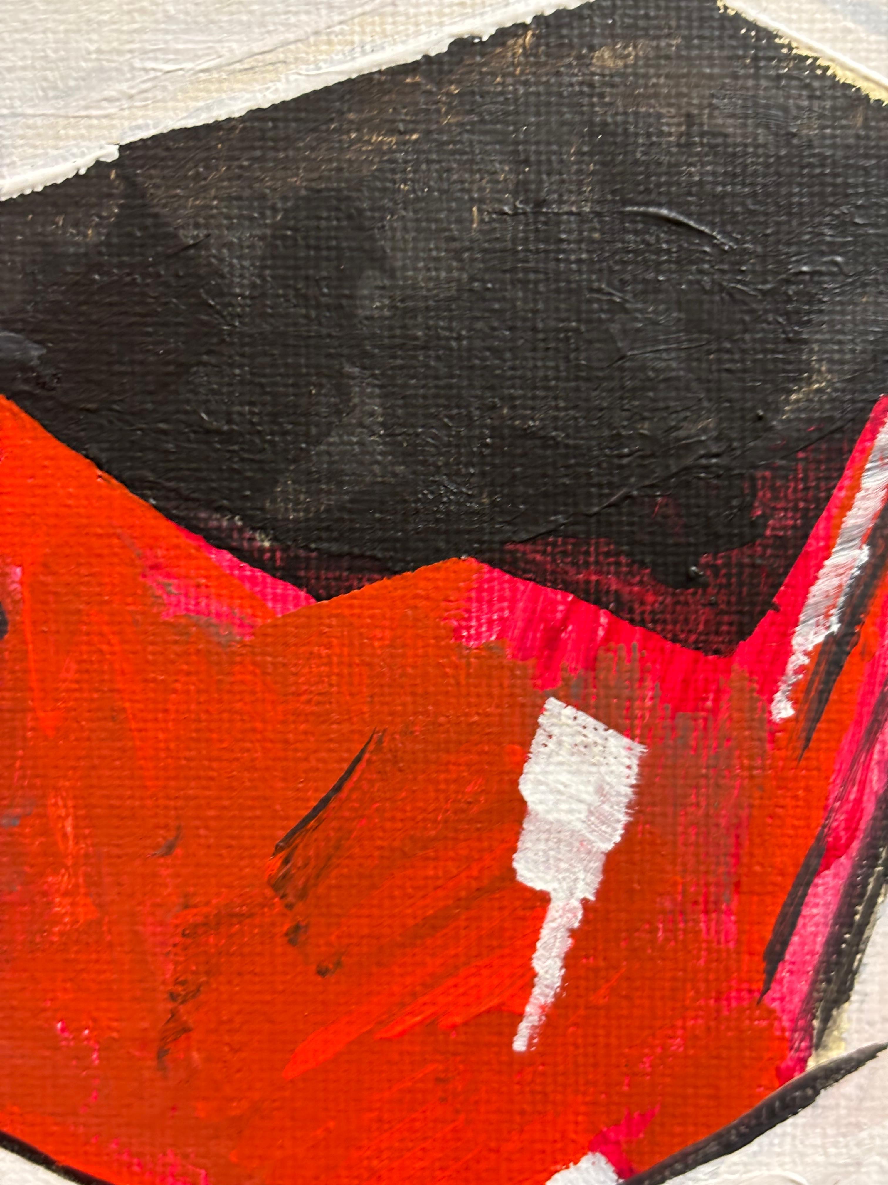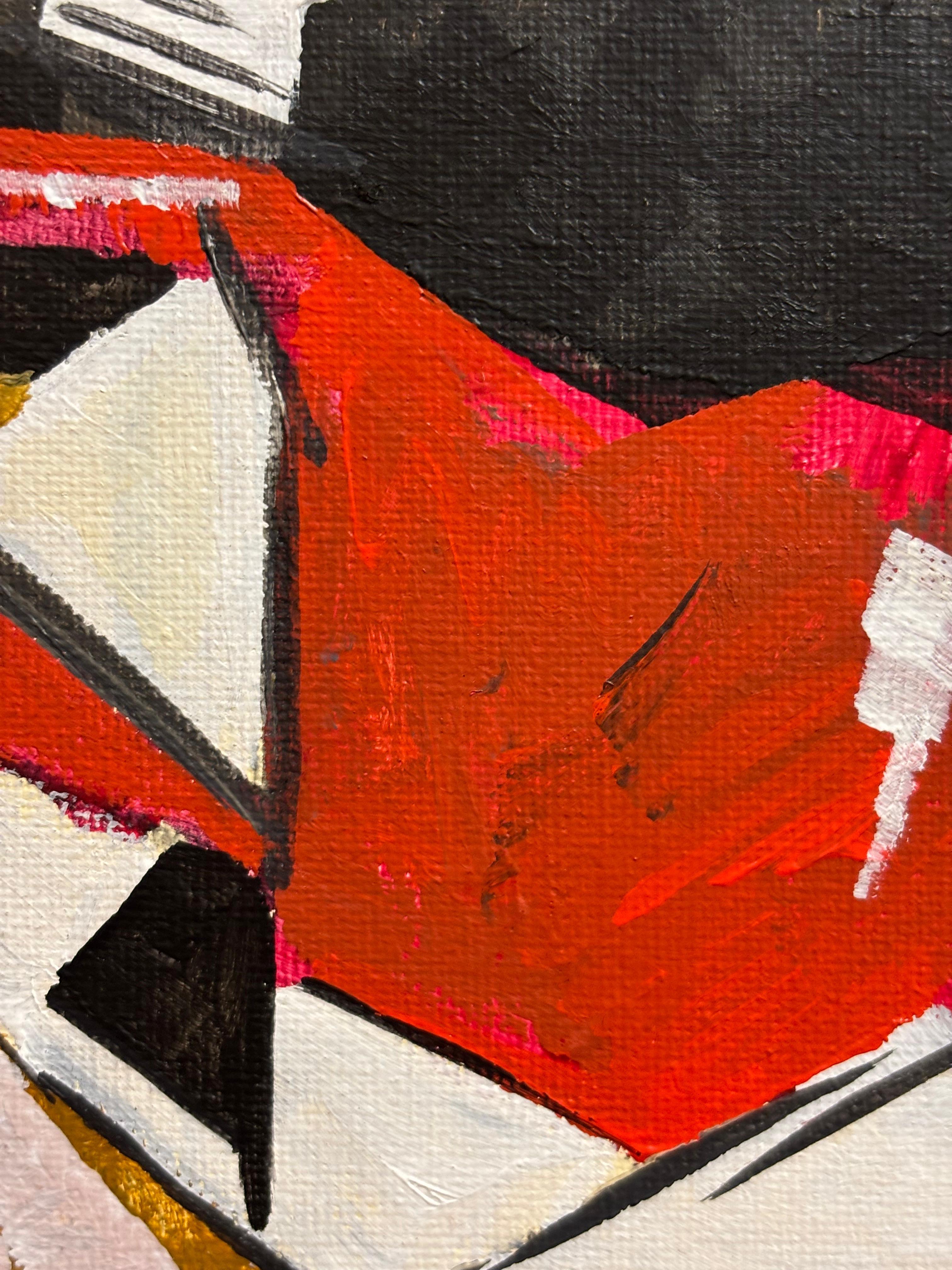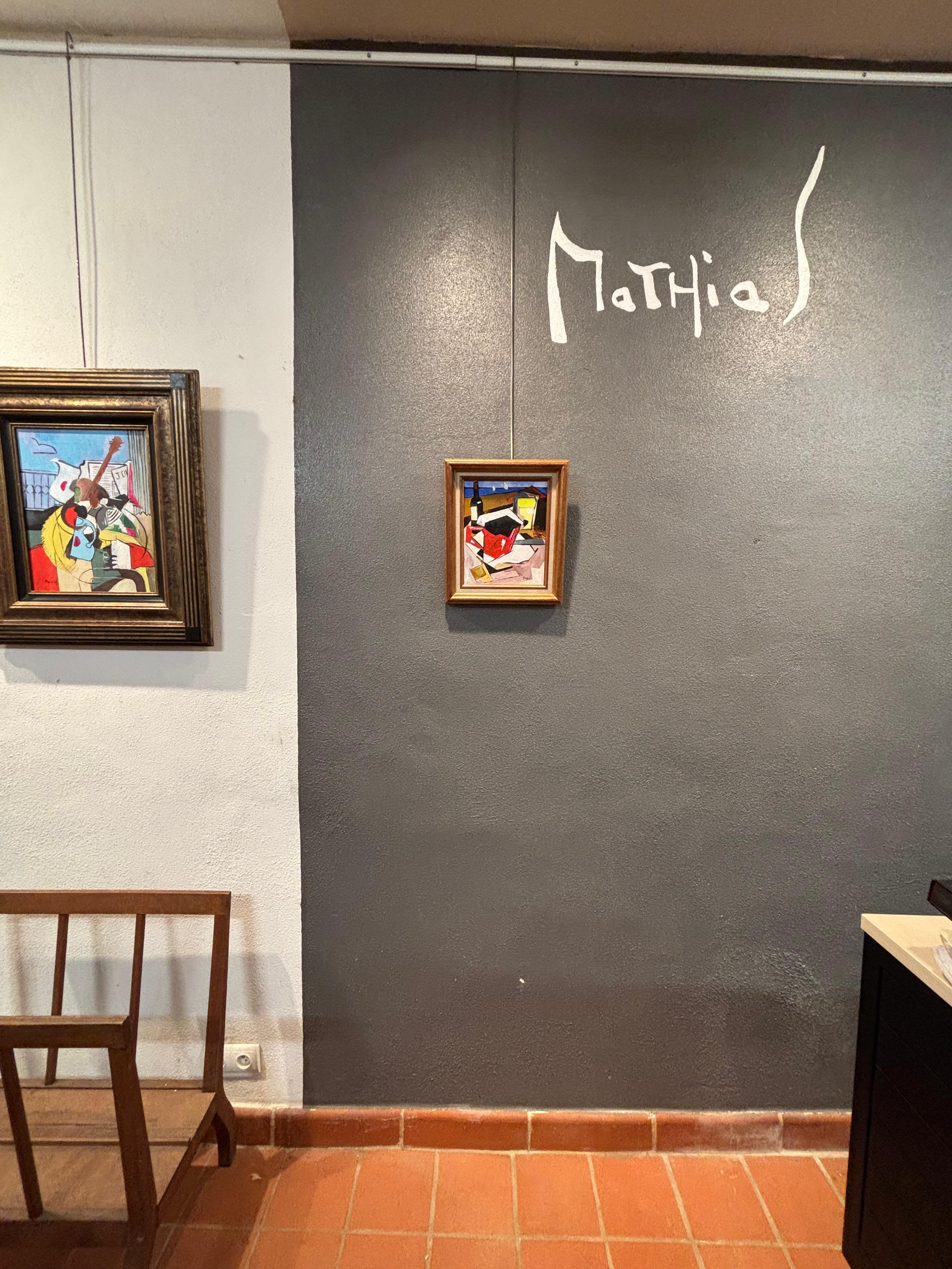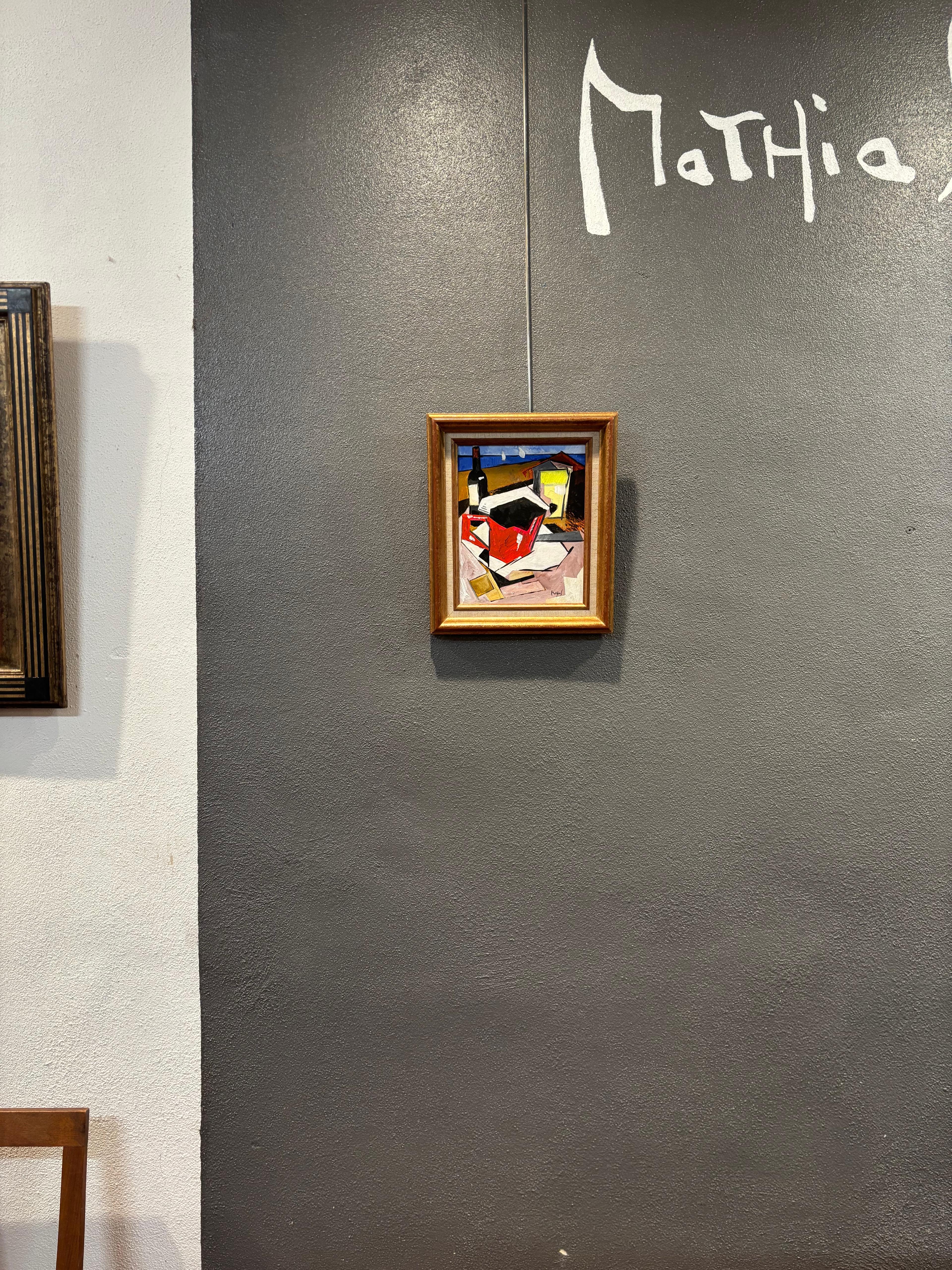 Balancing structure and spontaneity, Mathias uses intersecting planes and bold contrasts of red, yellow, and blue to convey both the solidity of form and the fleeting atmosphere of the moment. The result is a contemporary still life that feels both architectural and alive, an homage to the French tradition of café culture, reinterpreted through a modern Cubist lens.