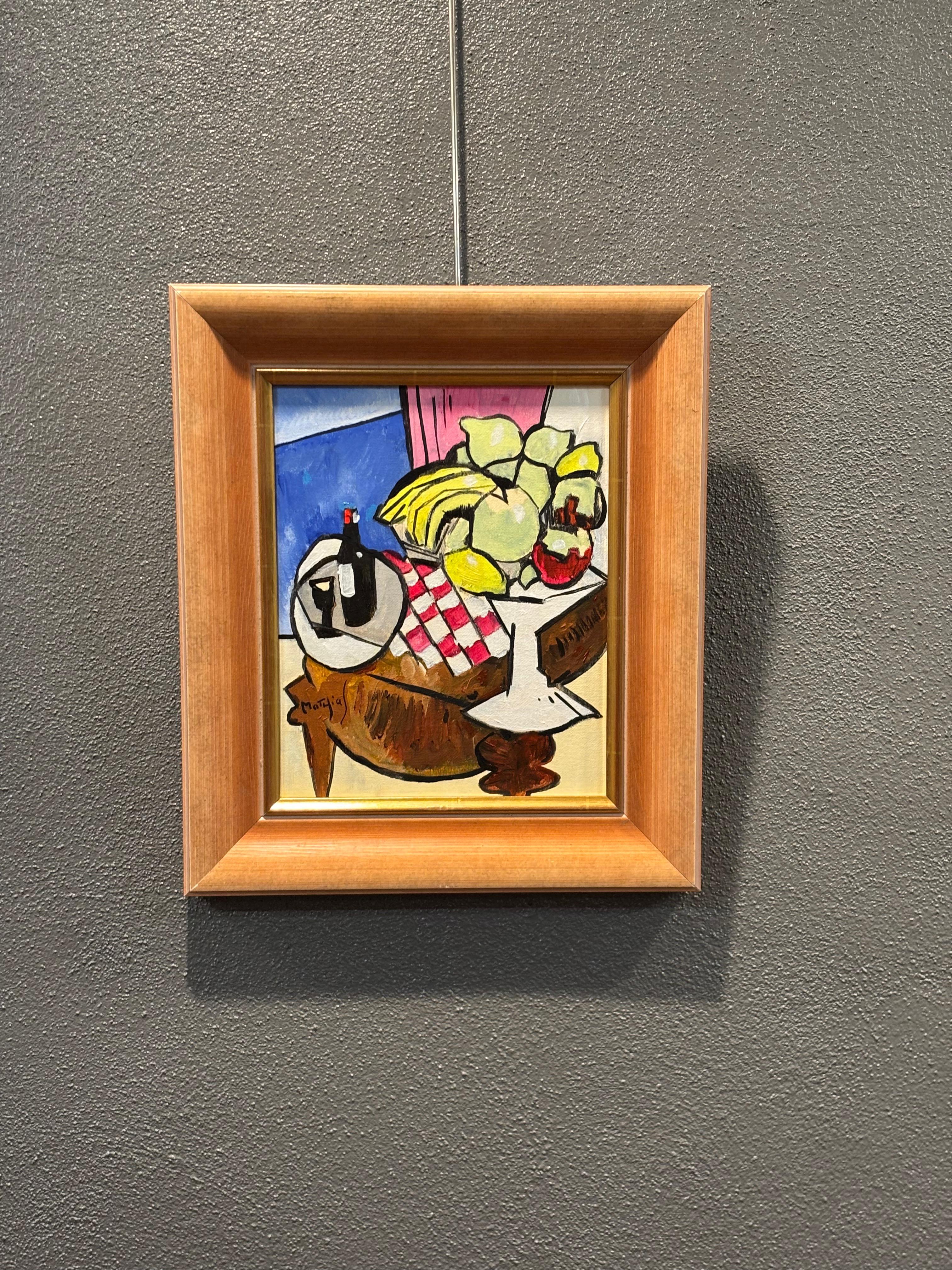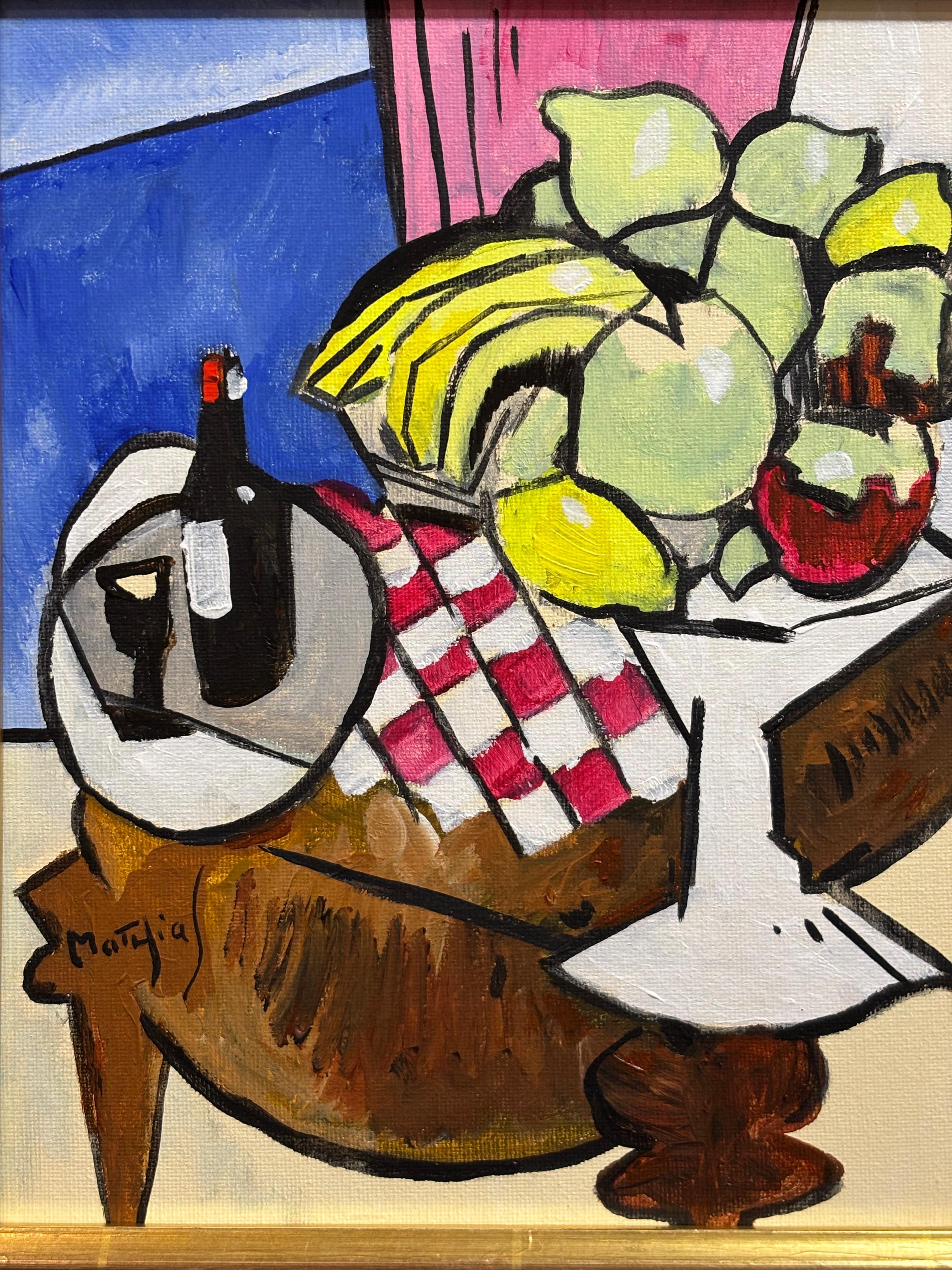 French Cubist Still Life Signed Painting Fruit & Wine on Table, 20th century
