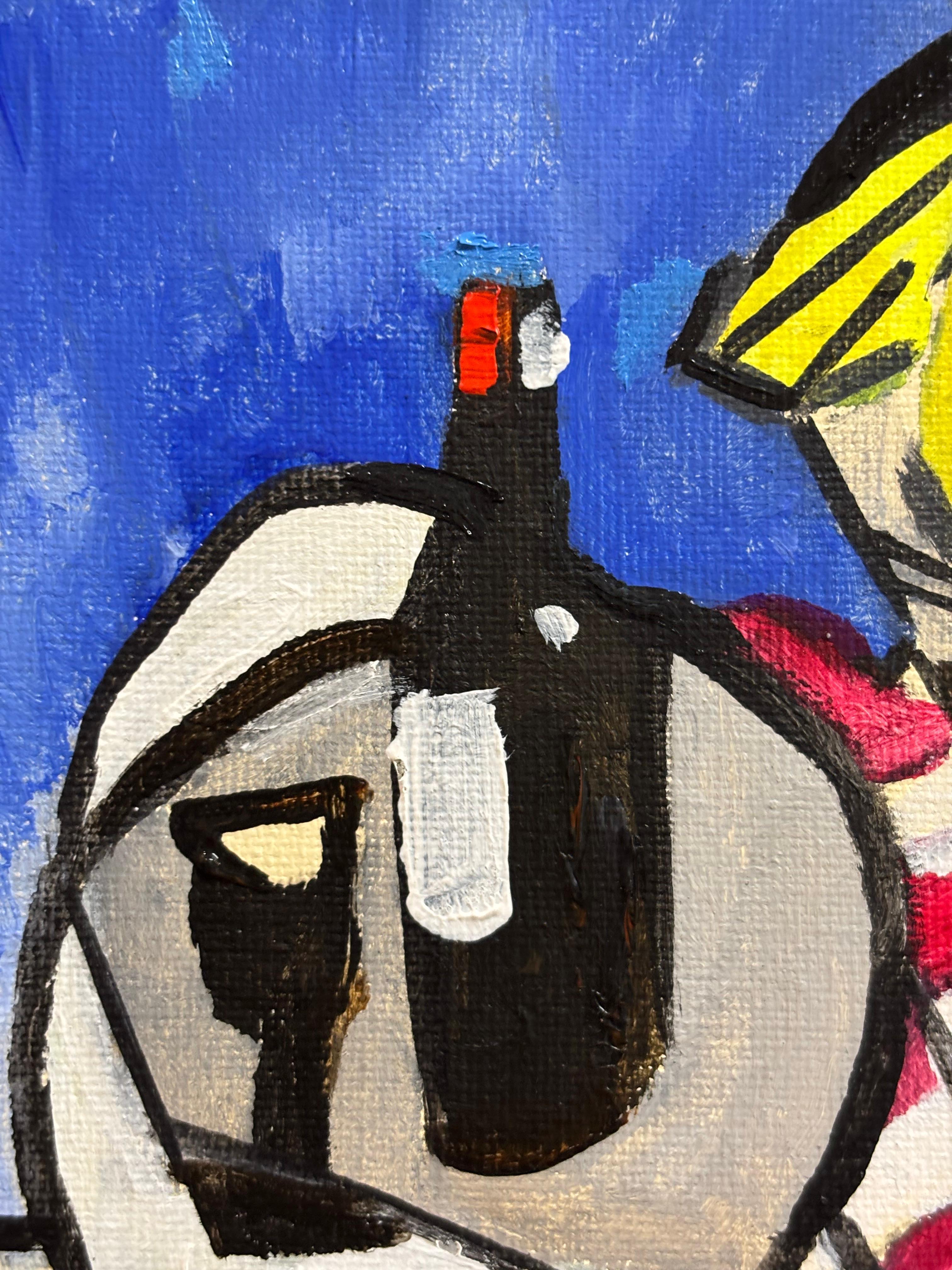 In Avant le déjeuner (“Before Lunch”), Grégoire Mathias creates a playful and vibrant still life where bottles of wine, a glass, and a red-checkered cloth are arranged against the backdrop of the sea. The bold shapes and saturated colors lend the work a festive, almost theatrical quality, echoing the traditions of Synthetic Cubism while infusing it with Mathias’s characteristic rhythm and modern eye.