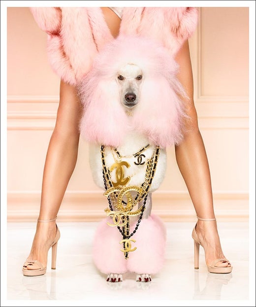 Archival pigment print featuring sexy woman's legs with pretty dog and chanel symbols. Pink themed. Fun and playful. Others sizes available. Framing options available as well.