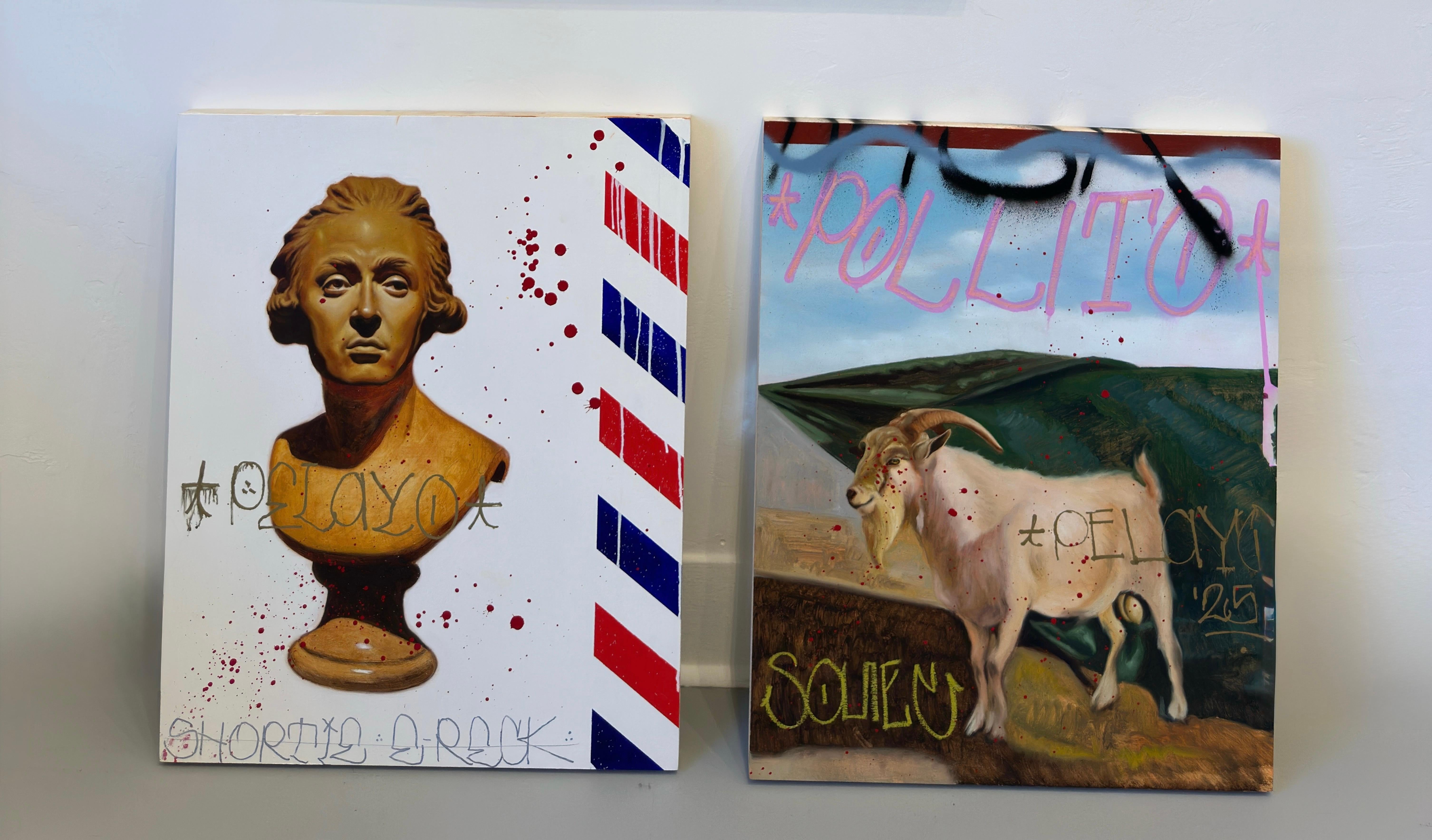 Pelayo is often described as the coming of A New Renaissance. The juxtaposition between his meticulously rendered brushwork of classical style imagery and loose expressionistic careless drips with the use of oil paints, spray paint, and oil sticks create a dramatic atmosphere that is nothing less than a sexy intoxicating marriage of two worlds that don’t inherently belong. The motifs we see in his paintings feature a third eye accompanied by a smiley face which was also adopted by Westside Gunn on several projects during the 2020 Covid-19 pandemic which led to Isaac’s recent growing success.