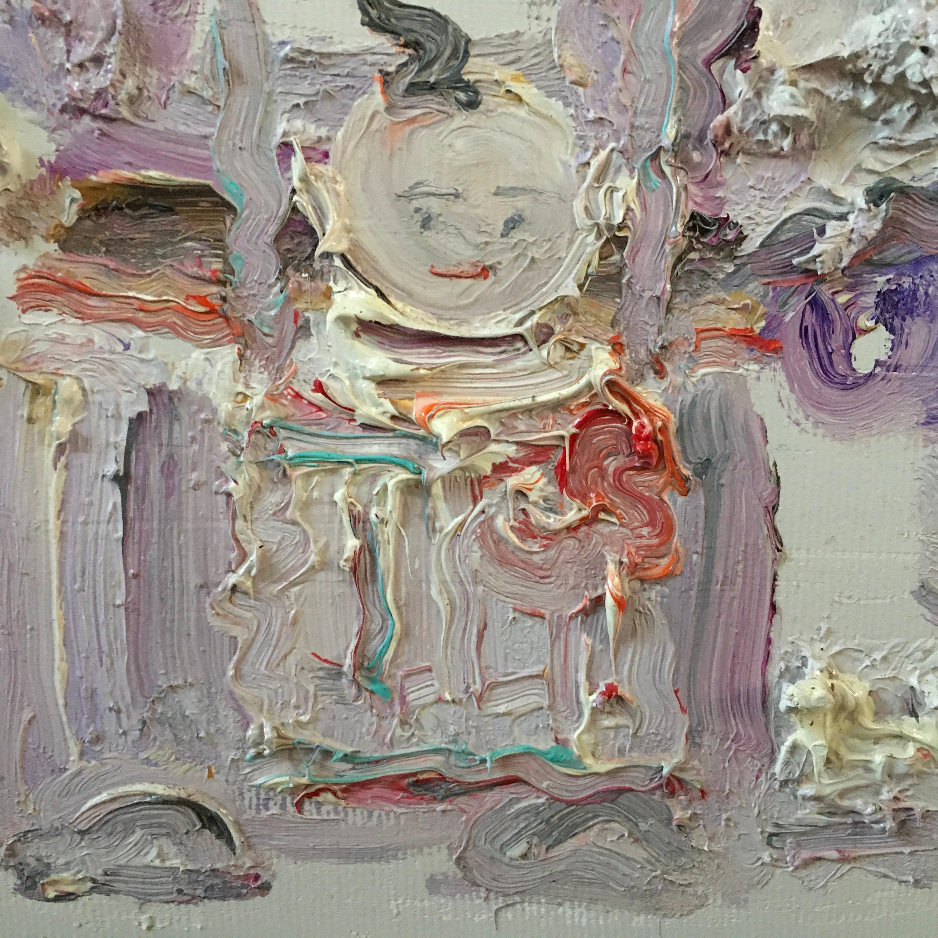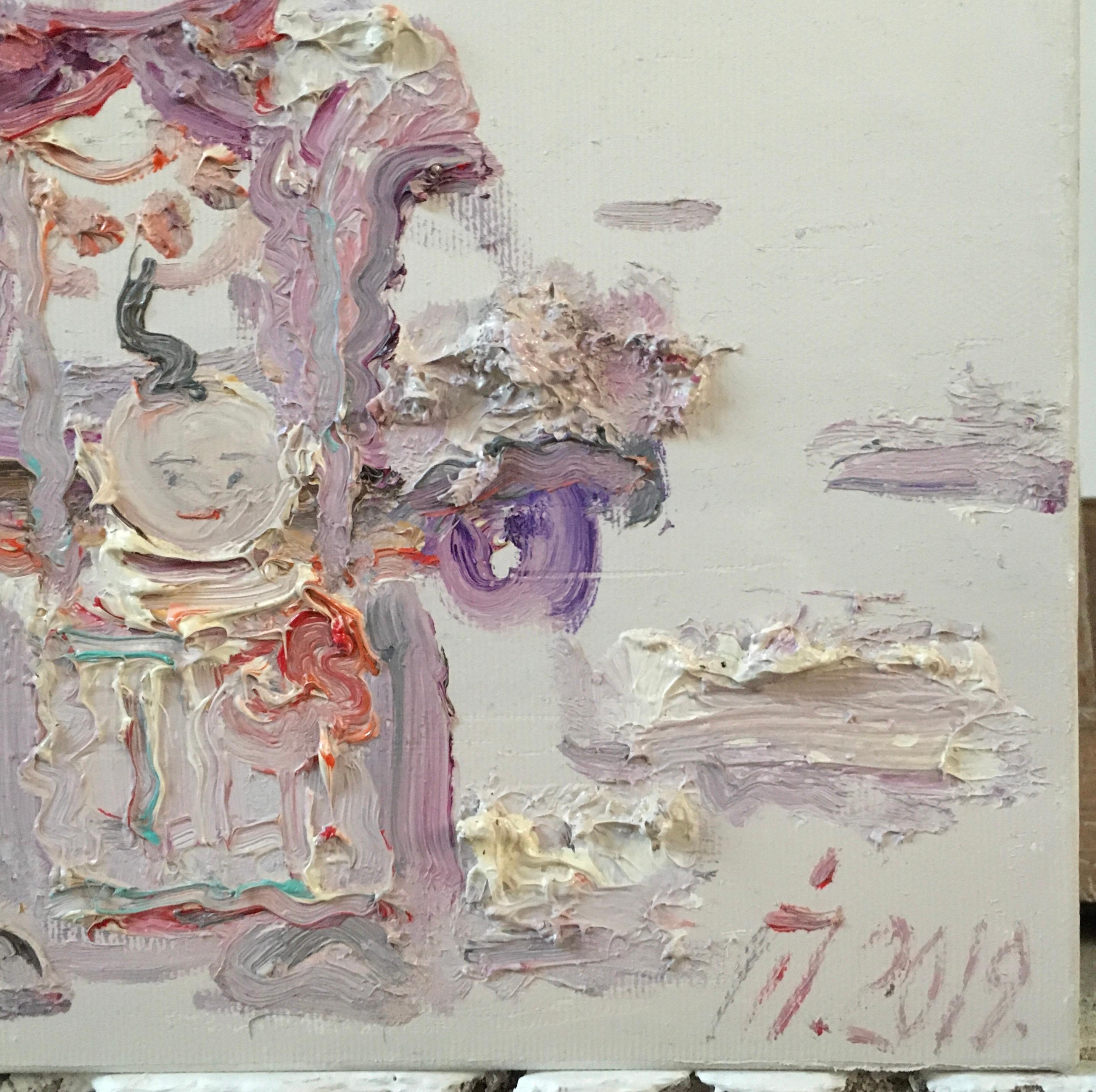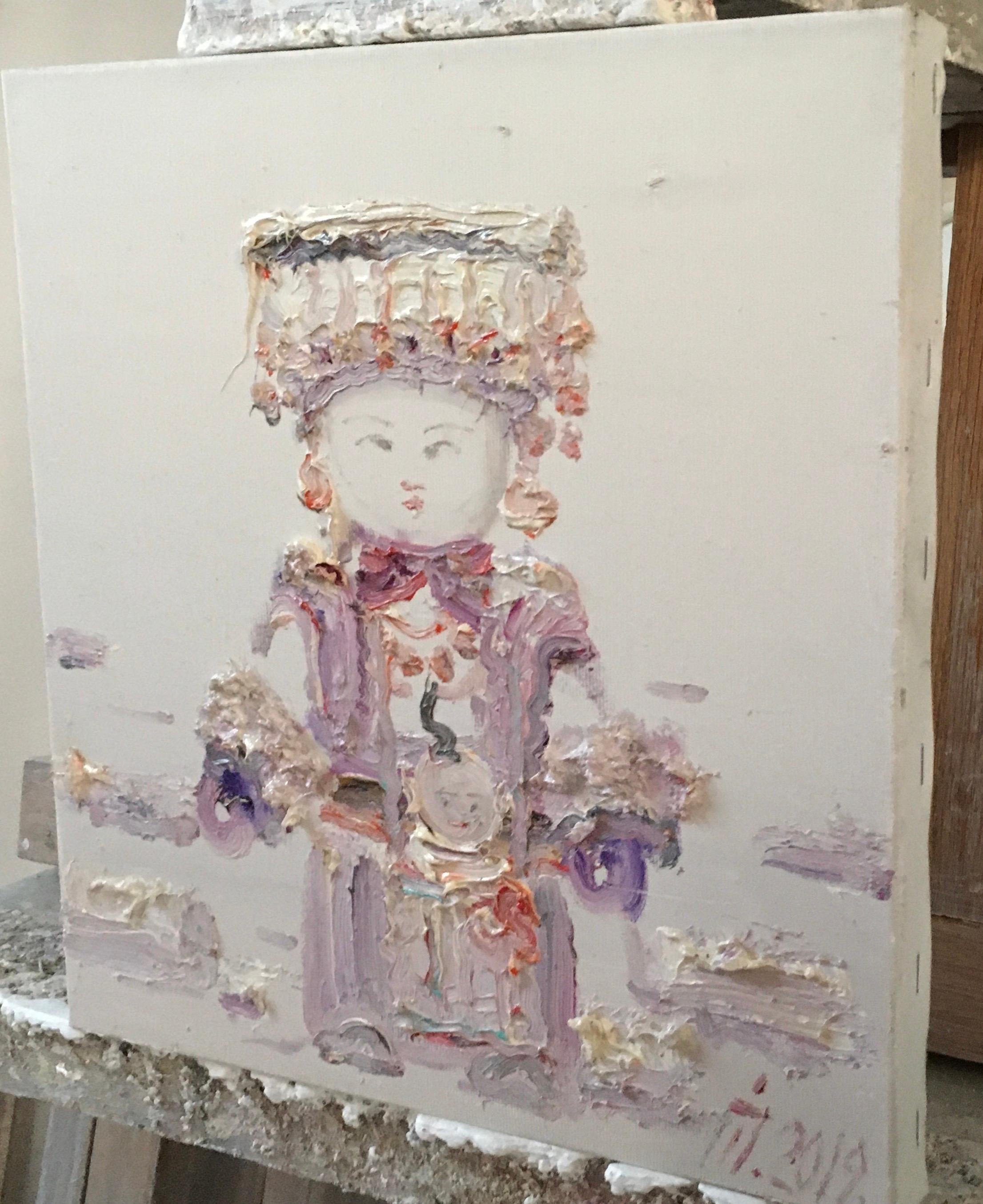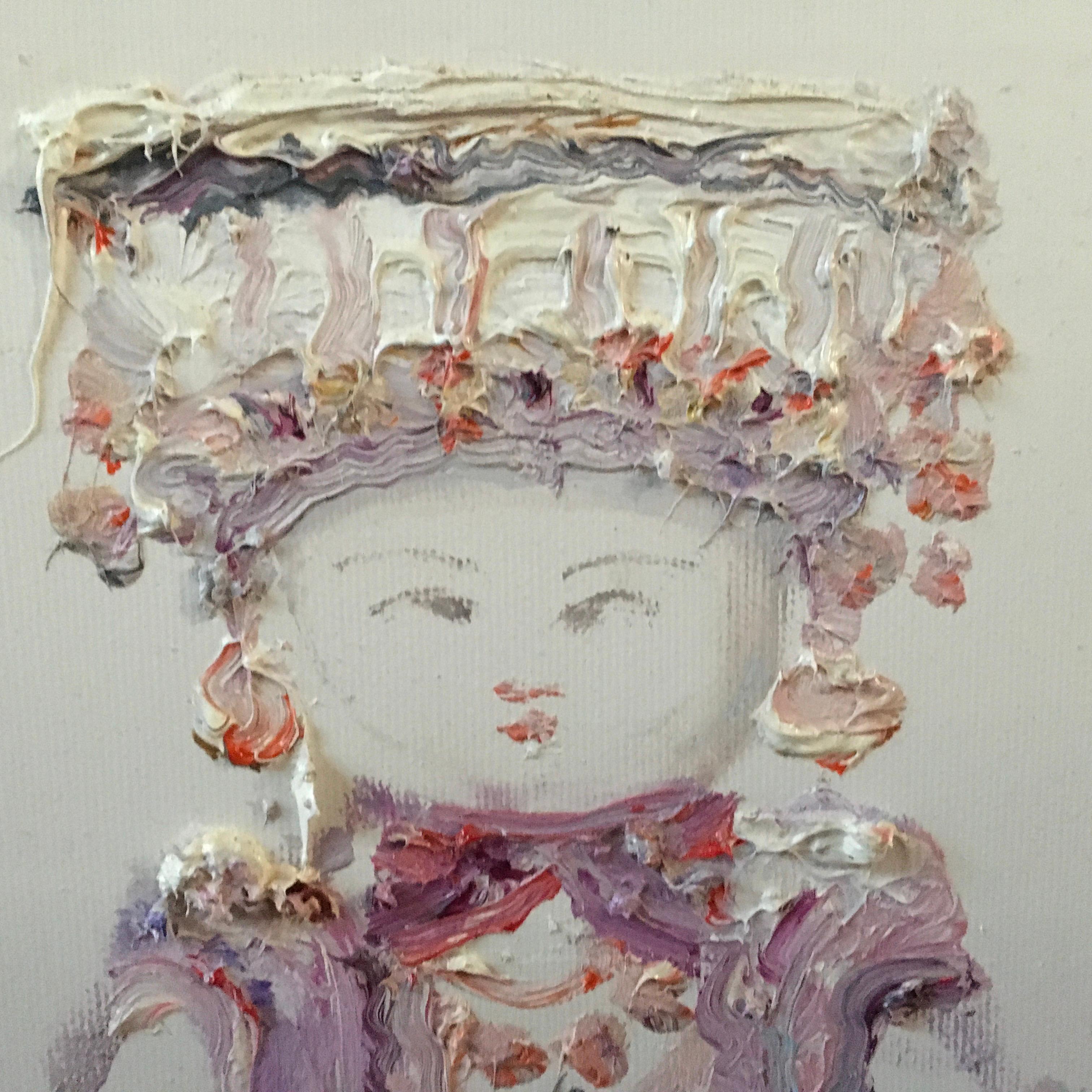 This image resembles a painting executed with thick, textured strokes of oil paint. Against a light, almost white background, there is a stylized figure of a doll in traditional dress. The image is painted in delicate pastel tones, predominantly pink, lavender, cream, and slightly beige shades.