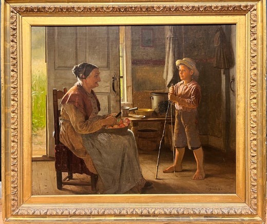 John George Brown was born in 1831 near Durham, England. At fourteen he began a seven-year apprenticeship as a glass-cutter in Newcastle-on-Tyne, studying at night with William Bell Scott at the School of Design. From 1852 to 18253 he worked at the Holyrood Glass Works, Edinburgh, studying evenings at the Trustees Academy with Robert Scott Lauder. In 1853 Brown spent the summer in London where he painted a few portraits before emigrating to the United States that fall. He settled in Brooklyn finding work at the Brooklyn Flint Glass Company. During this time he attended the free classes offered at the Graham Art School and later studied under Thomas Seir Cummings at the National Academy of Design. In 1855, Brown opened a studio as a portrait painter. Brown received the support of the art dealer, Samuel S. P. Avery, and John H. Sherwood, collector and builder of the Sherwood Studio Building in 1880, who encouraged his turning from portraits to children as subjects. In 1859 Brown was one of the founding members of the Brooklyn Art Society and in 1861 a founding member of the Brooklyn Art Association. He moved to New York in 1861 finding quarters in the Tenth Street Studio Building where he maintained a studio for the rest of his life. Brown began in 1858 to exhibit at the National Academy, a practice he continued every year, except 1871, until his death. He was elected an associate of the Academy in 1861, full member in 1863, and served as its vice-president from 1899-1904. After turning to genre scenes of the street children of New York City in the 1860s, he soon became famous and wealthy. Brown copyrighted many of his paintings that were often reproduced commercially as chromolithographs or photographic reproductions. In 1867 he was elected one of the original members of the American Watercolor Society and was its president from 1887-1904. Brown and the art dealer, John Snedecor, travelled to Europe in 1870, visiting both London and Paris. During the summer months, he often explored the rural areas of New York and Vermont, as well as Grand Manan Island in the Bay of Fundy.