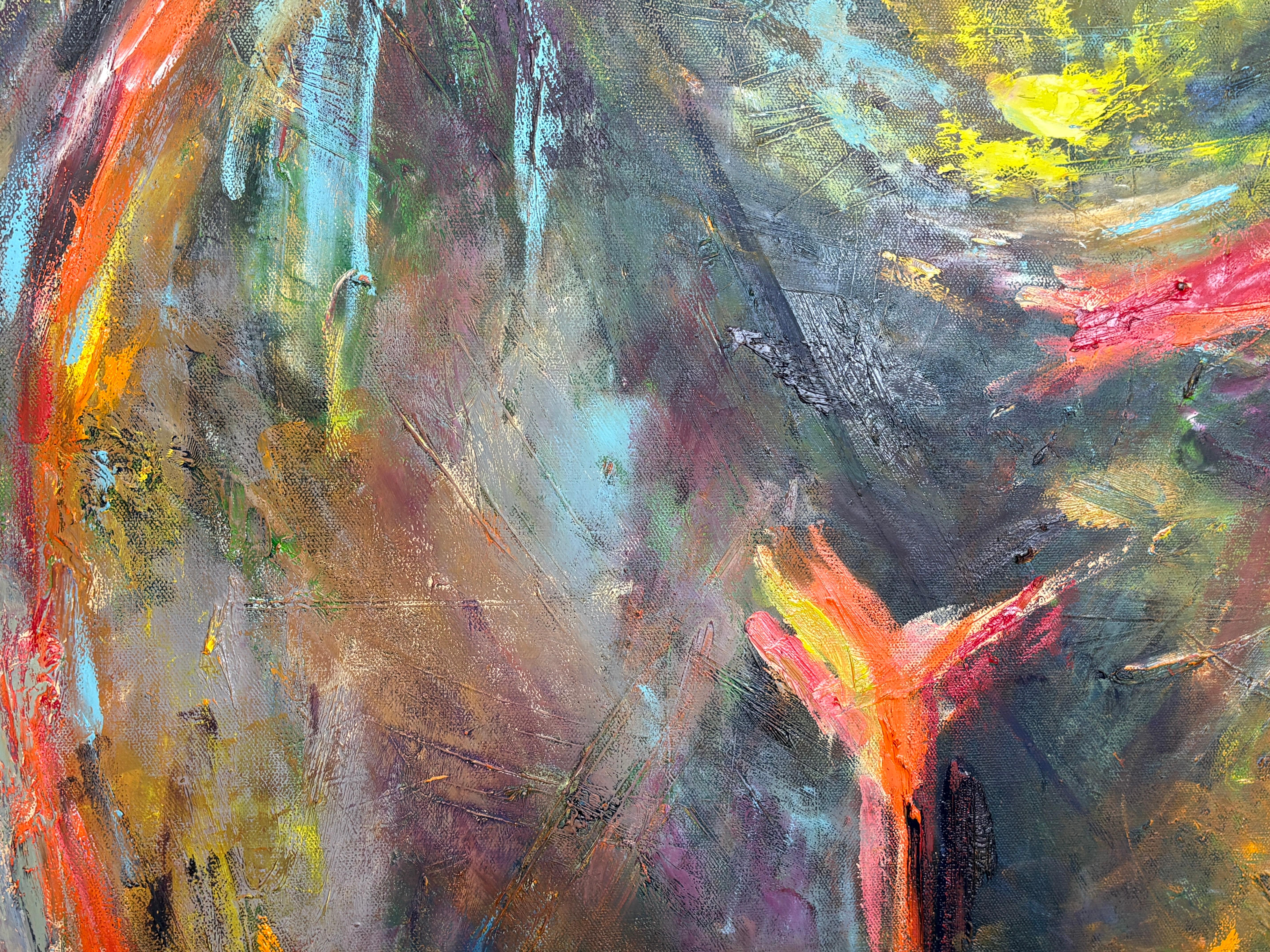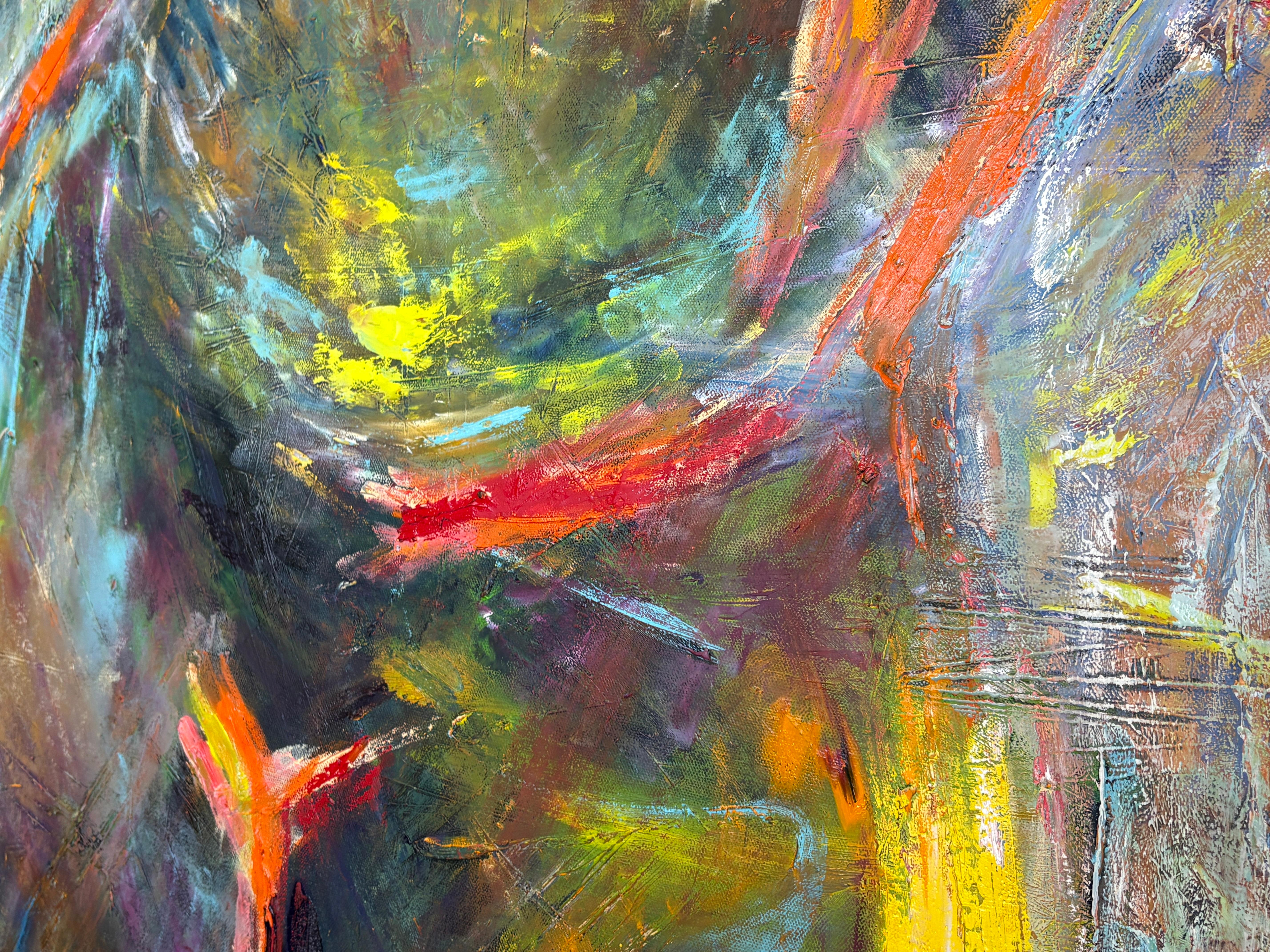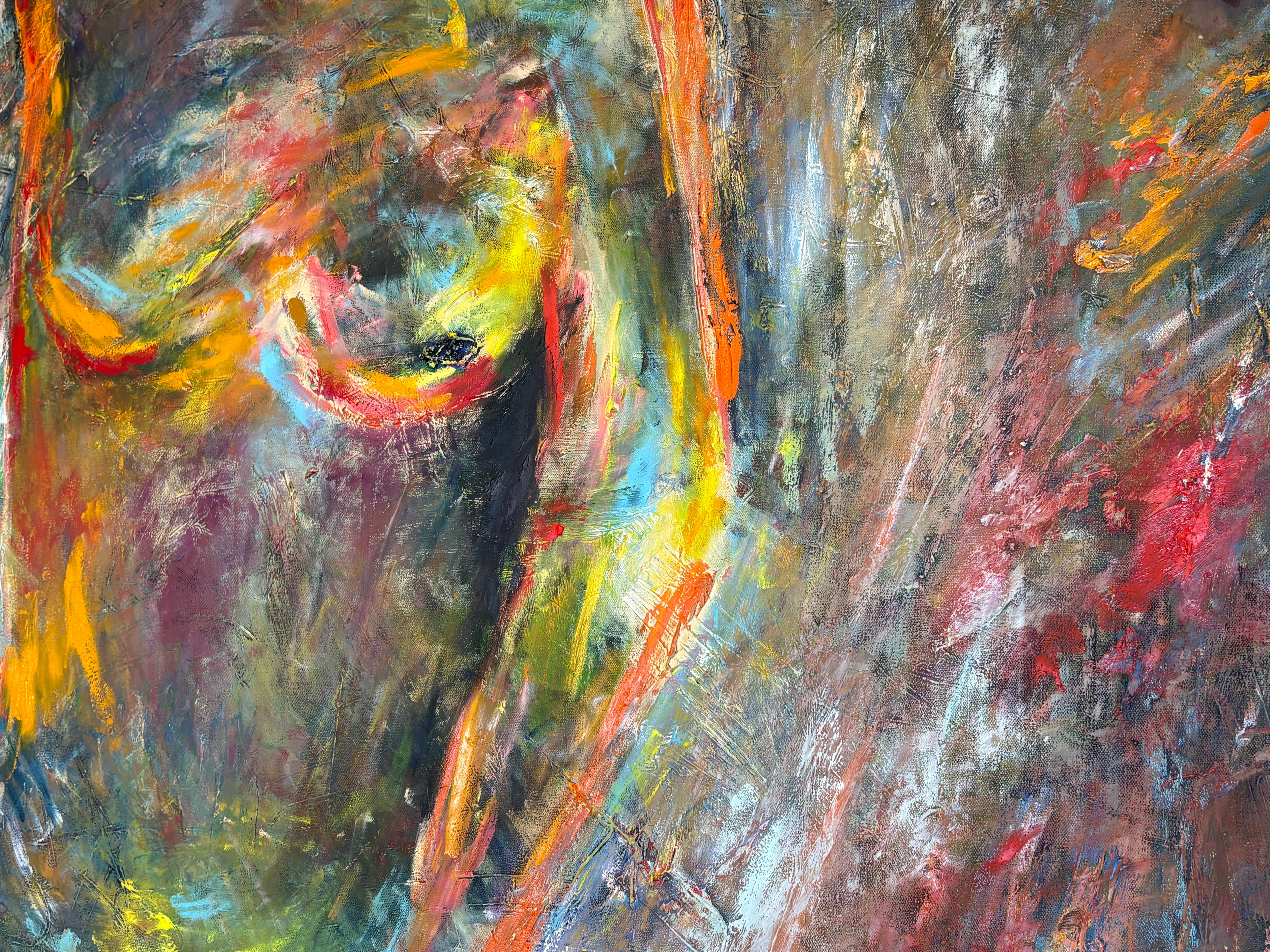 In this evocative piece, "Untitled" embodies Kristy Chettle’s dynamic approach to the human form. Bold strokes of color: crimson, yellow, turquoise, and violet, merge and collide across the surface, evoking motion, energy, and emotion. Chettle’s expressive technique blurs the line between abstraction and figuration. The figure emerges from layers of texture and light, suggesting both presence and transformation. Vivid contour lines pulse with vitality, while the background dissolves into a storm of chromatic movement.