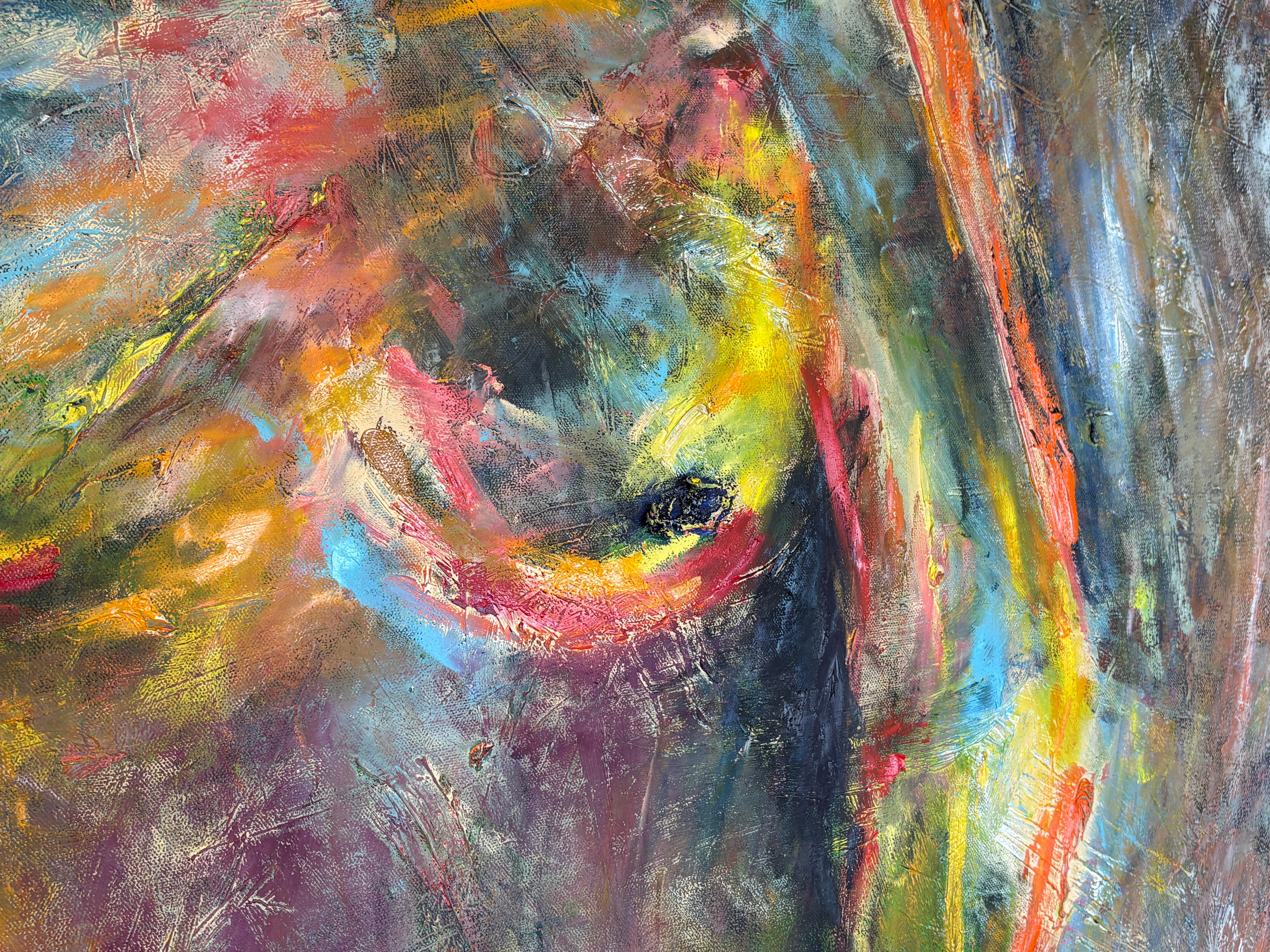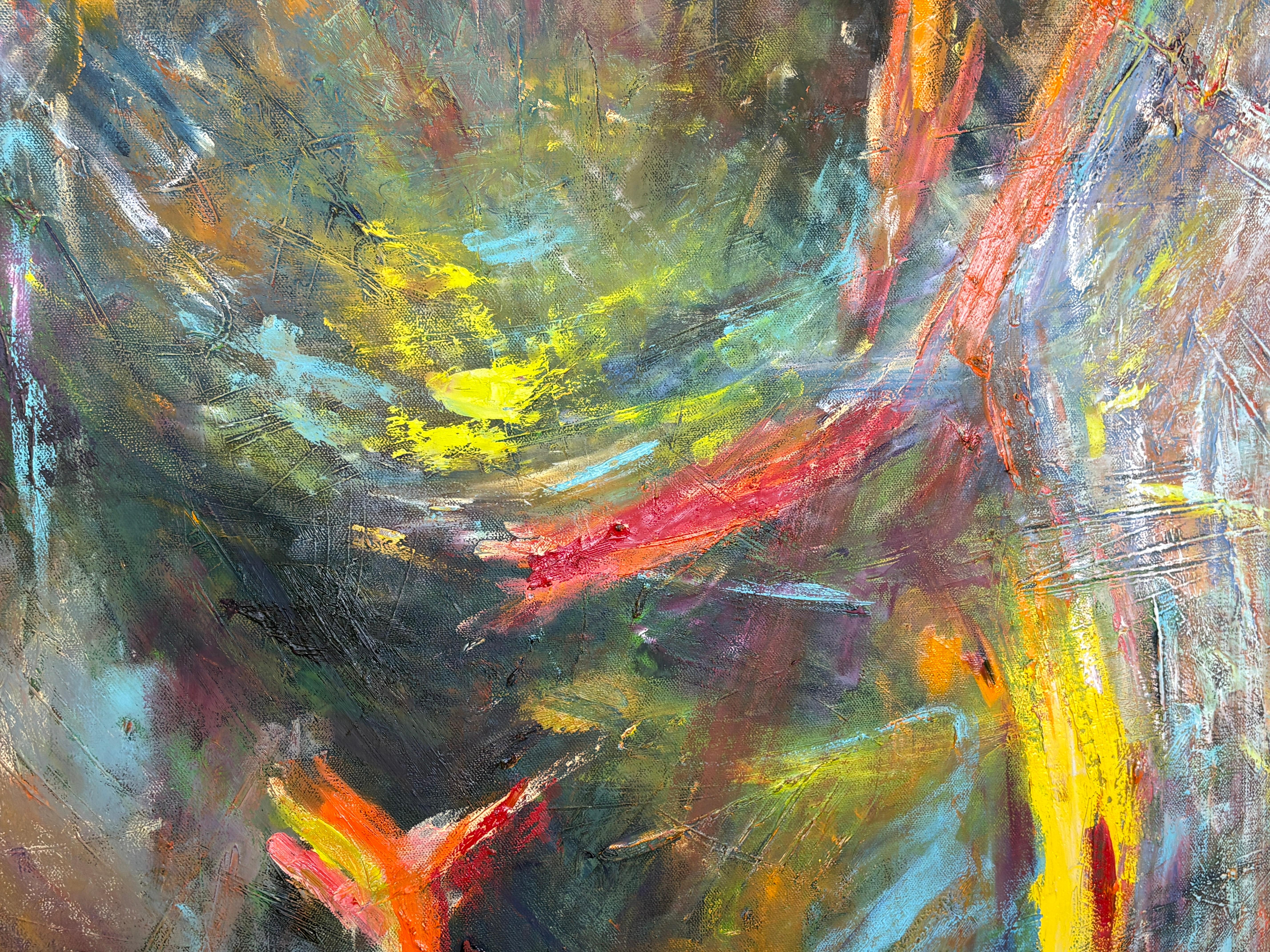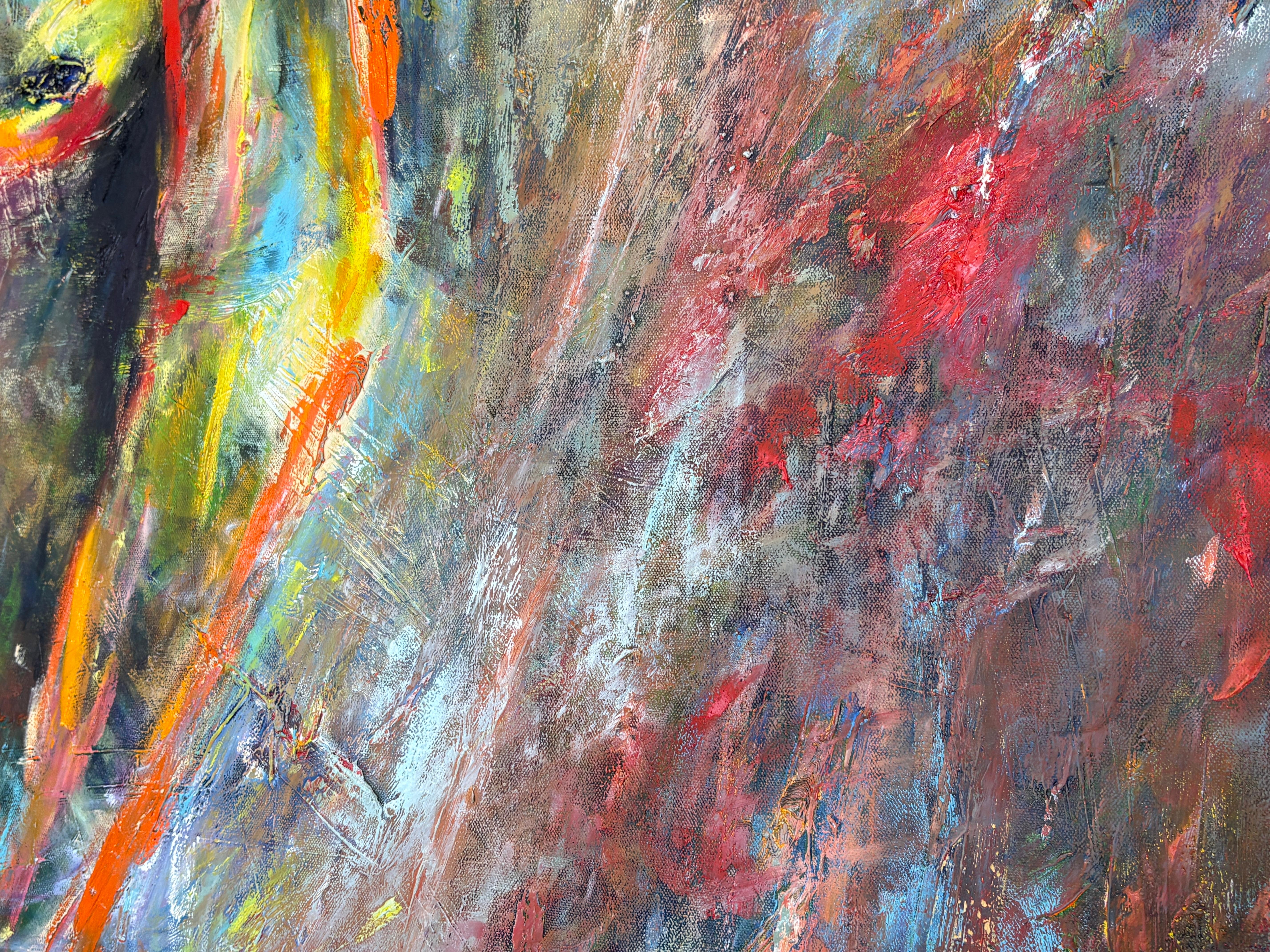In this evocative piece, "Untitled" embodies Kristy Chettle’s dynamic approach to the human form. Bold strokes of color: crimson, yellow, turquoise, and violet, merge and collide across the surface, evoking motion, energy, and emotion. Chettle’s expressive technique blurs the line between abstraction and figuration. The figure emerges from layers of texture and light, suggesting both presence and transformation. Vivid contour lines pulse with vitality, while the background dissolves into a storm of chromatic movement.