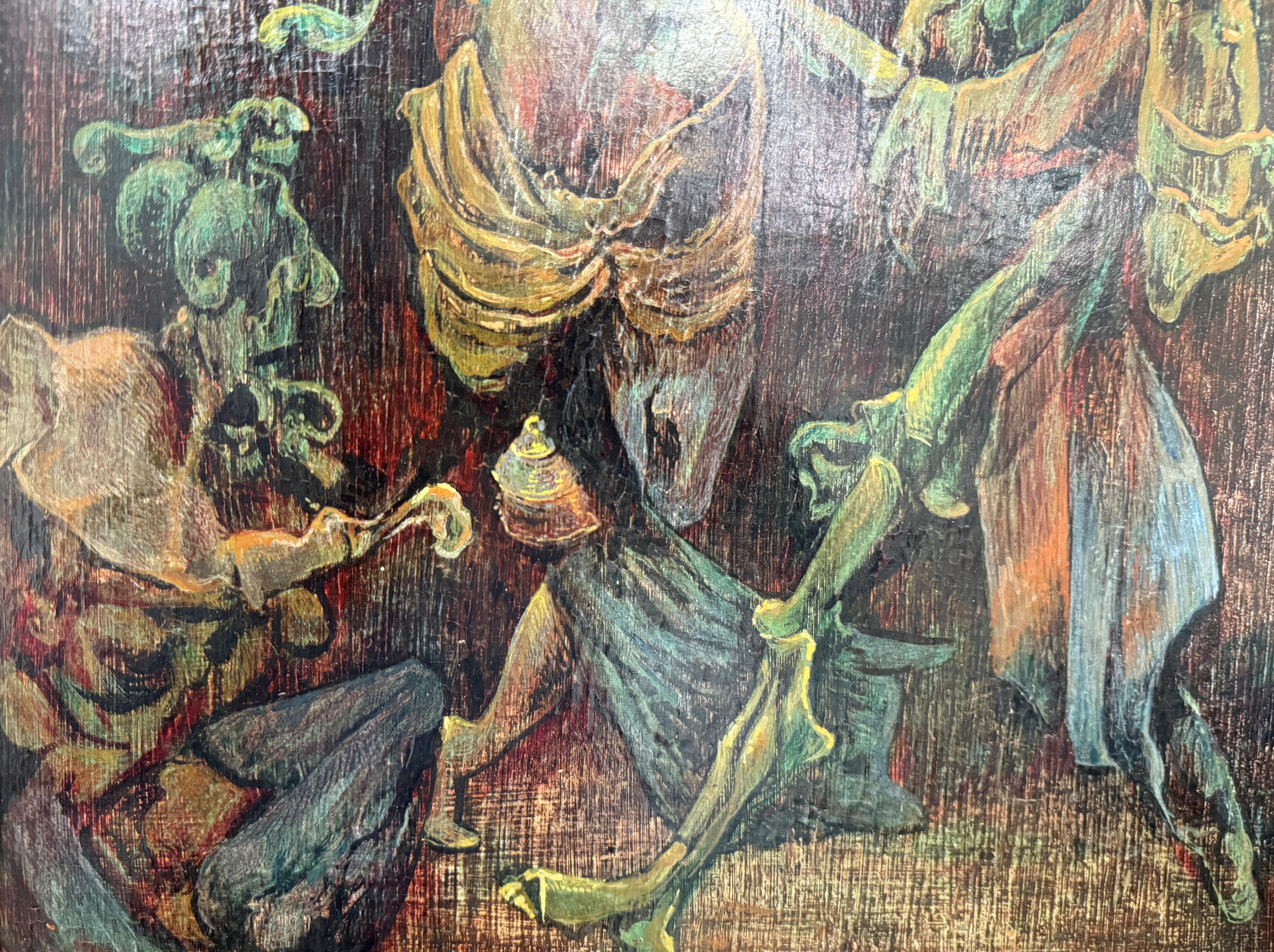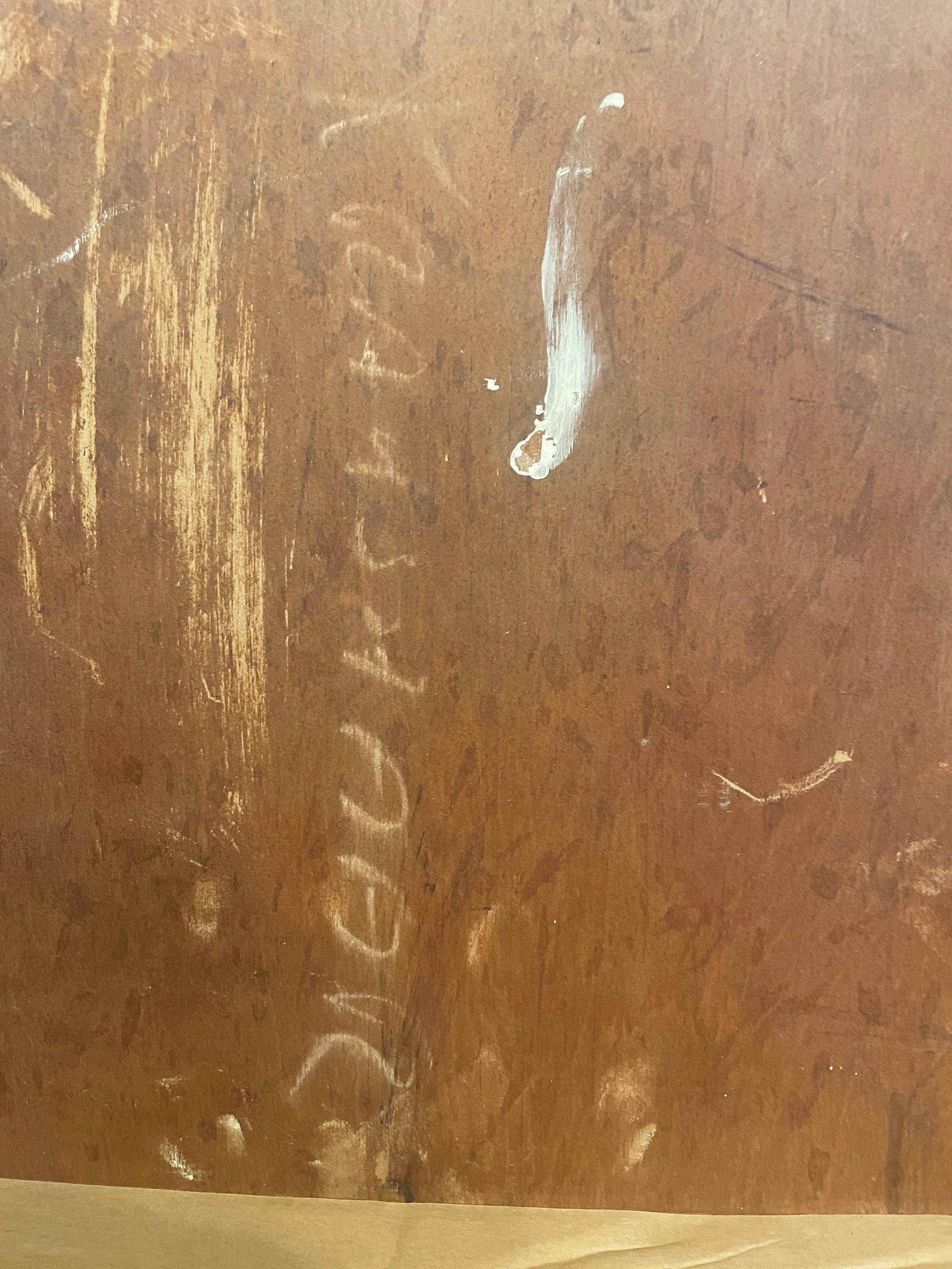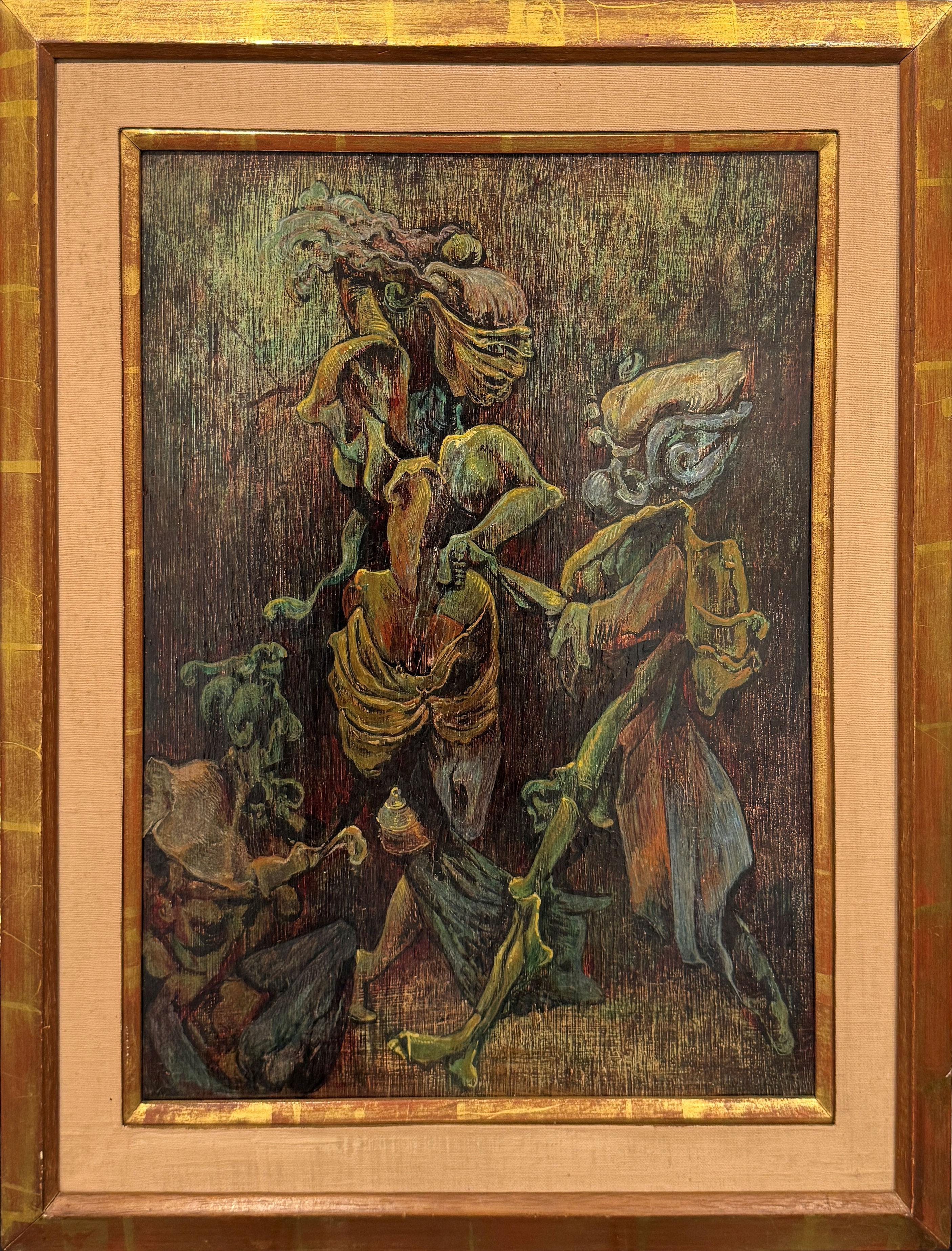 Surrealist oil on board, painted during the 1950s, in its original 1950s frame, signed in the lower right-hand corner.