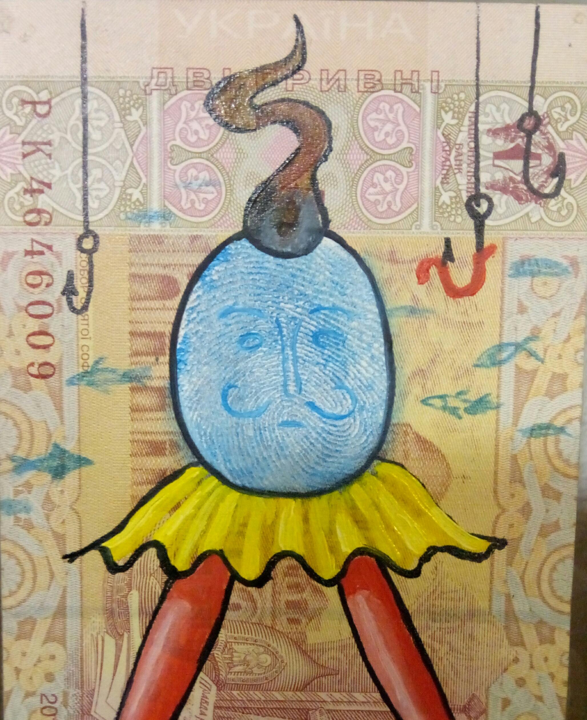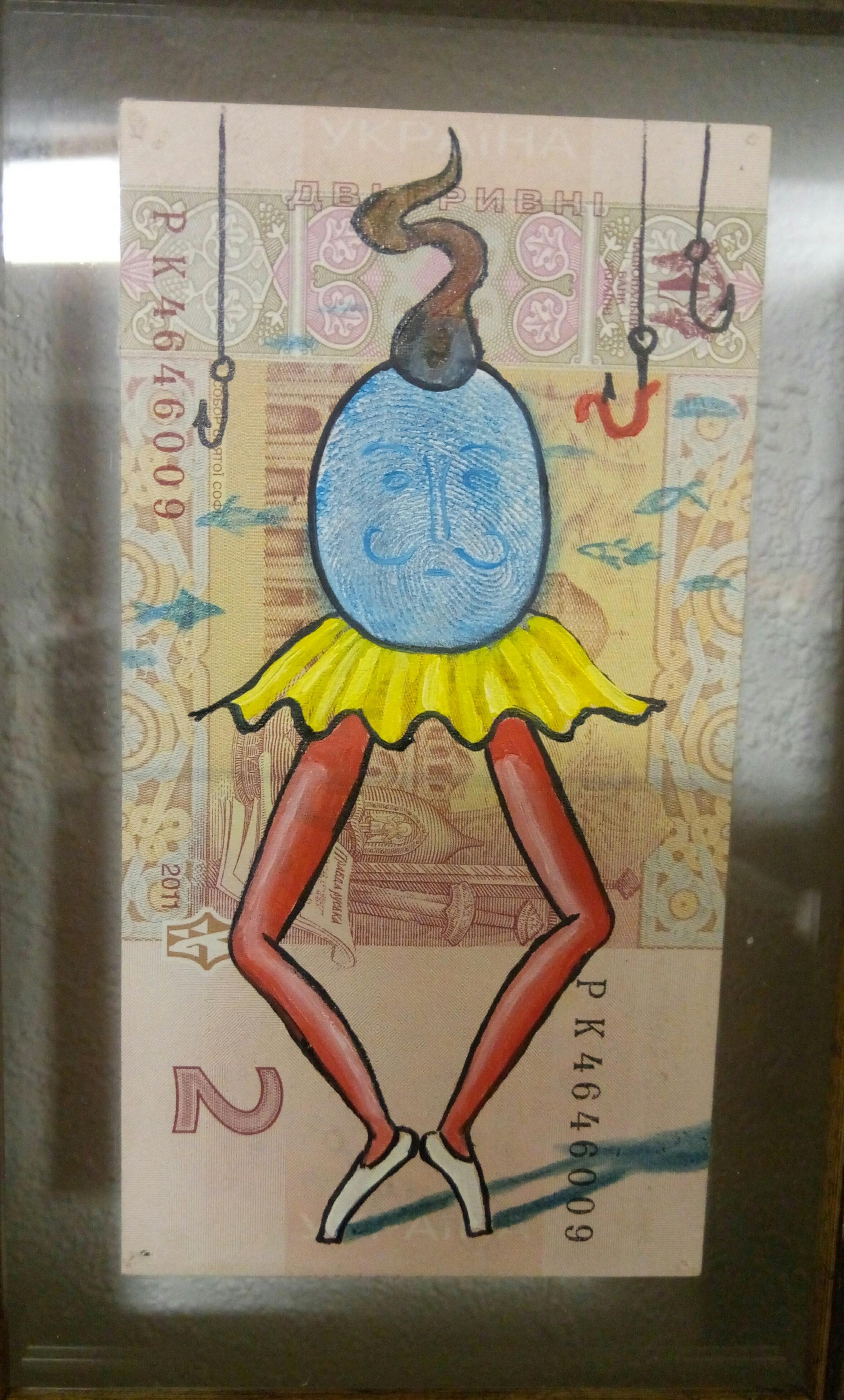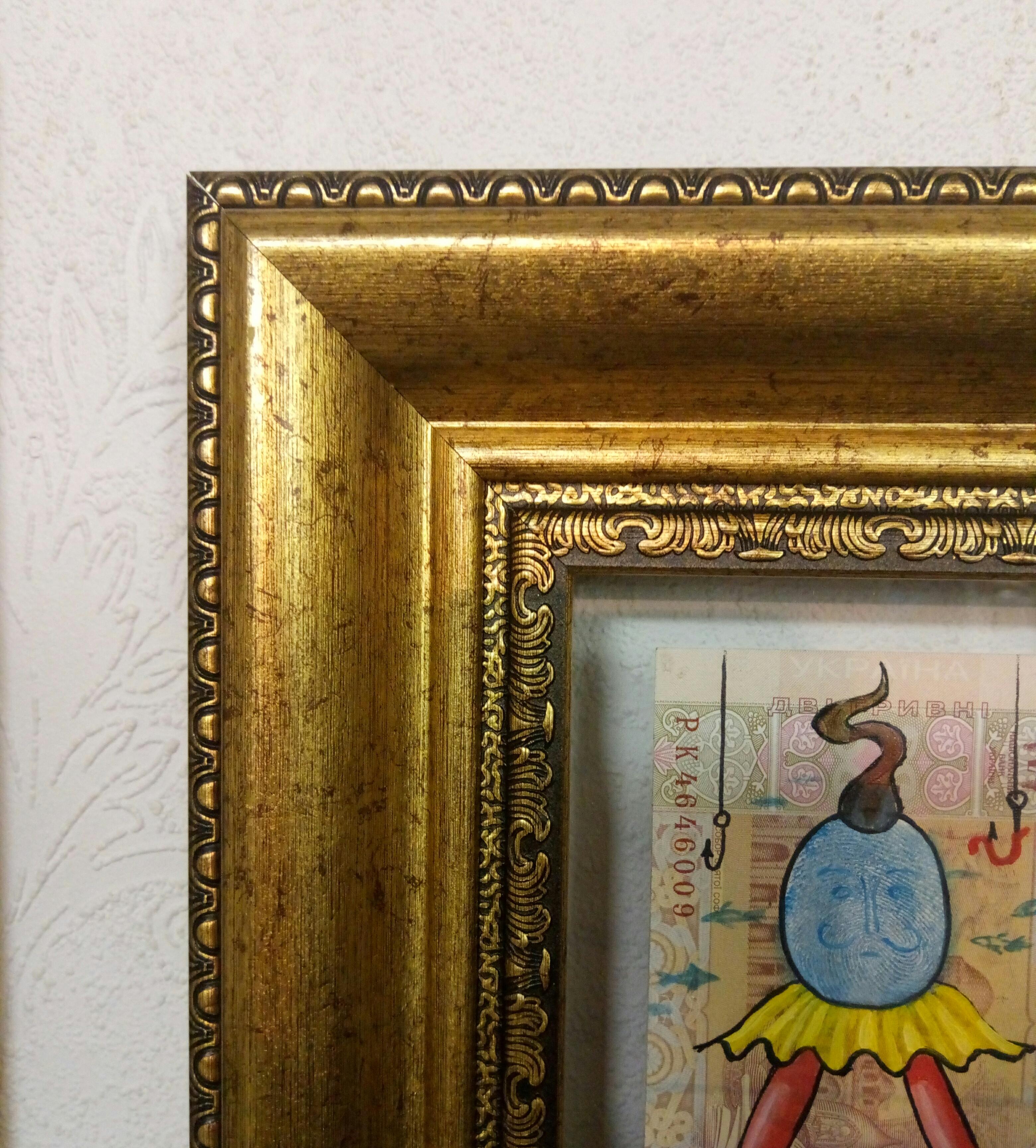 Paintings on Ukrainian banknotes, frame size 25-20 centimeters, the banknote itself is 12-6 centimeters in size, a miniature. The painting is framed in a plastic frame, the banknote is glued to plexiglass. The passport is transparent, it will look like your walls.