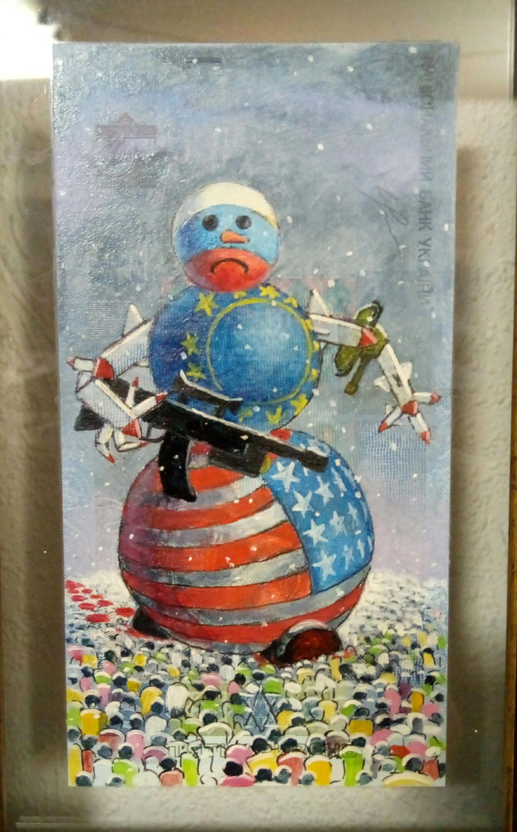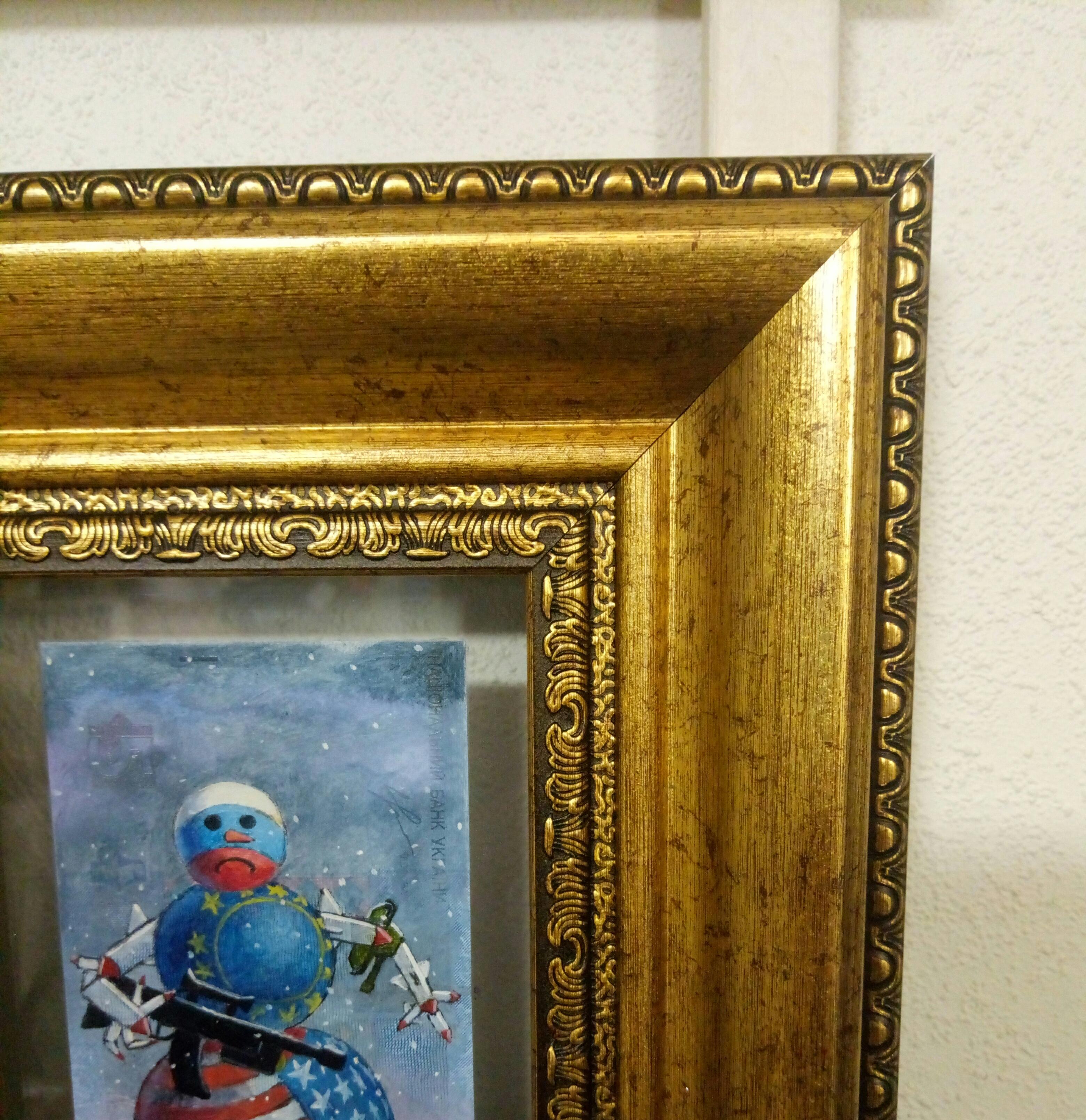 Paintings on Ukrainian banknotes, frame size 25-20 centimeters, the banknote itself is 12-6 centimeters in size, a miniature. The painting is framed in a plastic frame, the banknote is glued to plexiglass. The passport is transparent, it will look like your walls.