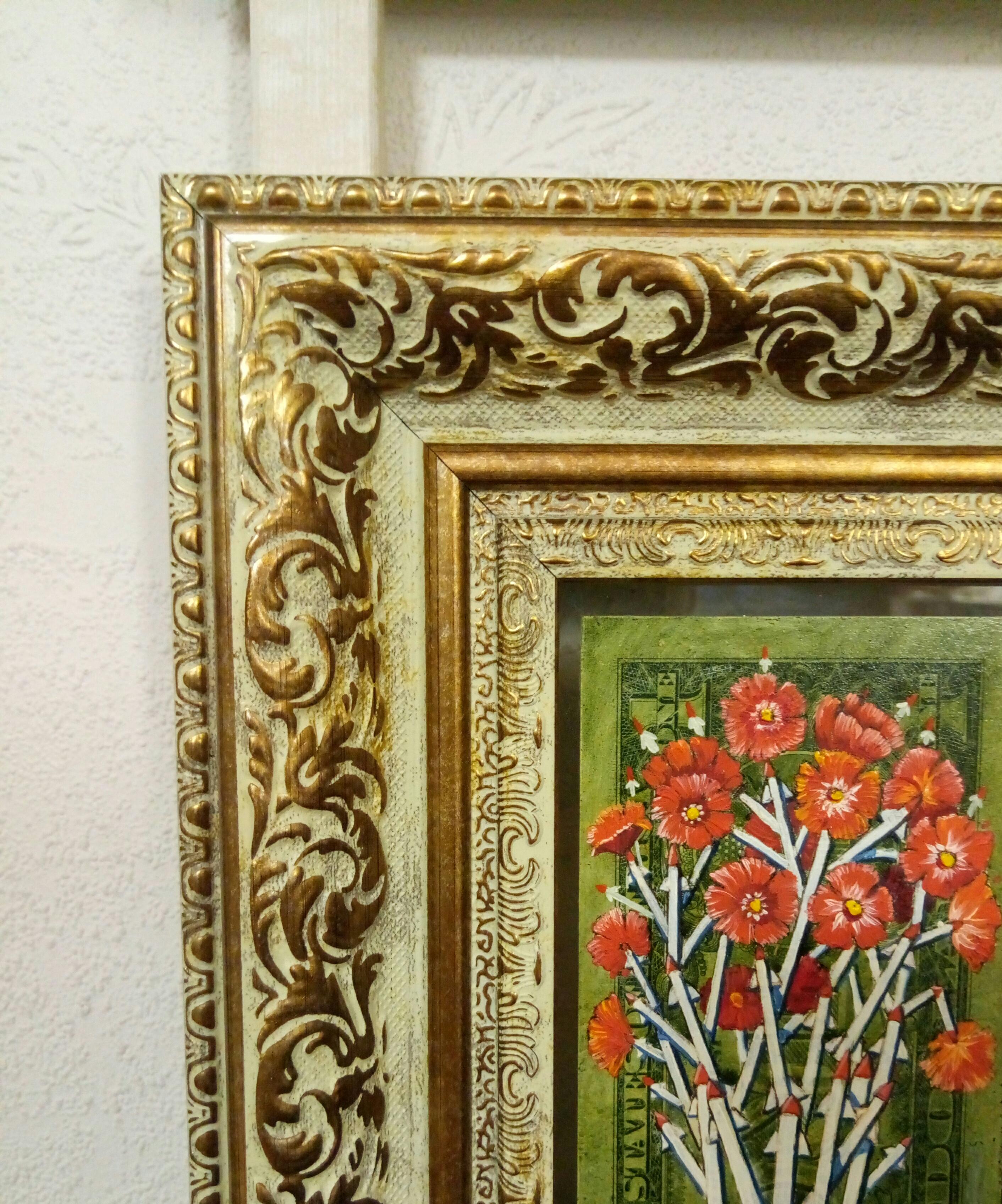 Paintings on Ukrainian banknotes, frame size 27-20 centimeters, the banknote itself is 15-7 centimeters in size, a miniature. The painting is framed in a plastic frame, the banknote is glued to plexiglass. The passport is transparent, it will look like your walls.